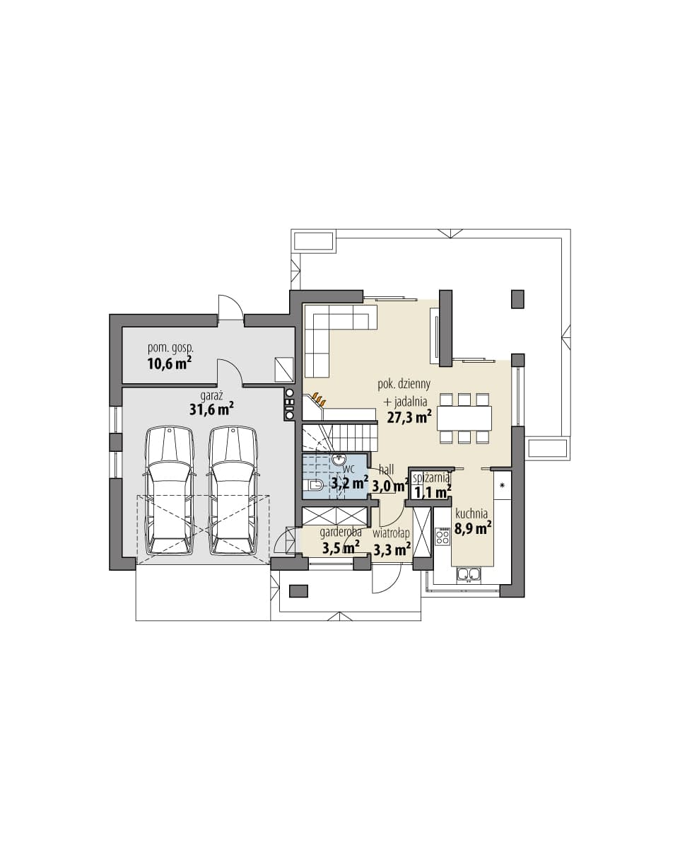 Projekt jednorodzinnego domu parterowego z poddaszem użytkowym i garażem 2-stanowiskowym, przeznaczony dla rodziny 4-osobowej. Układ funkcjonalny parteru obejmuje strefę dzienną (salon połączony z jadalnią i osobna kuchnia) oraz gospodarczą (garaż i pom. gosp.). Dodatkowe pomieszczenia na tej kondygnacji to: spiżarnia, wc, garderoba. Na poddaszu zlokalizowano strefę nocną (3 sypialnie i łazienka) oraz strych. Projekt dostępny jest w wersji bez garażu - Dawid oraz w wersji z pojedynczym garażem - Dawid II.