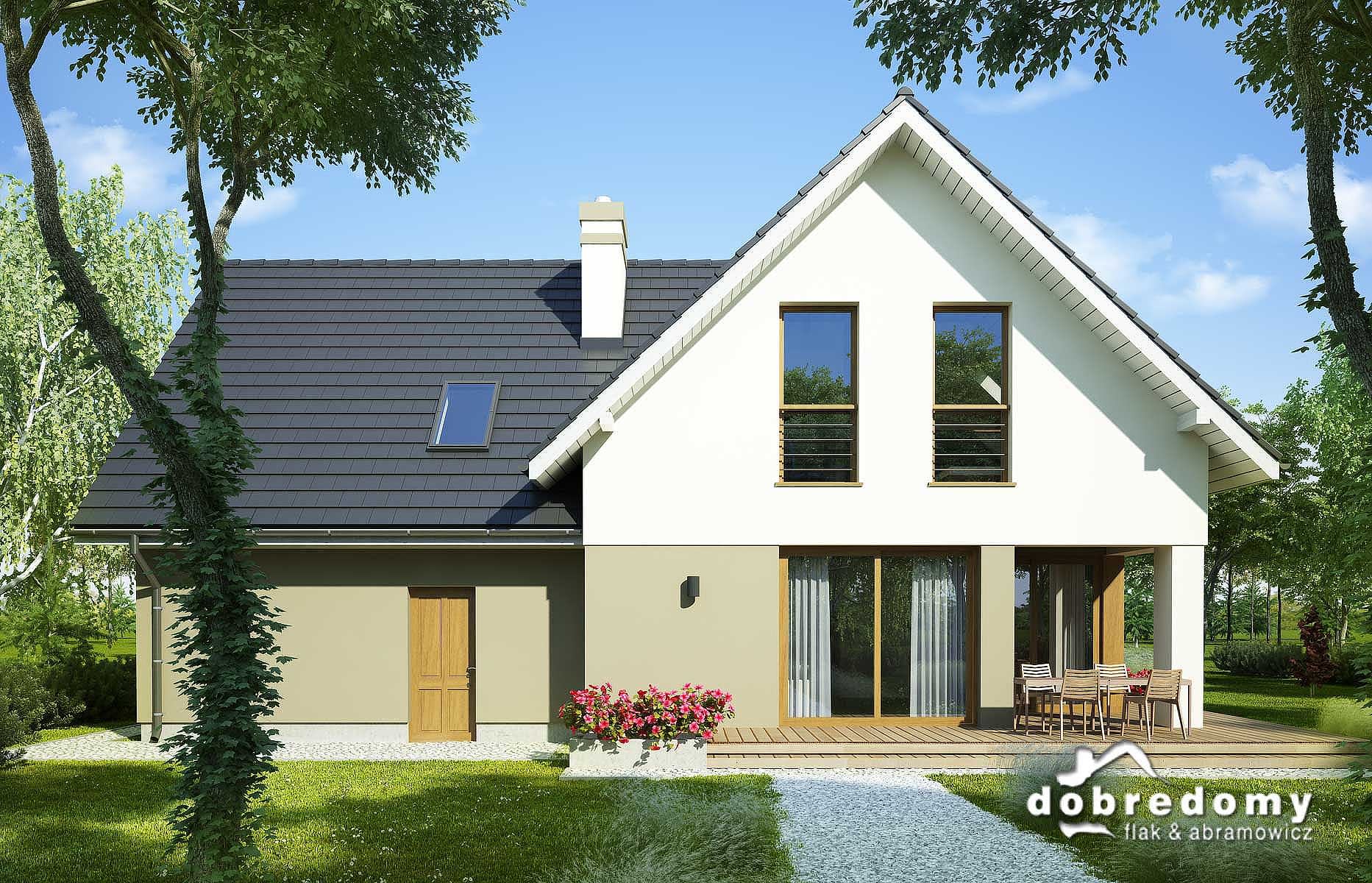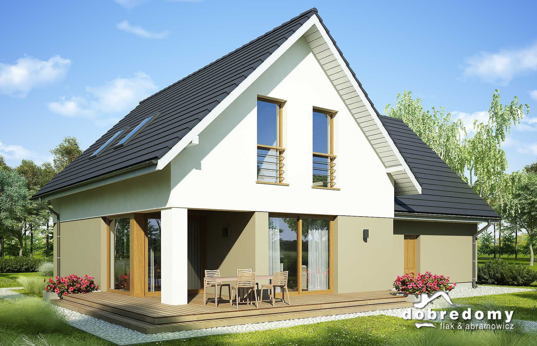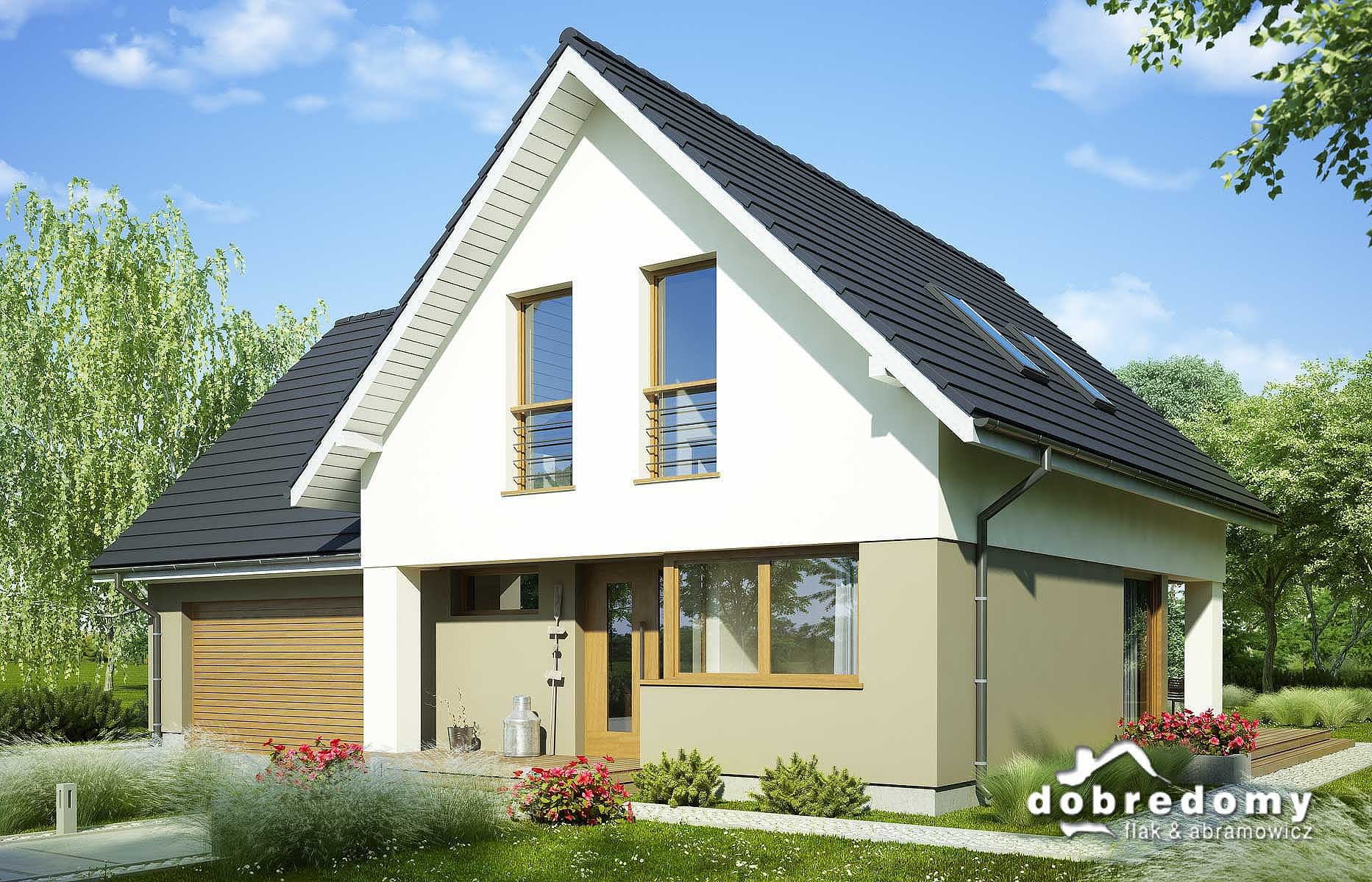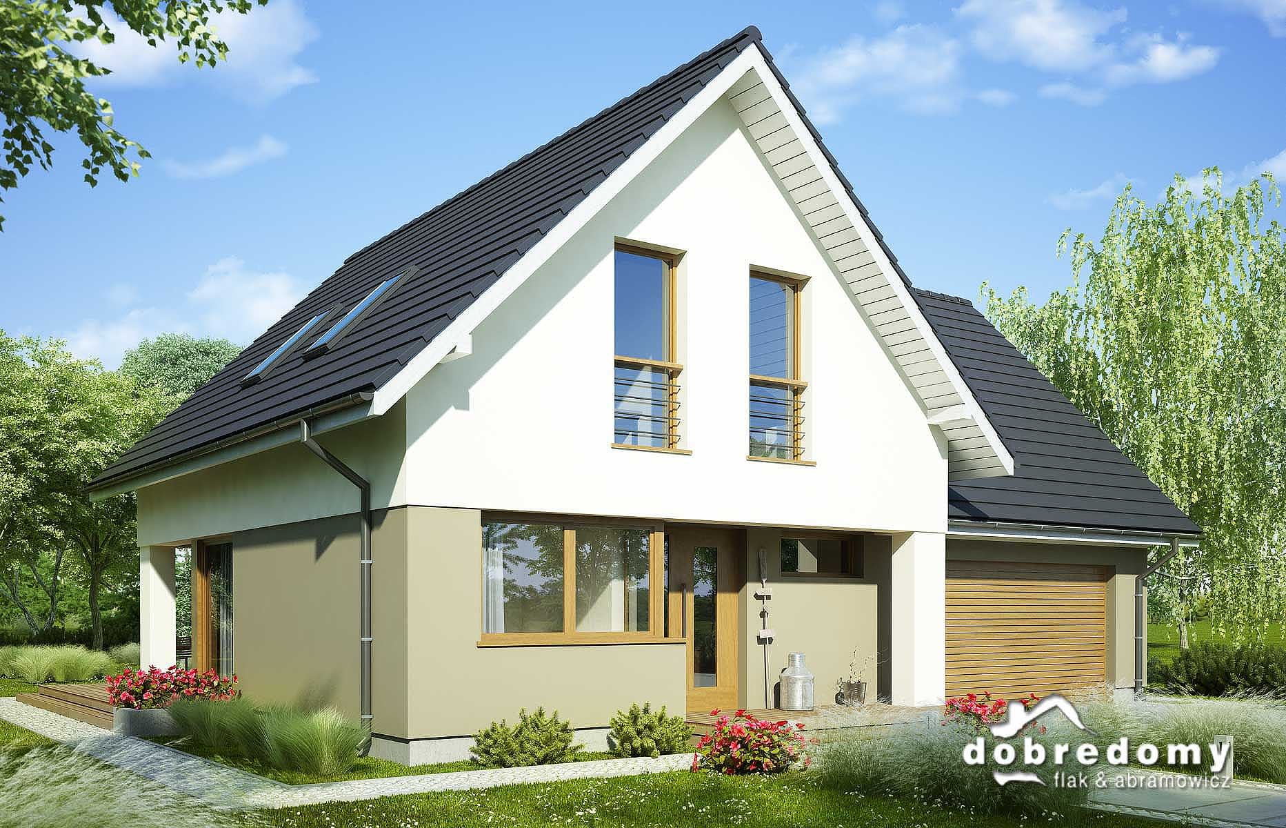 Elewacje pokryte tynkiem strukturalnym w systemie ociepleń Termo Organika. W projekcie zastosowano okna dachowe marki FAKRO. Pokrycie dachu - dachówka ceramiczna lub cementowa CREATON.