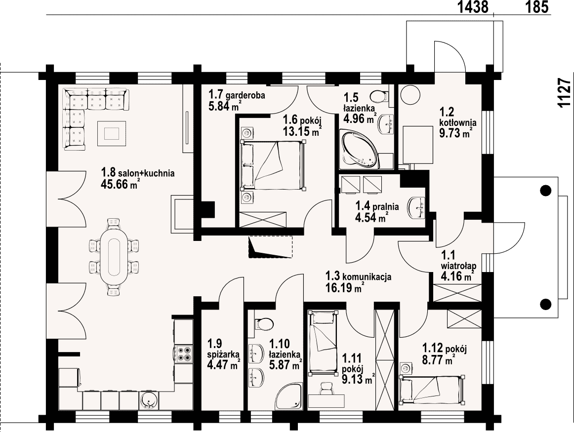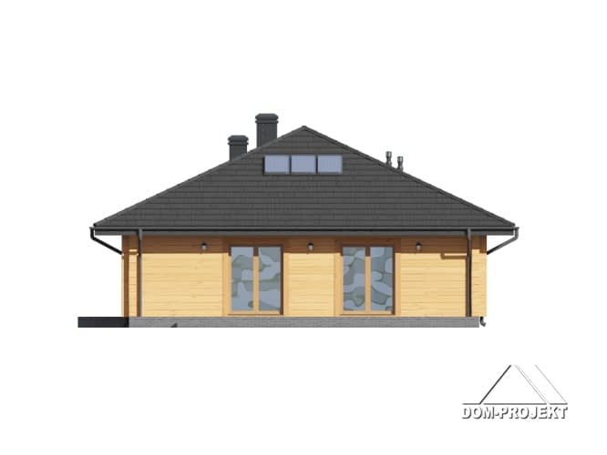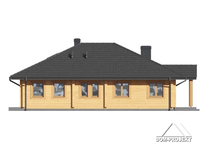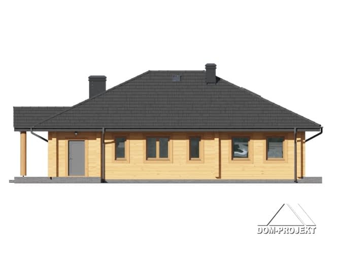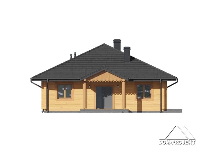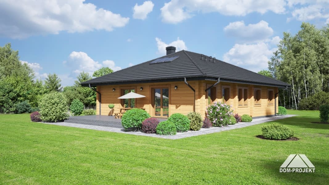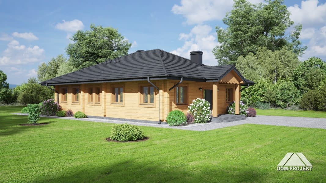 Parterowy dom z bali. Duży salon z kuchnią, kominkiem oraz wyjściami na taras. Trzy pokoje. Jeden pokój z własną łazienką oraz garderobą. Łazienka, pralnia, spiżarka, kotłownia, wiatrołap i komunikacja. Wejście na strych schodami strychowymi składanymi.Rzuty