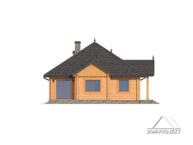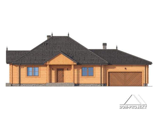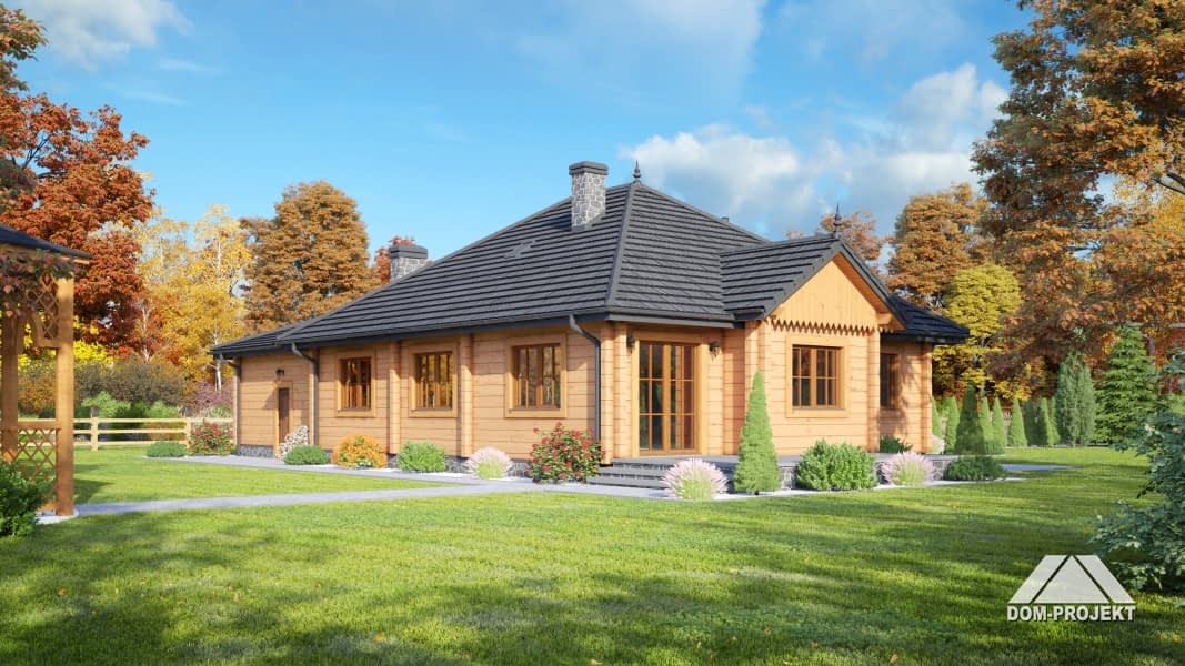 Dom parterowy z bali drewnianych. Duży salon z aneksem kuchennym, kominkiem i wyjściem na taras.Trzy pokoje, łazienka, komunikacja, wiatrołap i garderoba. Garaż na dwa samochody i kotłownia.Rzuty