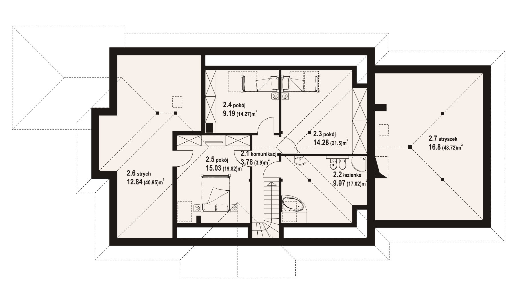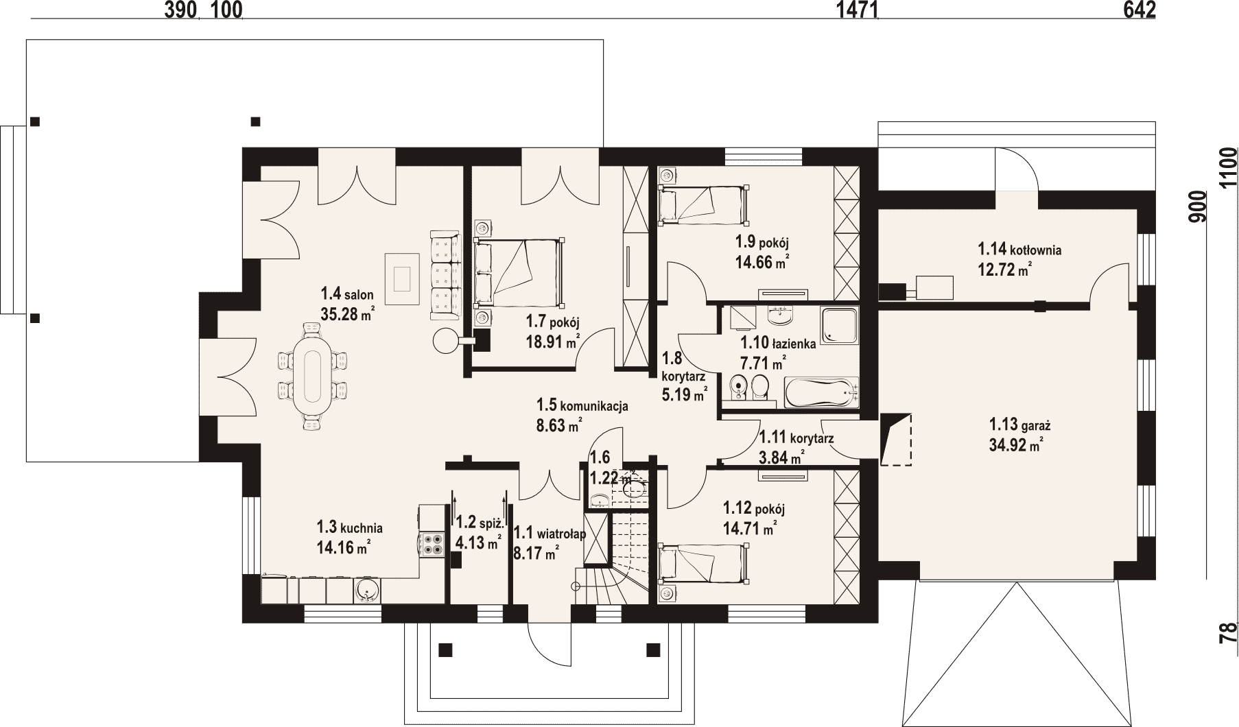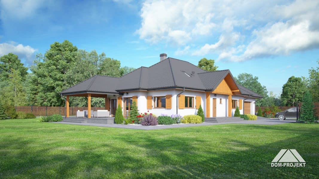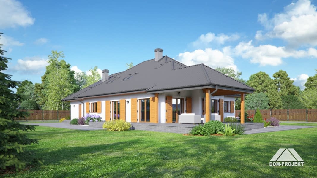 Wygodny dom z poddaszem. Duży salon z aneksem kuchennym, kominkiem i wyjściem na zadaszony taras. Trzy pokoje, łazienka, wc, spiżarka, korytarz, wiatrołap, garaż na dwa samochody i kotłownia. Na poddaszu trzy pokoje, łazienka, komunikacja i dwa strychy.Rzuty