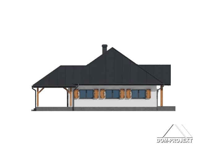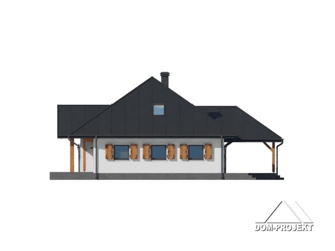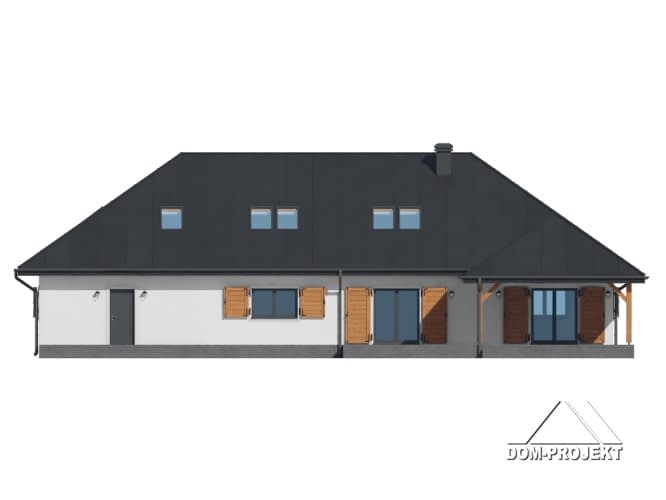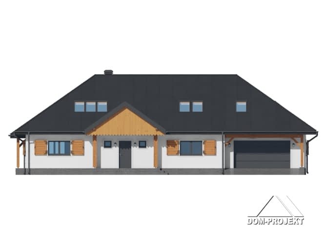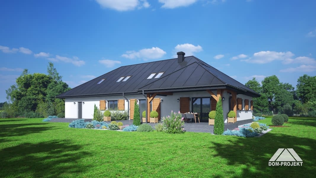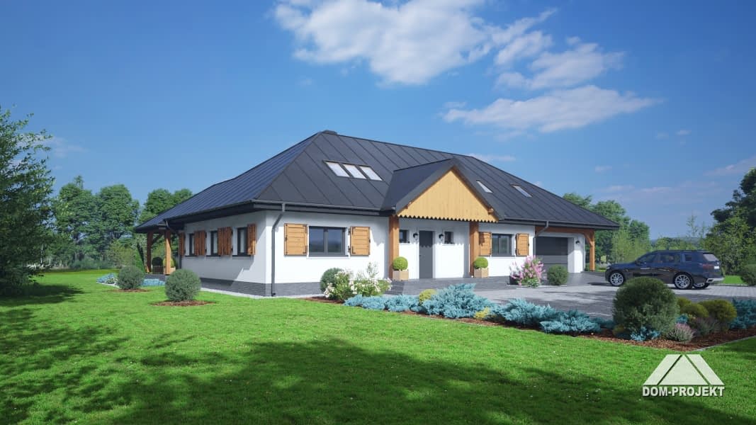 Dom w konstrukcji szkieletu drewnianego.Na parterze salon z kuchnią, kominkiem oraz wyjściem na duży, zadaszony taras. Trzy pokoje, łazienka, spiżarka, wiatrołap, wc, komunikacja, korytarz, garaż oraz kotłownia. Na poddaszu trzy pokoje, łazienka, komunikacja, dwa strychy.Rzuty