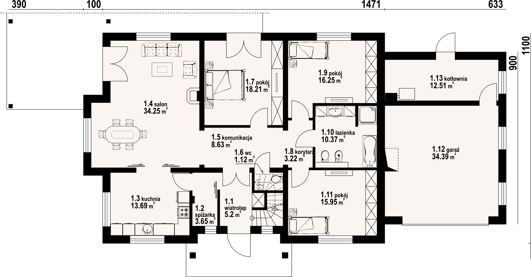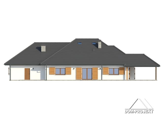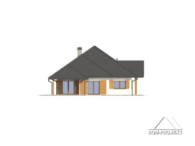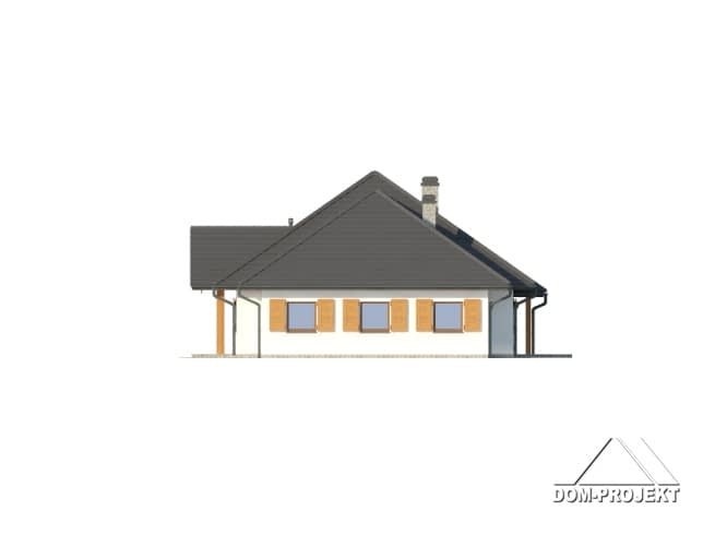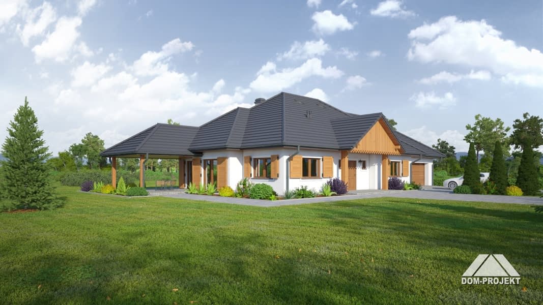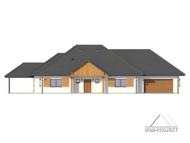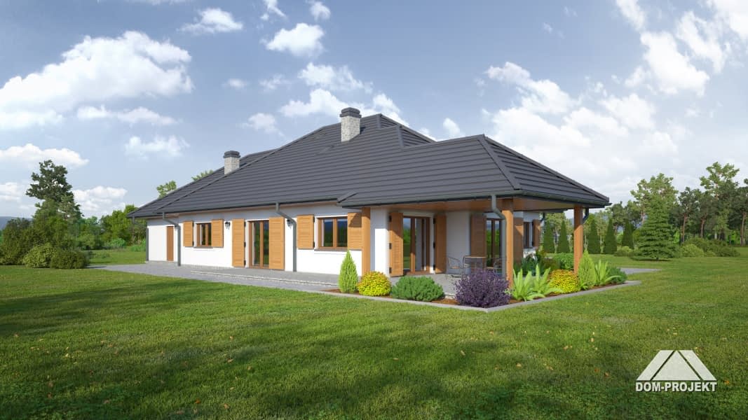 Dom parterowy z garażem na dwa samochody i kotłownią. Duży salon z kominkiem, wyjściem na zadaszony taras i szerokim przejściem do dużej i wygodnej kuchni. Obok kuchni spiżarka. Trzy wygodne pokoje, duża łazienka, komunikacja, wc, wiatrołap, garaż i kotłownia. Schody na poddasze. Na poddaszu garderoba i strych. W przyszłości poddasze można łatwo wykorzystać dla celów mieszkalnych.Rzuty