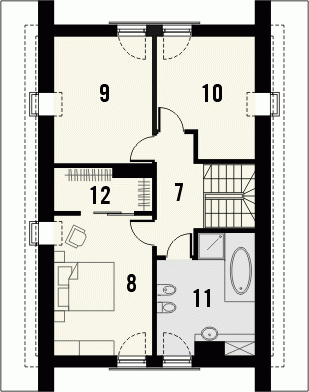 Projekt domu Decorum ma charakterystyczne szczyty od frontu i ogrodu. Znalazły się w nich drzwi balkonowe, które doskonale doświetlają pomieszczenia parteru i poddasza. Za klasyczny wystrój elewacji odpowiadają gzymsy nad oknami, opaski oraz boniowane pola przy wejściu i oknie tarasowym. Dom będzie tani w realizacji i ekonomiczny w późniejszym utrzymaniu. Efekt ten uzyskano dzięki prostej konstrukcji i kompaktowej bryle przykrytej dachem dwuspadowym. Przeważającą część parteru zajmuje pokój dzienny z widocznymi schodami, połączony w jedno wnętrze z kuchnią. Od frontu ulokowano dodatkowy pokój, wc i pomieszczenie gospodarcze. Poddasze mieści trzy sypialnie, każda z oknem balkonowym i połaciowym, garderobę i łazienkę.Rzuty