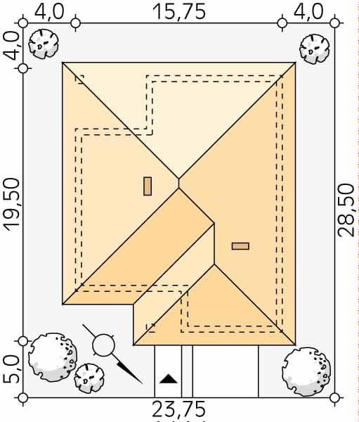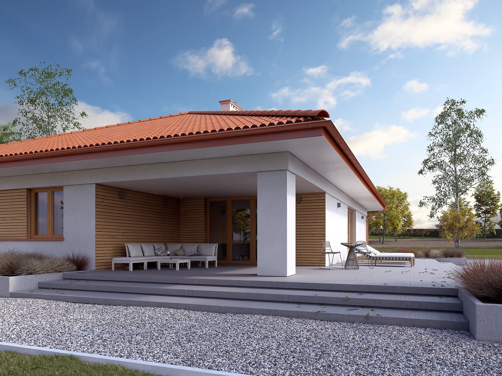 Decyma 12 to projekt nowoczesnego domu dla 5-osobowej rodziny. Wnętrze domu jest niezwykle funkcjonalne i wygodne w użytkowaniu. Wydzielono strefę dzienną i nocną, które znajdują się na jednym poziomie. W części dziennej dominuje otwarta przestrzeń salonu. Zaprojektowano garaż dwustanowiskowy z miejscem na rowery. Od strony południowej znajduje się zadaszony taras. Bryła budynku przykryta dachem wielospadowym, zaś elewacje wykończone na fragmentach deską elewacyjną i płytkami ceramicznymi co nadaje wyglądu nowoczesnego i eleganckiego.Konstrukcja