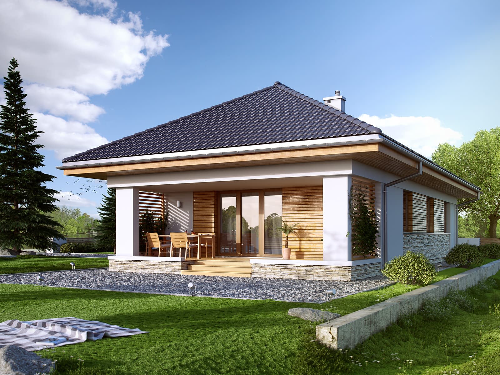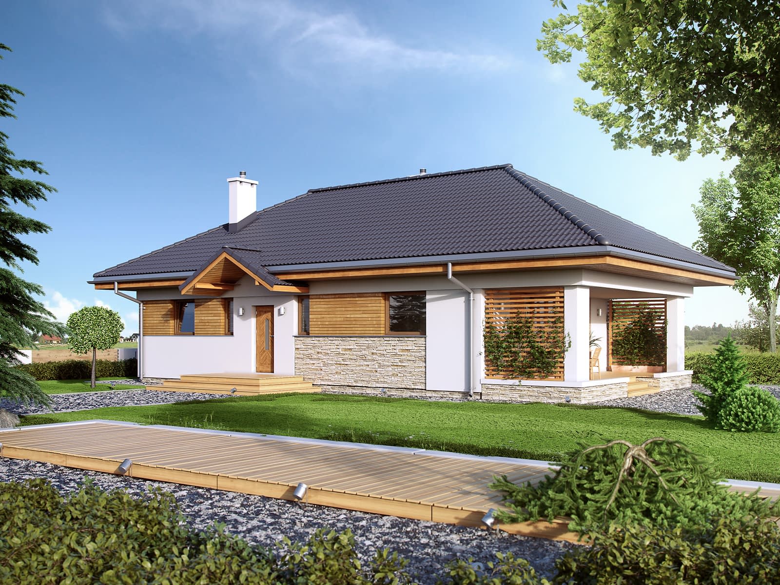 Projekt jest dedykowany zwolennikom technologii murowanej. W domu zaprojektowano 2 sypialnie i 1 łazienkę. Kuchnia otwarta na część dzienną zapewni stały kontakt z resztą domowników podczas codziennych czynności. Program funkcjonalny domu został wzbogacony o spiżarnię i WC. Prezentowany projekt idealnie nadaje się na wąską lub płytką działkę. Dom z pewnością spodoba się inwestorom gustującym w nowoczesnym stylu. Jest to projekt energooszczędny, zaprojektowany z myślą o inwestorach, którzy szczególną wagę poświęcają kosztom eksploatacji i racjonalnego wykorzystywania energii.Konstrukcja