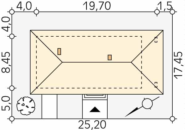 - Minimalne wymiary działki17.45 x 25.2m