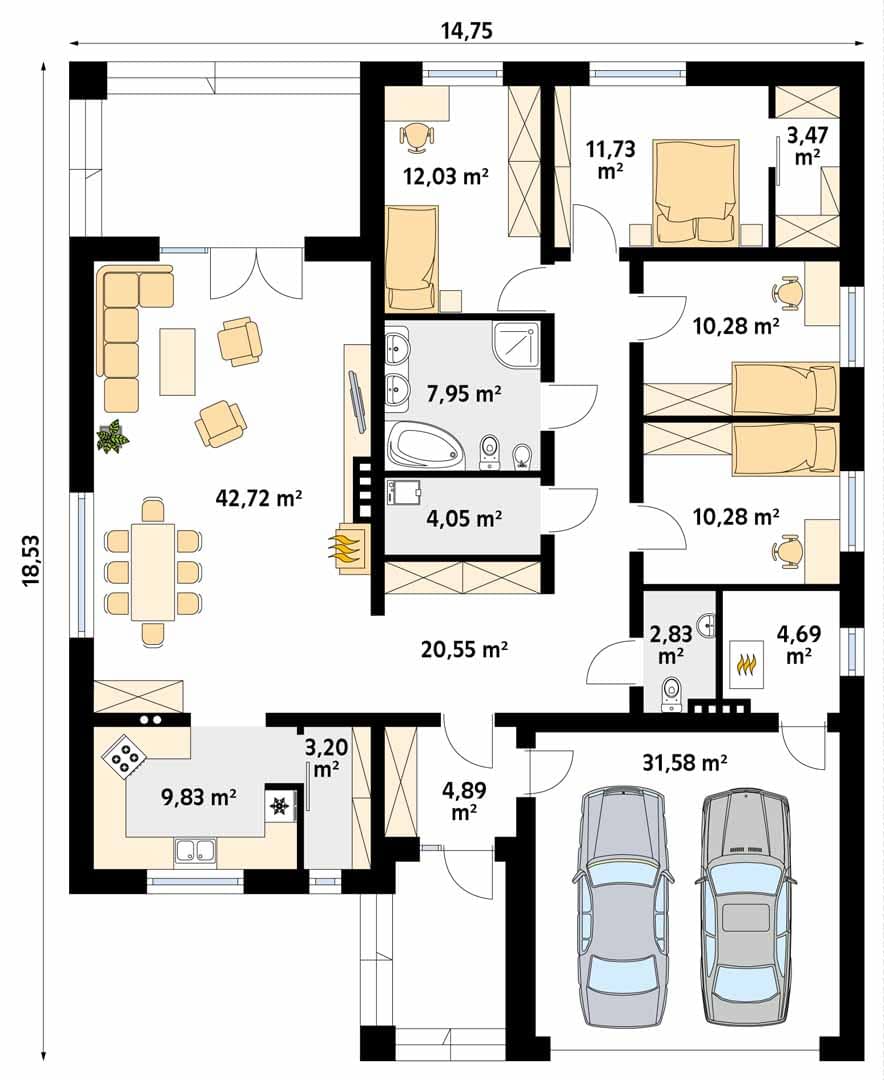- Szerokość domu14.75 m