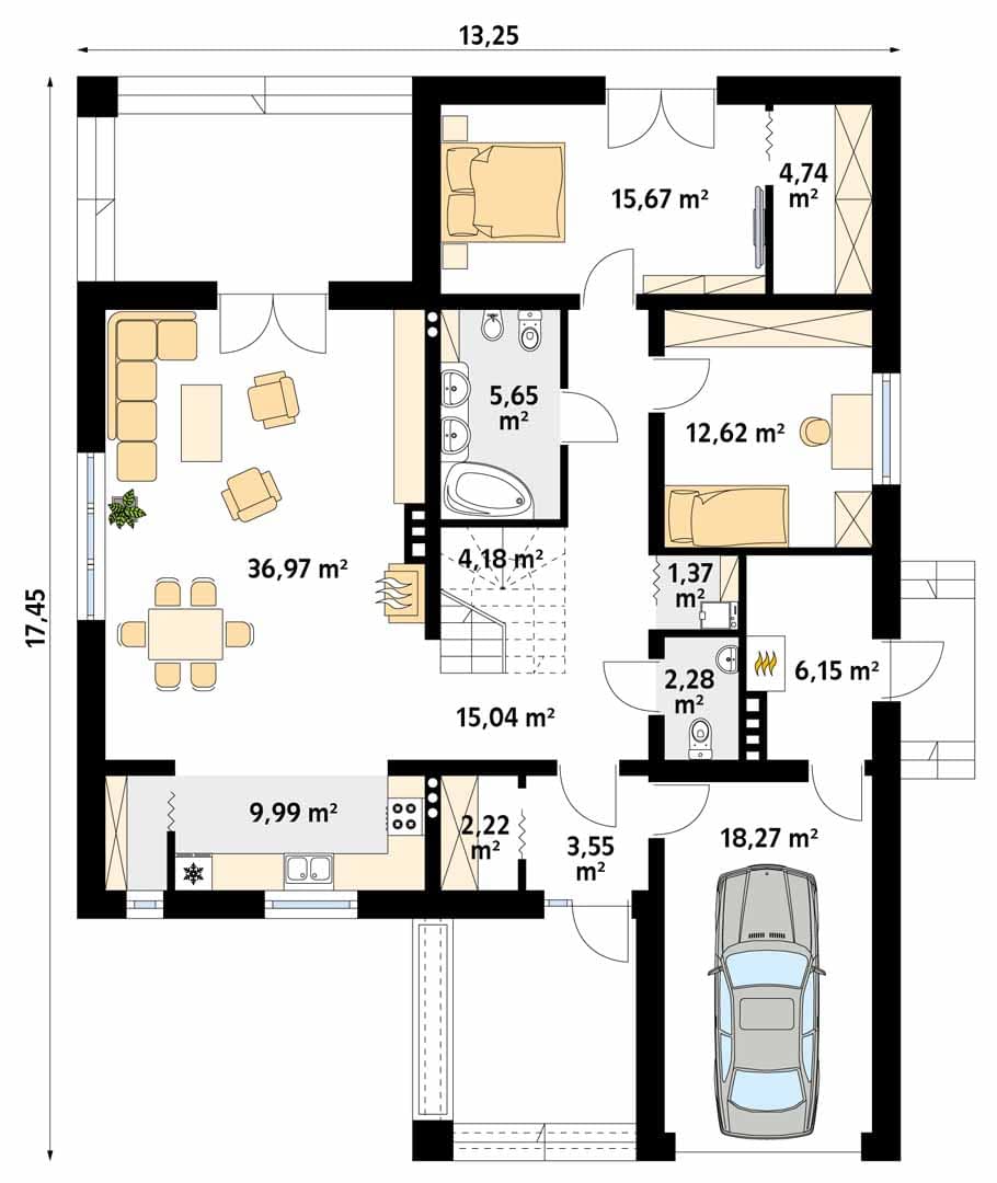 - Szerokość domu13.25 m