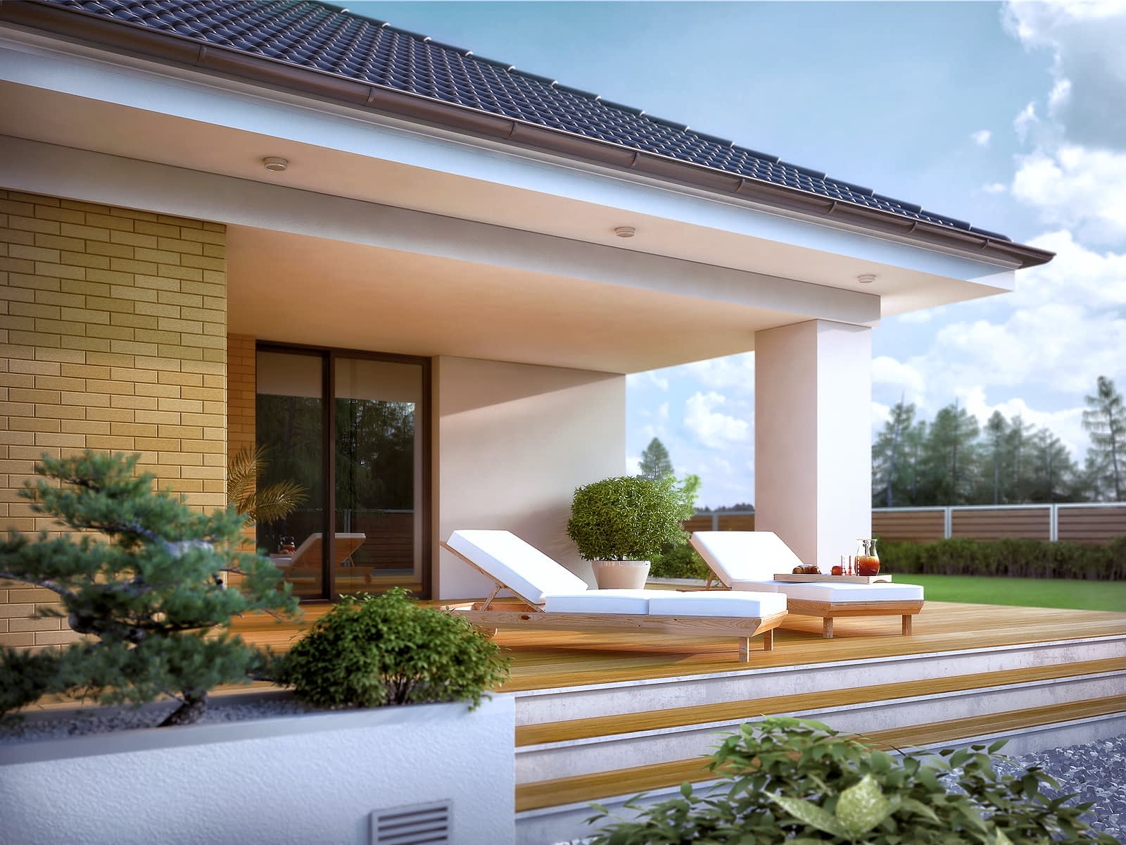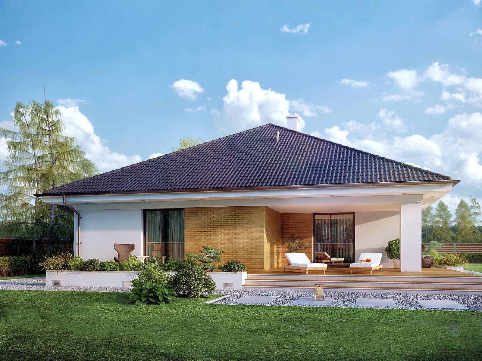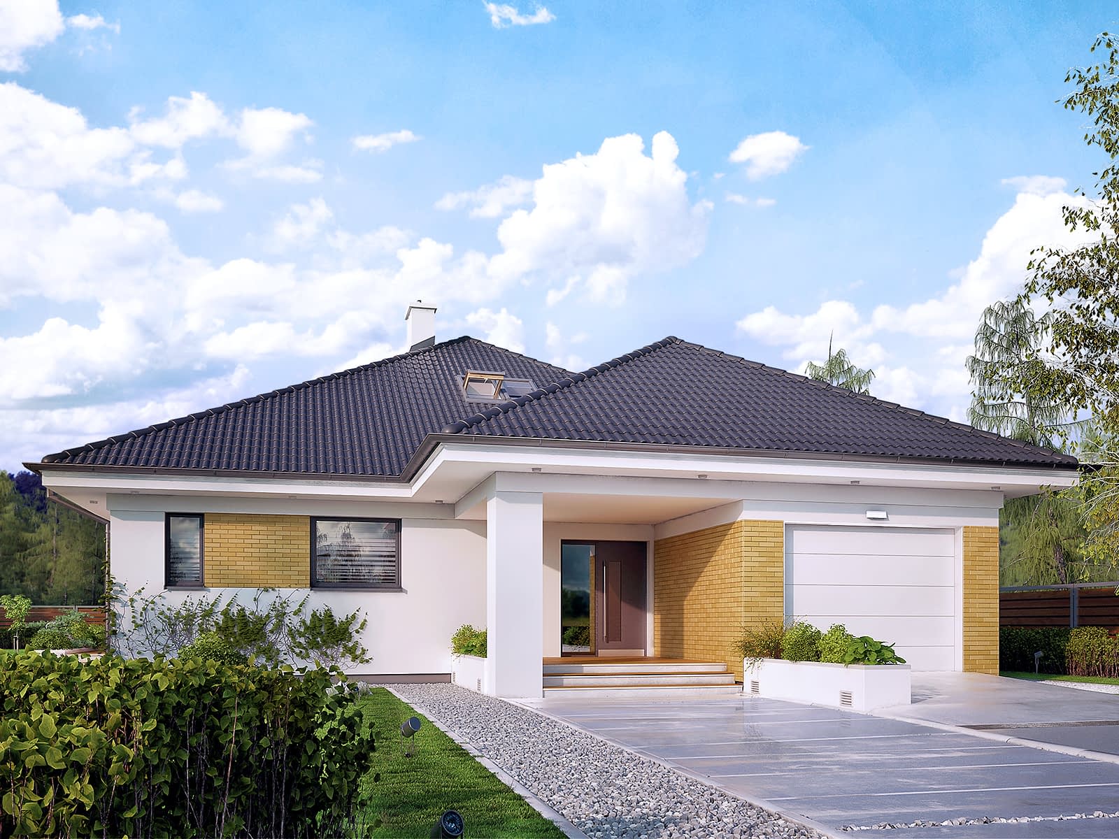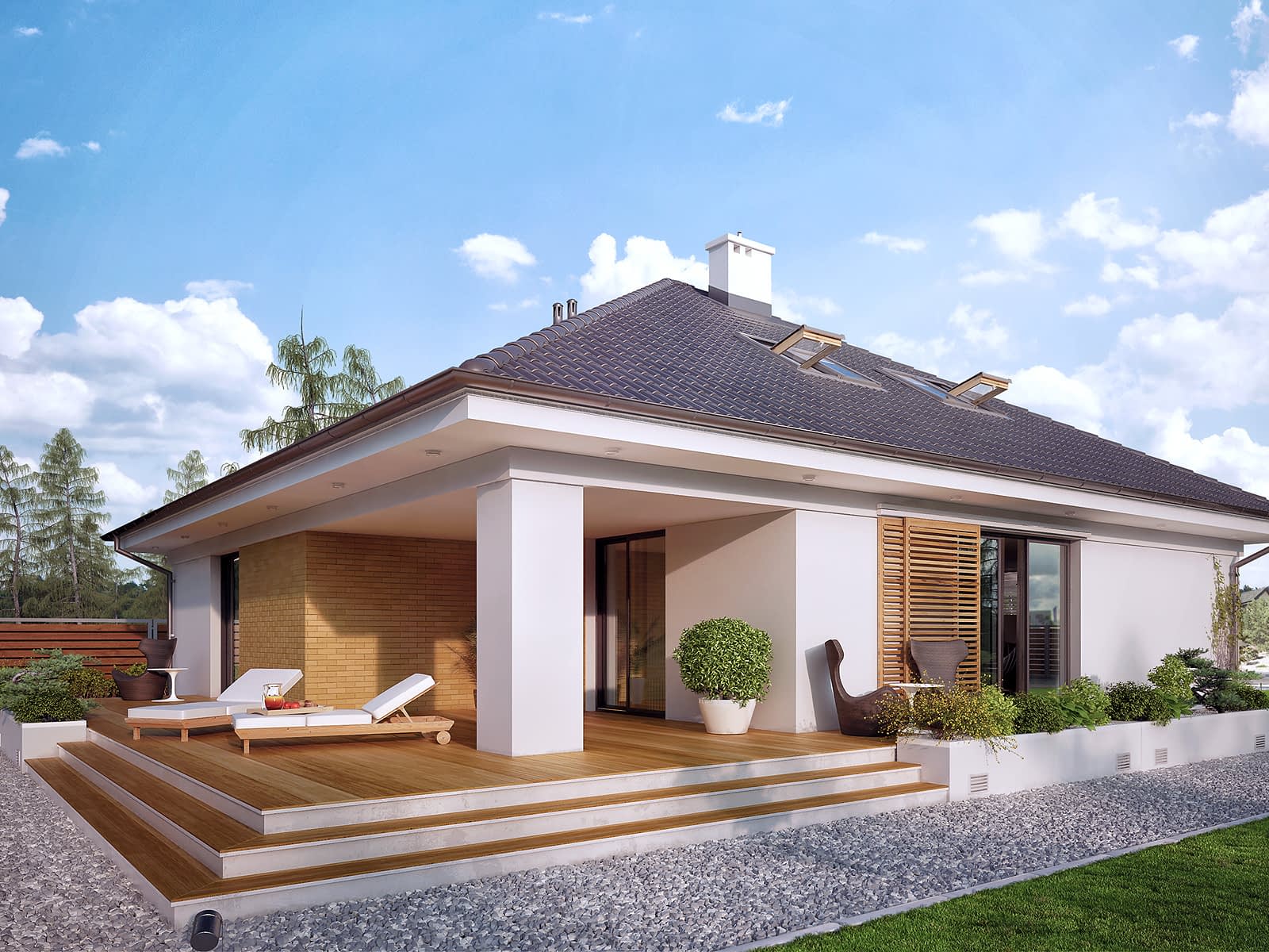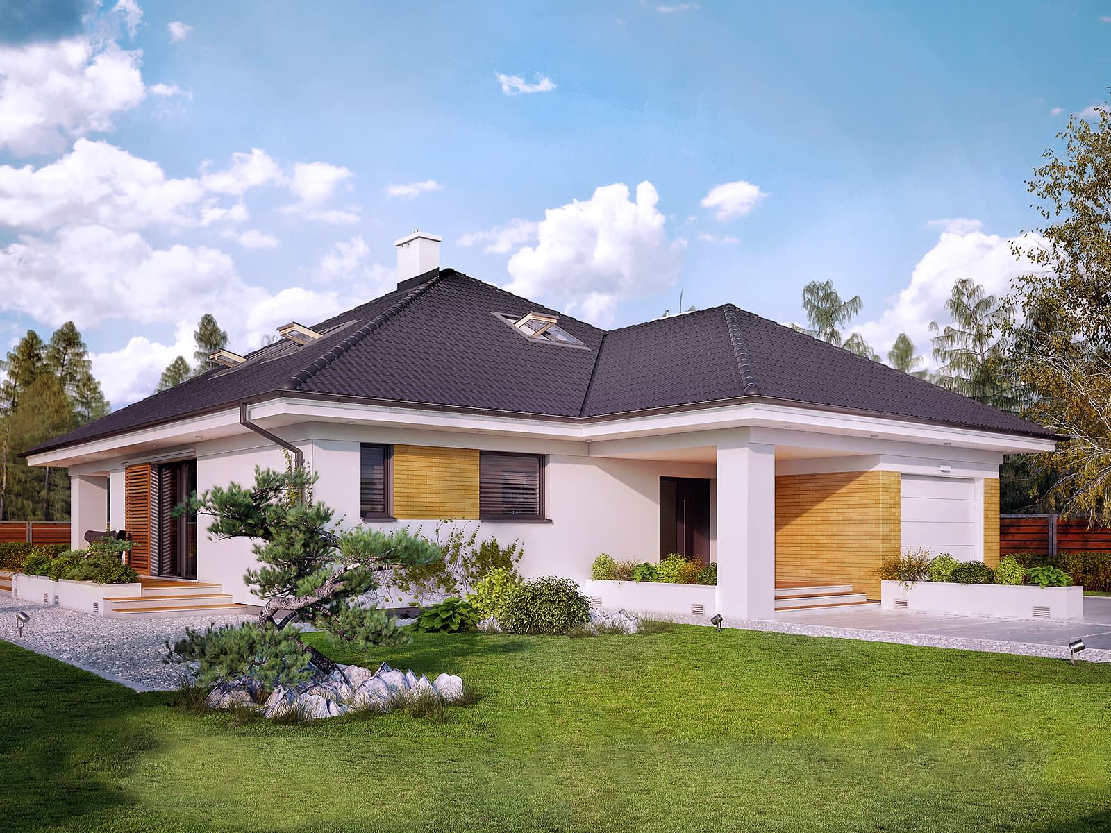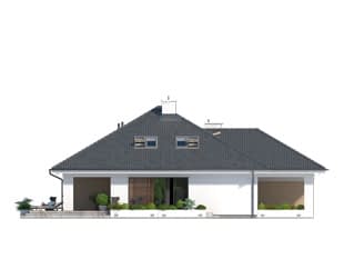 Jednorodzinny budynek mieszkalny, parterowy z użytkowym poddaszem, niepodpiwniczony, przeznaczony dla 4 - 5-osobowej rodziny. W części dziennej przewidziano salon z kominkiem oraz kuchnię z jadalnią. W części nocnej parteru - dwie sypialnie z łazienką, zaś w gospodarczej garaż i kotłownię. Na poddaszu zaprojektowano dwie duże sypialnie i łazienkę. Elewacje budynku są utrzymane w nowoczesnej stylistyce. Rozległe tarasy harmonijnie łączą wnętrza domu z ogrodem.Konstrukcja