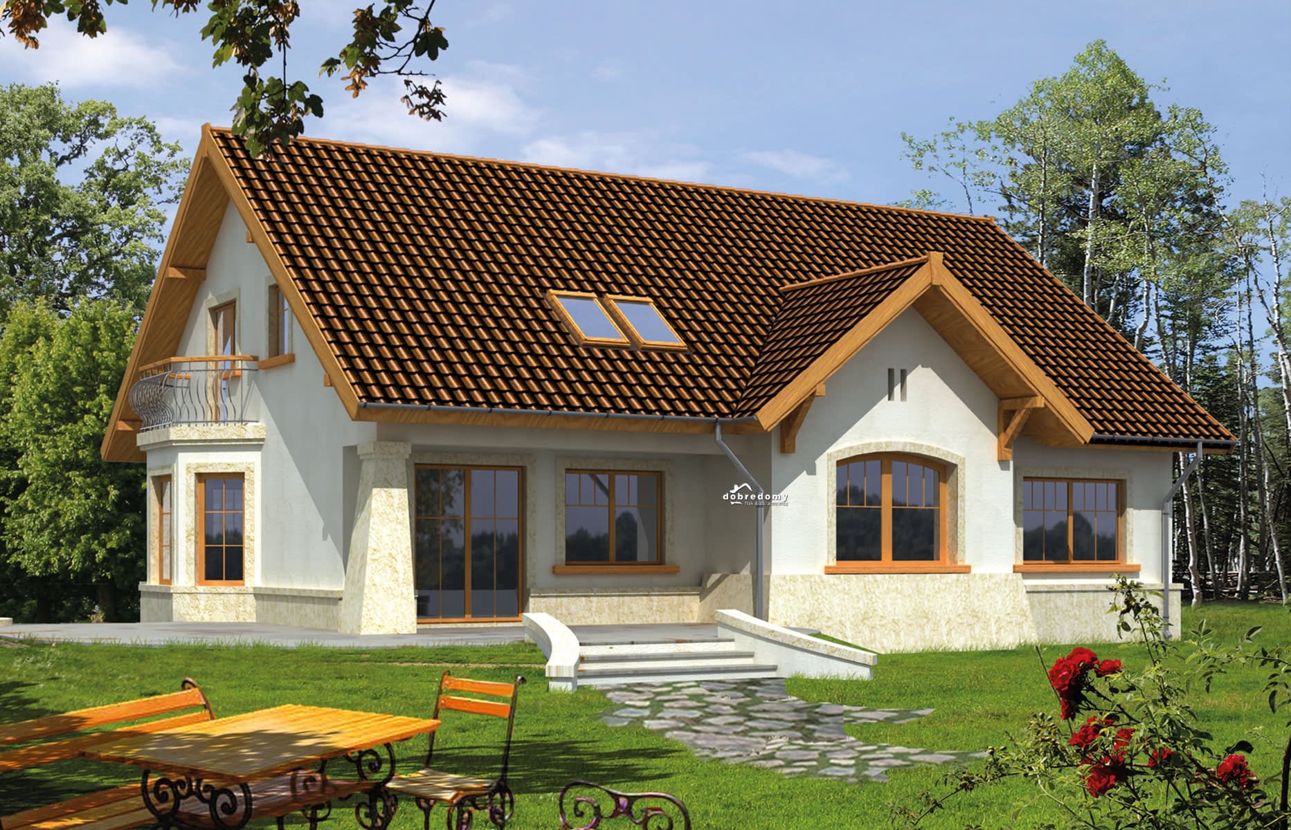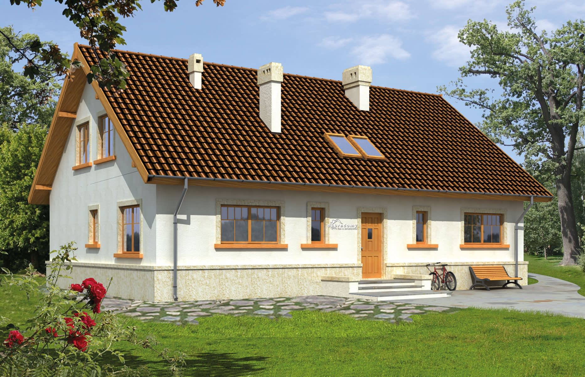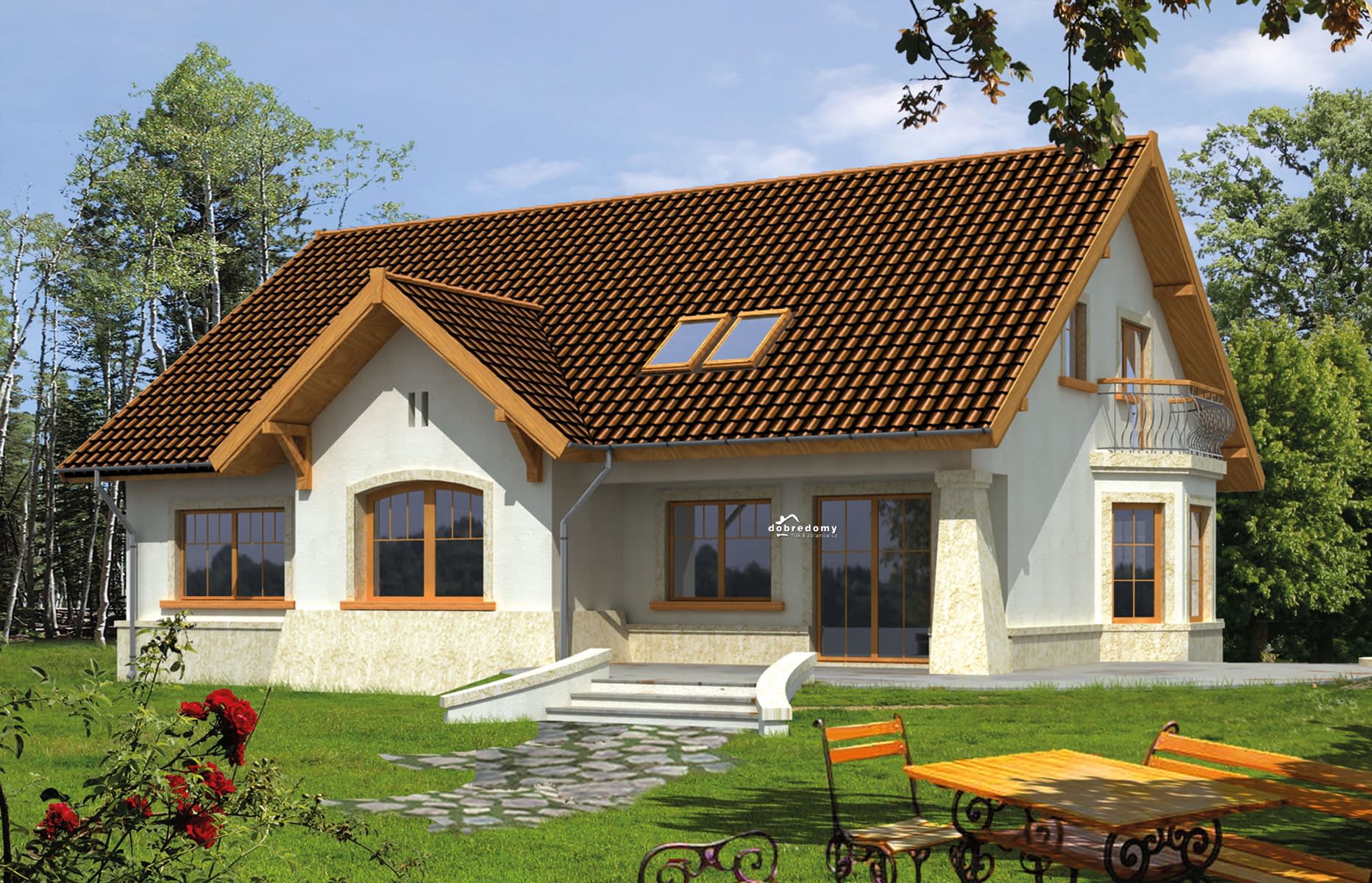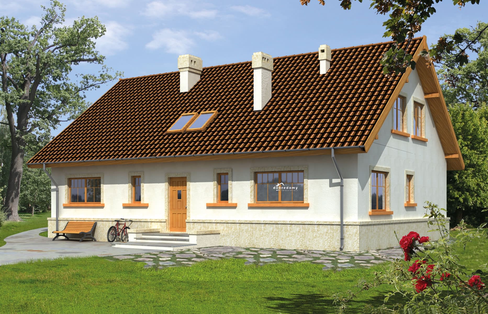 Elewacje pokryte tynkiem strukturalnym w systemie ociepleń Termo Organika. Pokrycie dachu - dachówka ceramiczna lub cementowa CREATON.