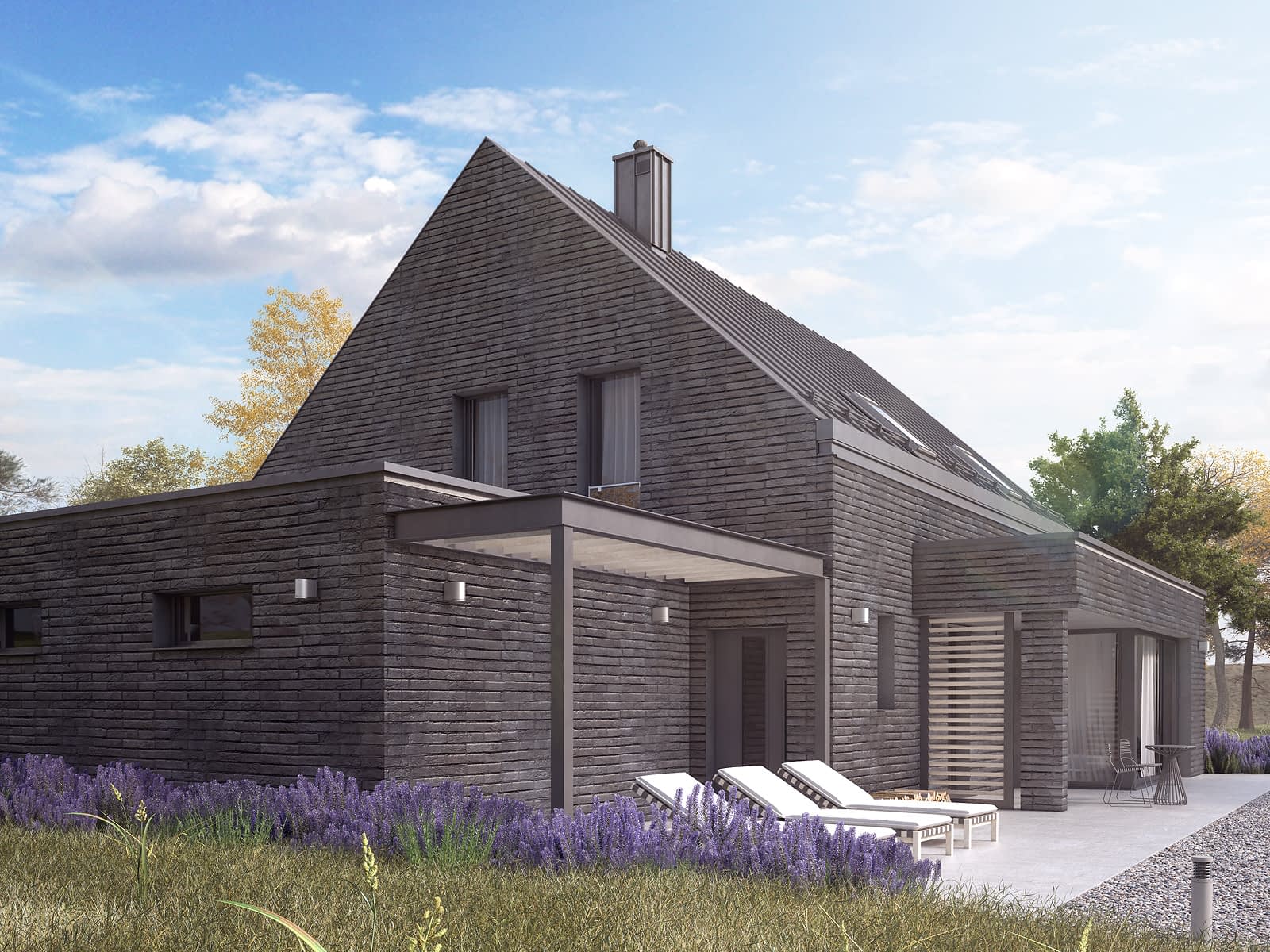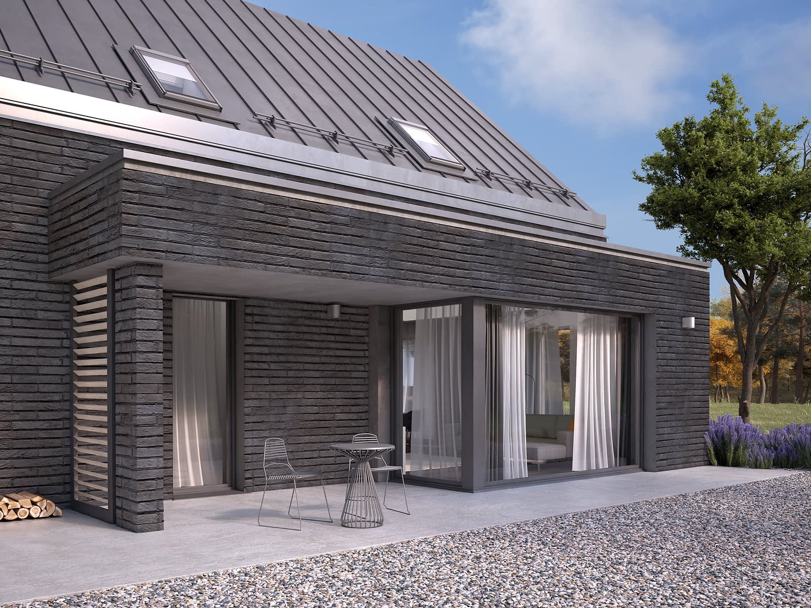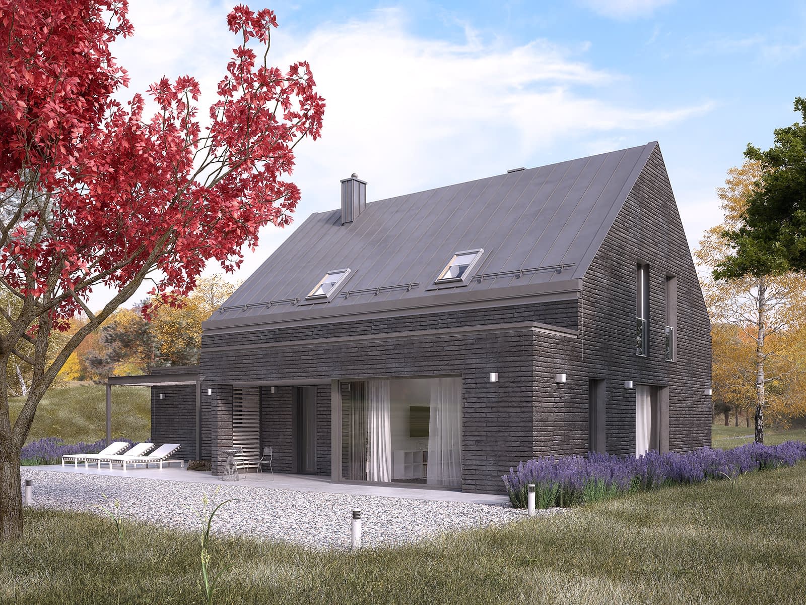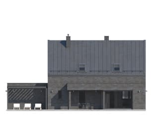 Denar to oryginalny projekt domu, którego wygląd zachwyca od pierwszego spojrzenia. Jest to Projekt niewielkiego domu łączący odważną stylistykę z tradycyjnymi proporcjami. Układ funkcjonalny to sprawdzony podział na strefę dzienną i nocną. Na parterze zaprojektowano strefę dzienną z przestronnym salonem, jadalnią oraz kuchnią z przylegającą do niej spiżarnią. Duże przeszklenia doświetlają wnętrze każdego pomieszczenia i atrakcyjnie otwierają strefę dzienną salonu na zadaszony taras wypoczynkowy. Taras dostępny jest również z dodatkowego pokoju którego funkcją może być pokój gościnny lub biuro. Poddasze stanowi strefę nocną z trzema sypialniami, łazienką i pralnią. Główna sypialna gospodarzy posiada prywatną łazienkę.Konstrukcja