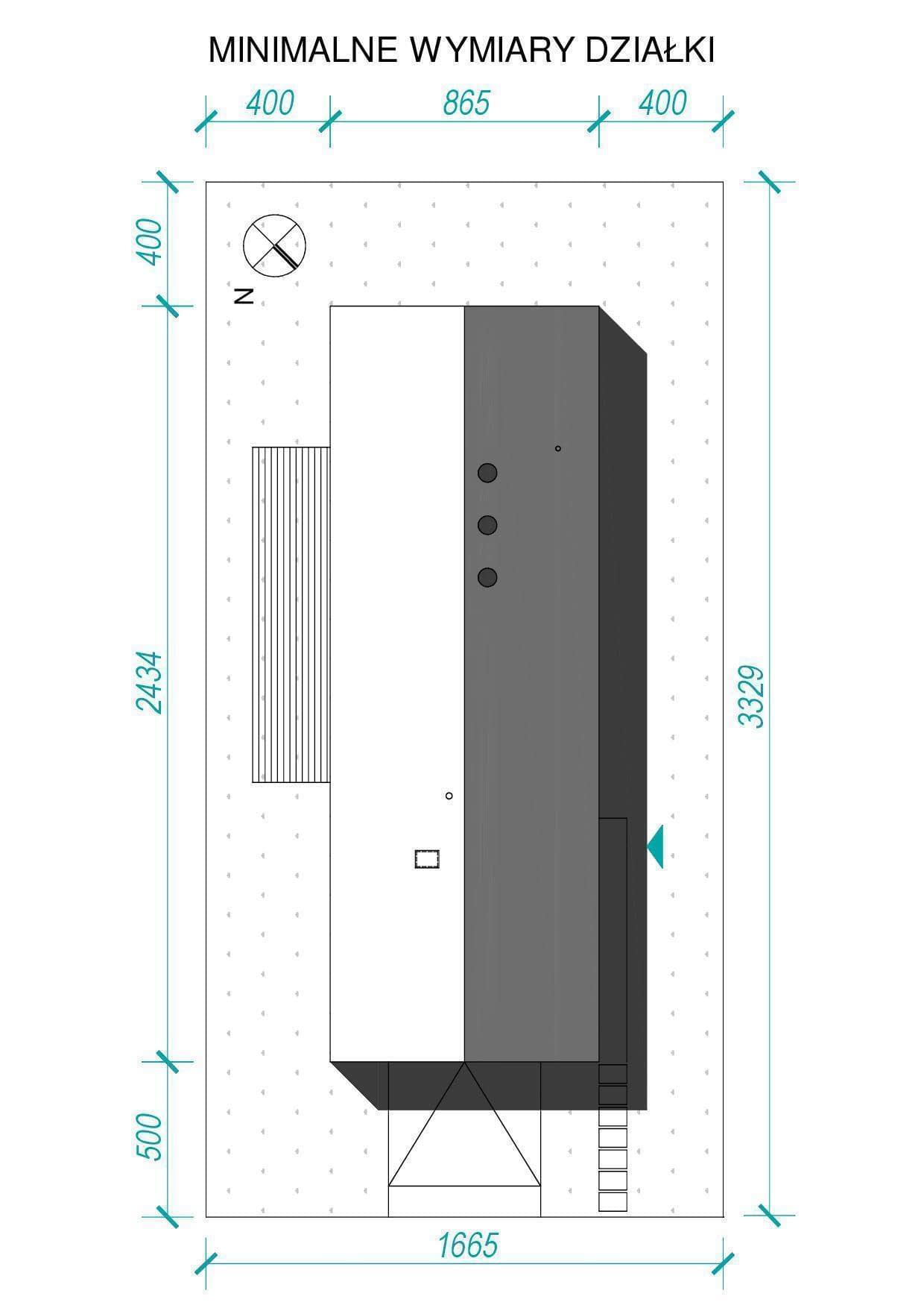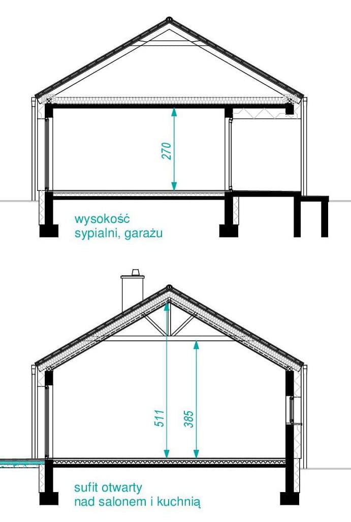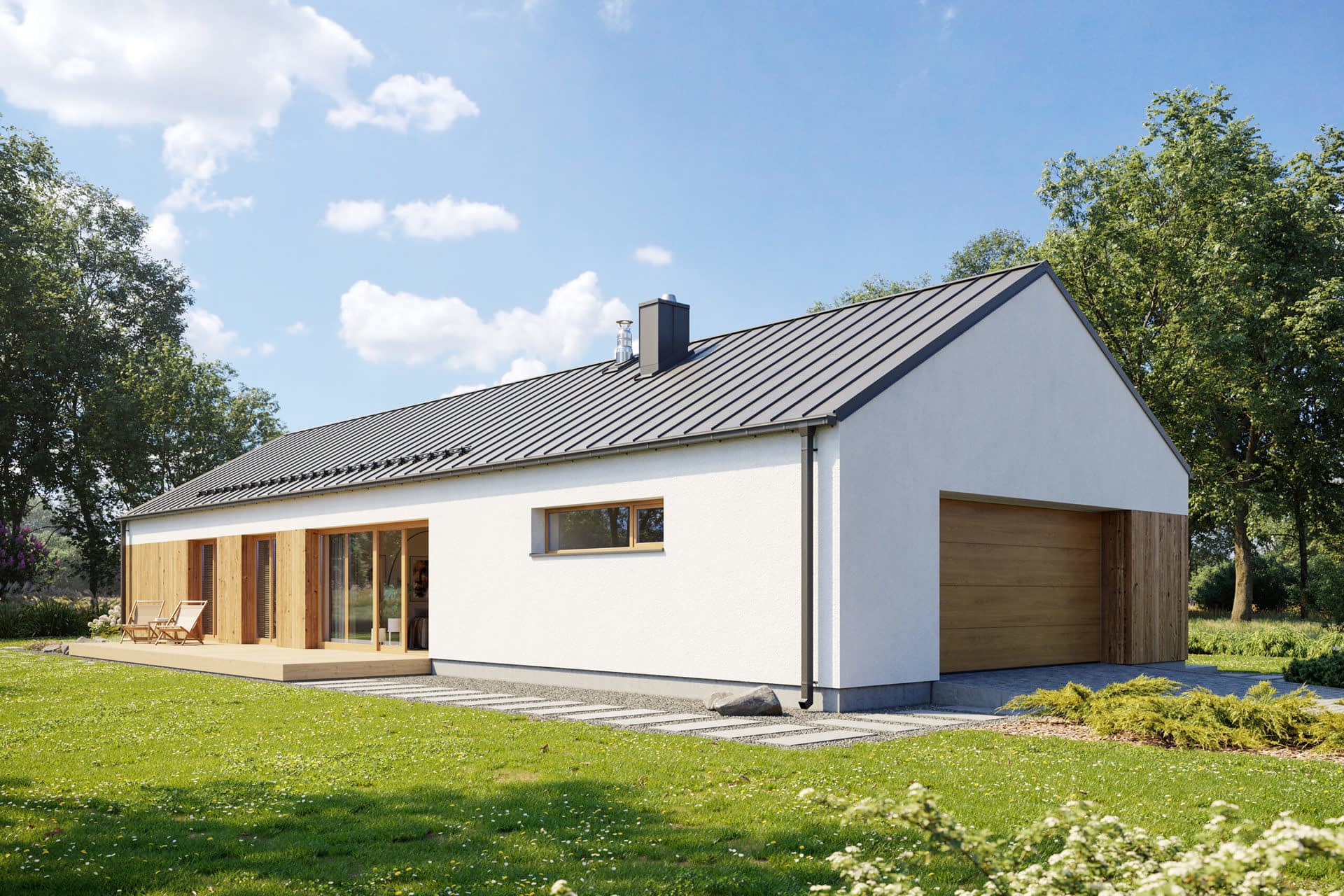 Ekonomiczny, funkcjonalnie zaprojektowany dom parterowy bez strat powierzchni na komunikację. Projekt w stylu nowoczesnej stodoły z wbudowanym garażem dwustanowiskowym, 3 sypialniami oraz salonem połączonym z kuchnią. Nad salonem, kuchnią oraz jadalnią zaprojektowano sufit katedralny. W części nocnej oraz w garażu strop na wysokości 2,70 m. Komunikacja w części nocnej doświetlona światłem naturalnym przy pomocy świetlików tunelowych.
