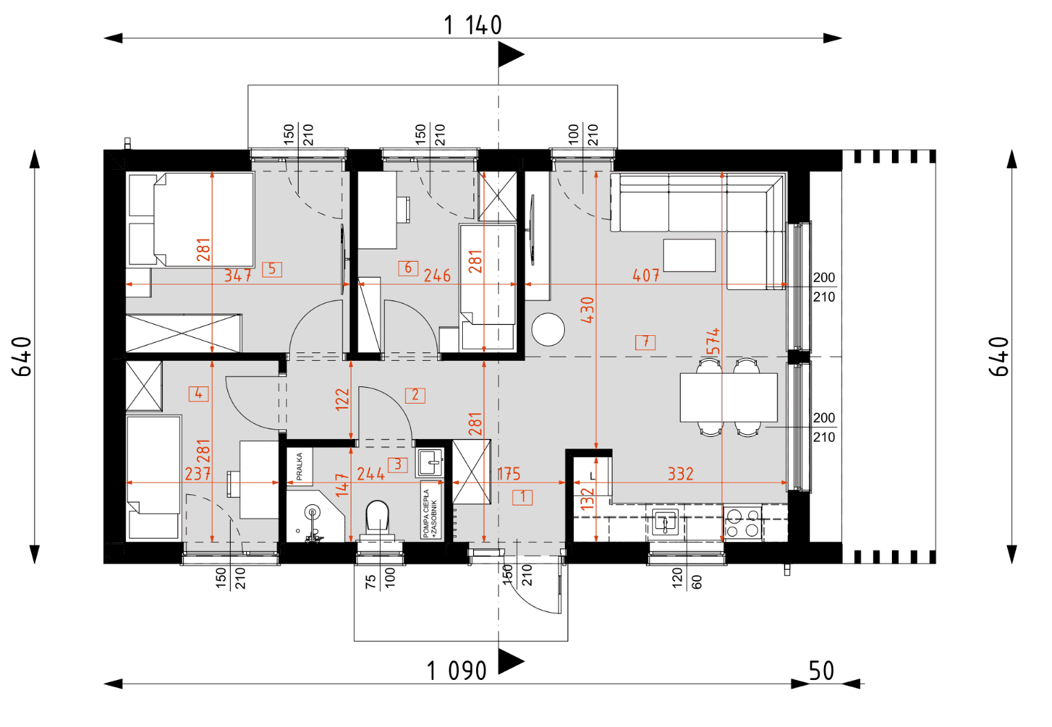 - rzuty wszystkich kondygnacji (np. parter, piwnica, piętro) – rozmieszczenie i wymiary wszystkich pomieszczeń, rozmieszczenie i wielkość otworów okiennych i drzwiowych, rozmieszczenie kominów, sugerowana aranżacja wnętrz.