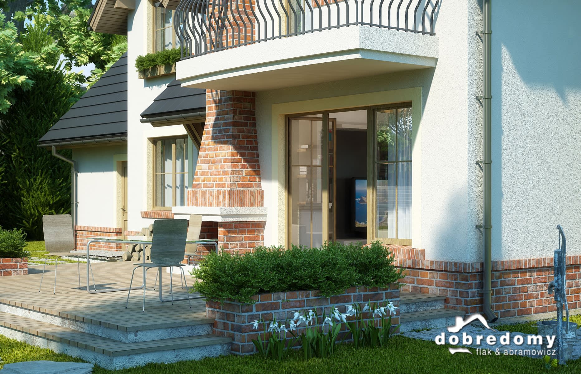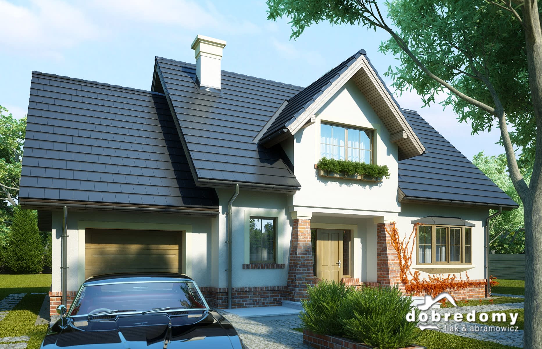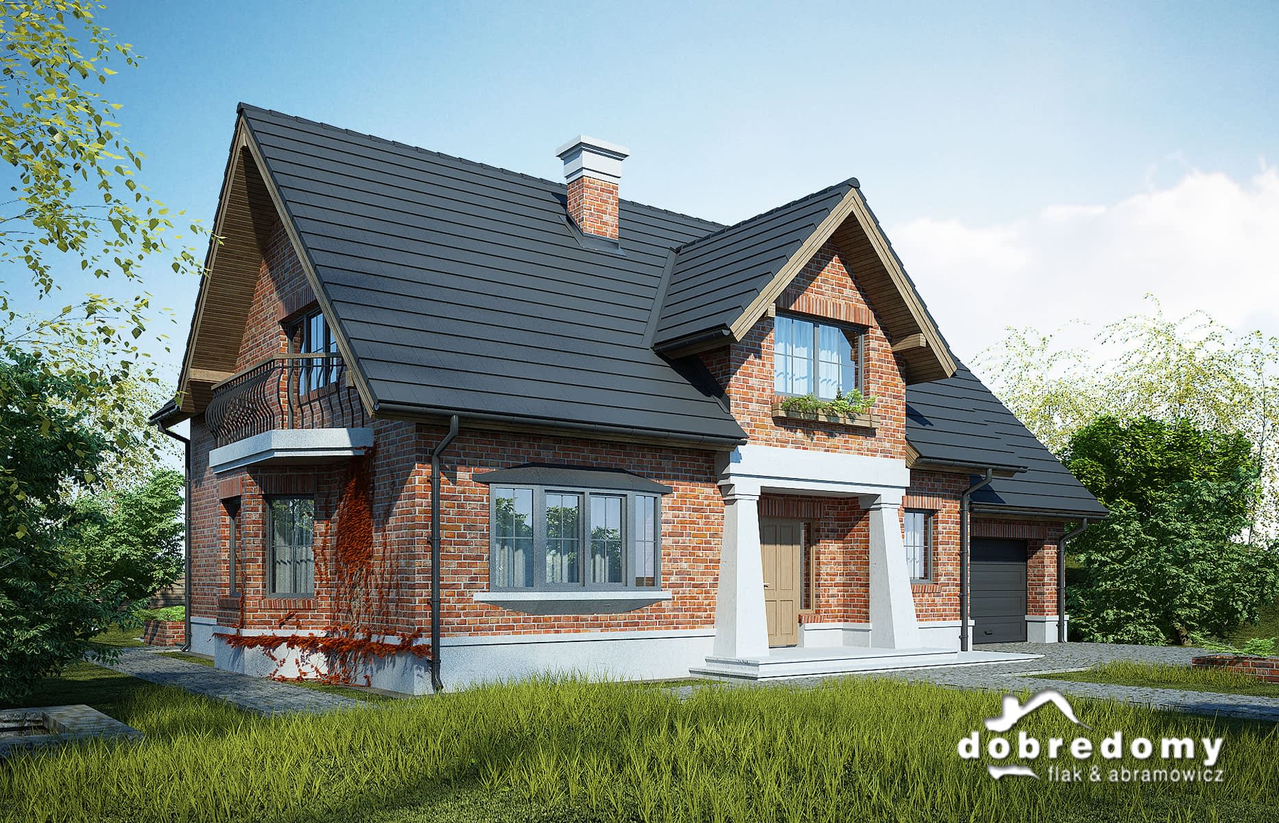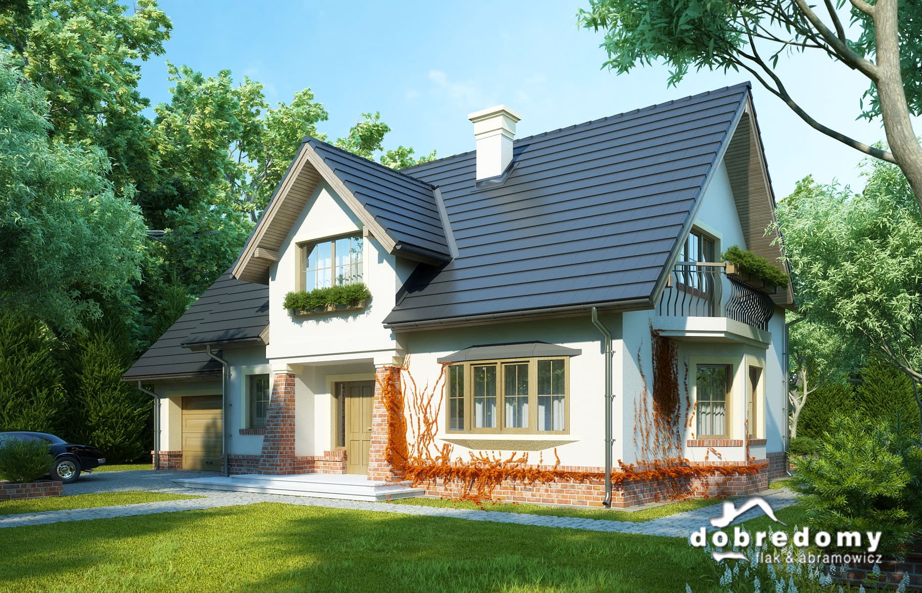Dom z użytkowym poddaszem, dla 4-6-osobowej rodziny. Na parterze znajduje się pokój dzienny połączony z jadalnią, z wyjściem na ogród, kuchnia, łazienka, pokój gościnny/gabinet, pomieszczenie gospodarcze oraz jednostanowiskowy garaż. Na poddaszu są trzy pokoje, w tym jeden połączony z garderobą, łazienka z pralnią oraz strych, który można zaadaptować na dodatkowy pokój. Projekt dostępny w wersji z garażem dwustanowiskowym - Dobry II. Projekt może być wykorzystany do zabudowy bliźniaczej.