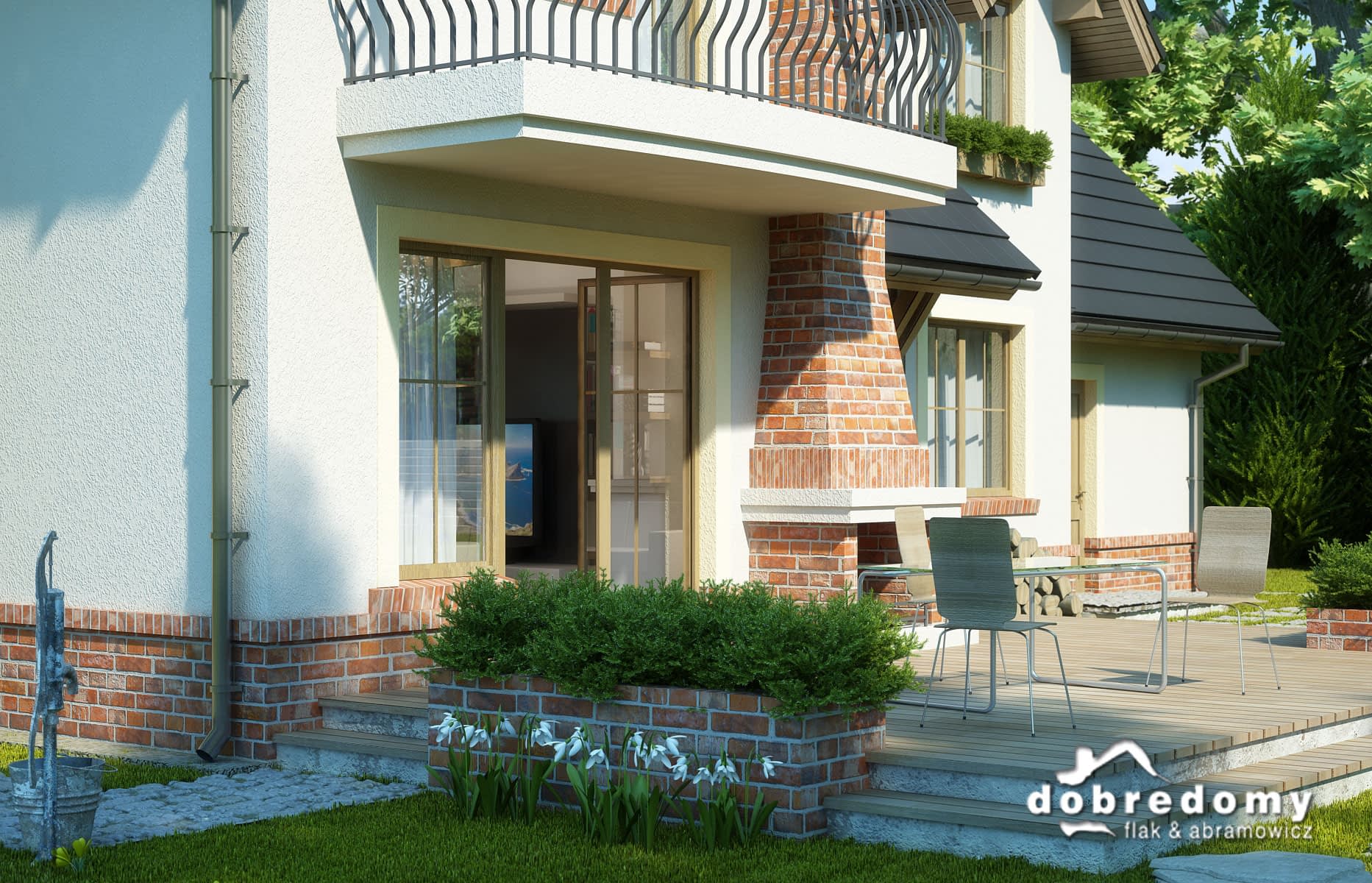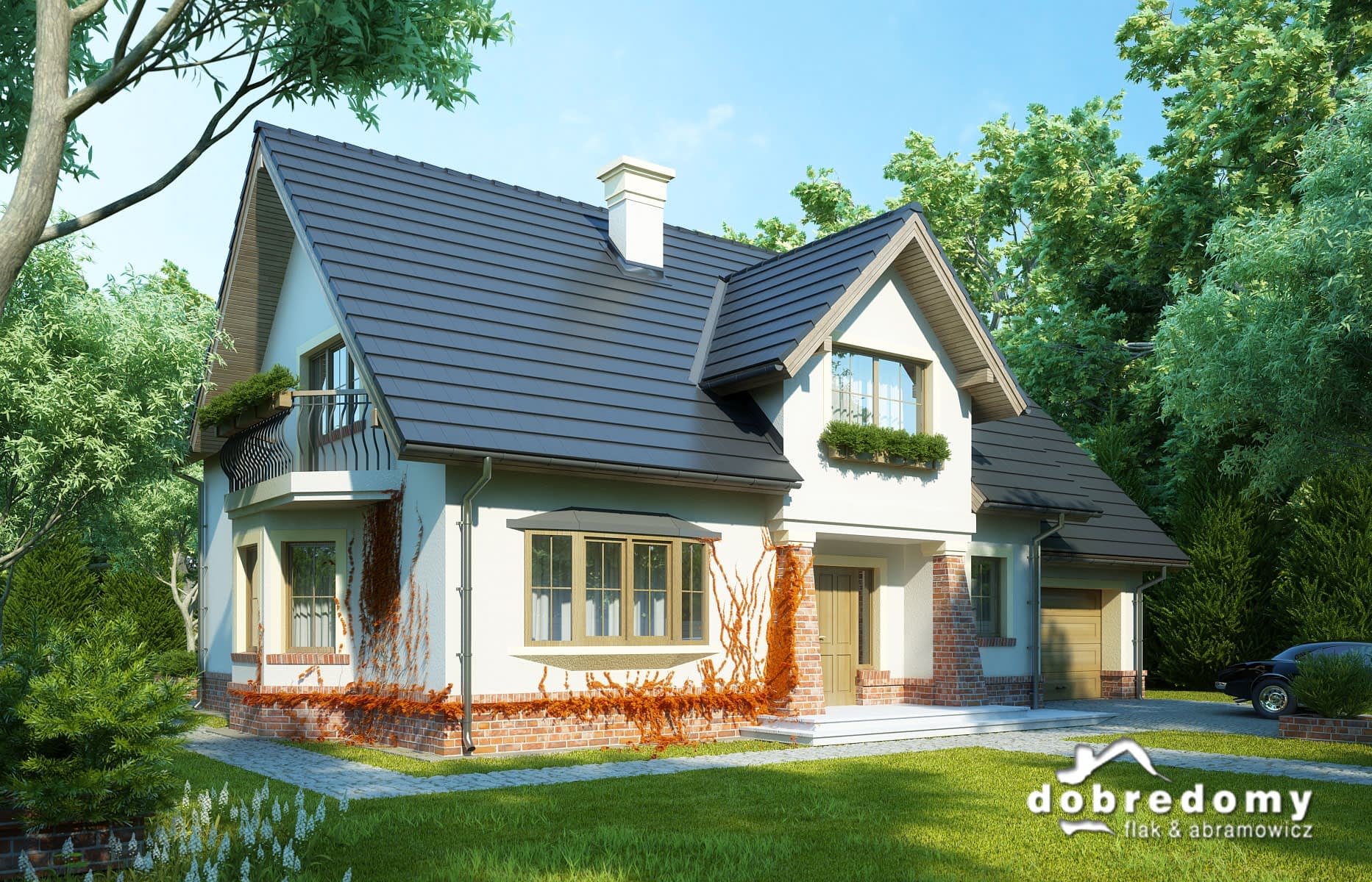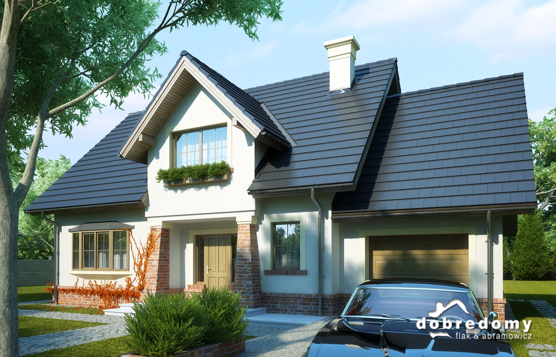 Dom z użytkowym poddaszem, dla 4-6-osobowej rodziny. Na parterze znajduje się pokój dzienny połączony z jadalnią, z wyjściem na ogród, kuchnia, łazienka, pokój gościnny/gabinet, pomieszczenie gospodarcze oraz jednostanowiskowy garaż. Na poddaszu są trzy pokoje, w tym jeden połączony z garderobą, łazienka z pralnią oraz strych, który można zaadaptować na dodatkowy pokój. Projekt dostępny w wersji z garażem dwustanowiskowym - Dobry II. Projekt może być wykorzystany do zabudowy bliźniaczej.