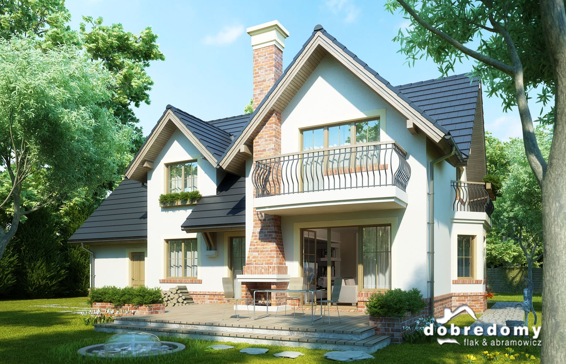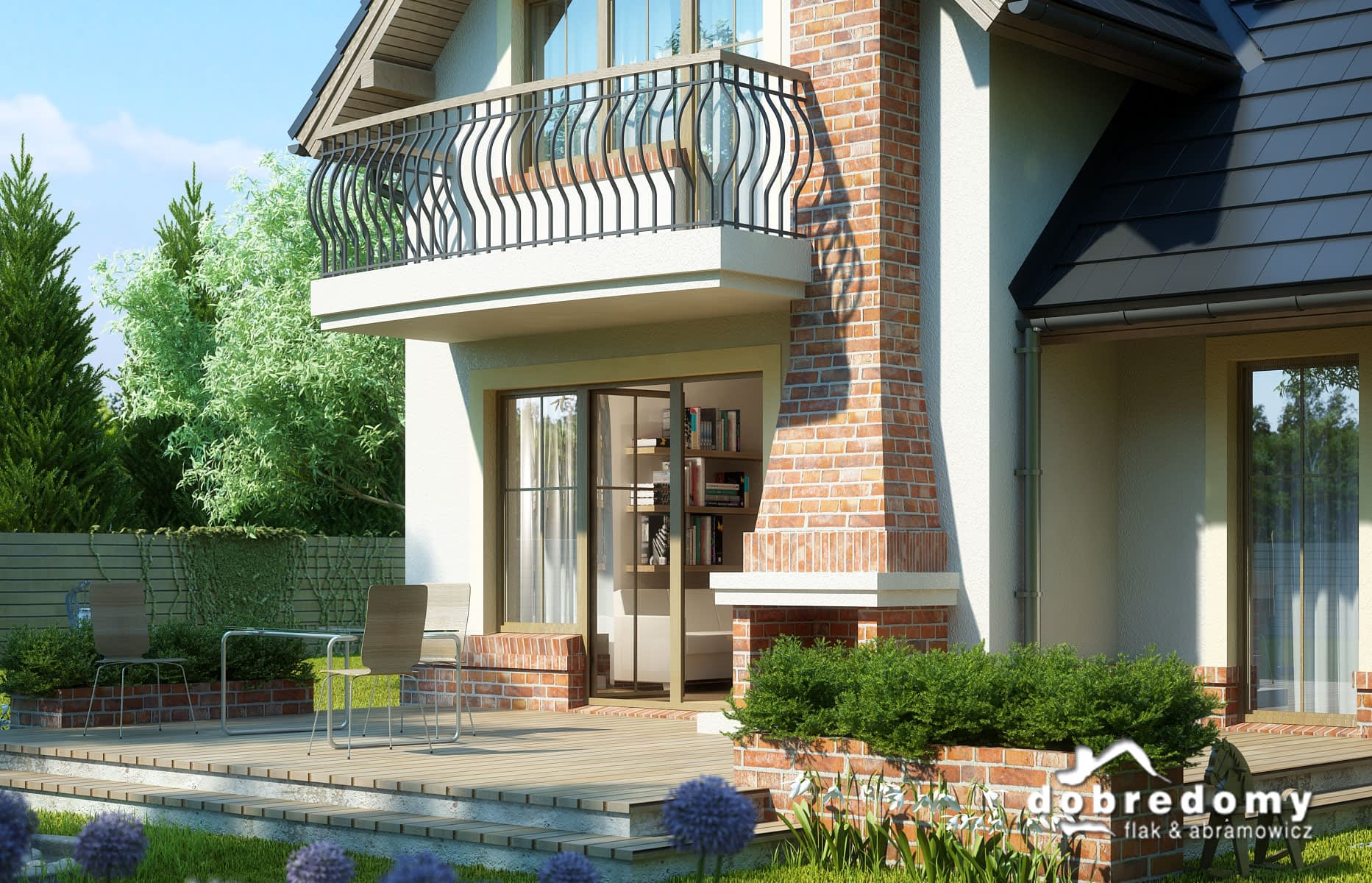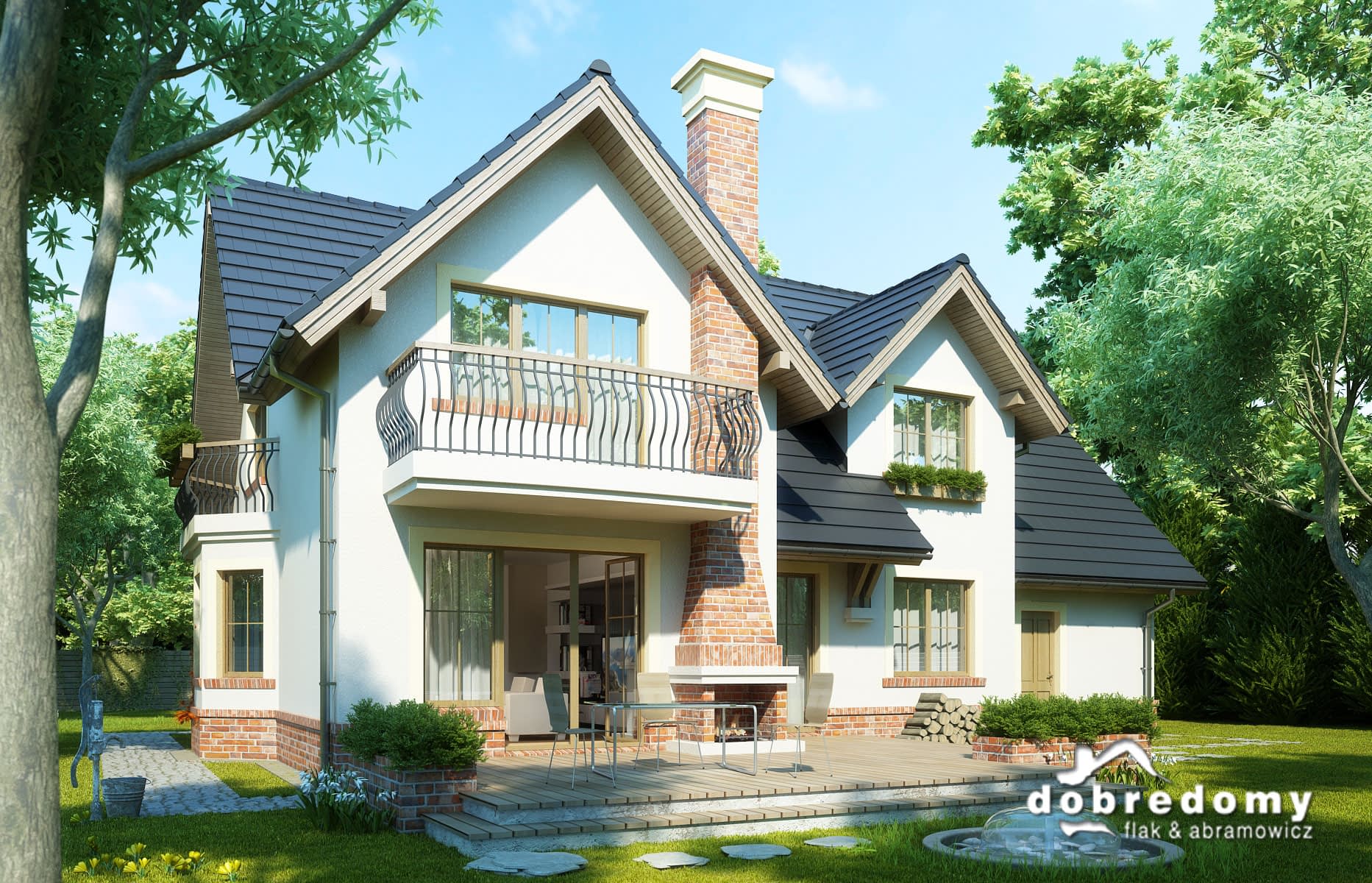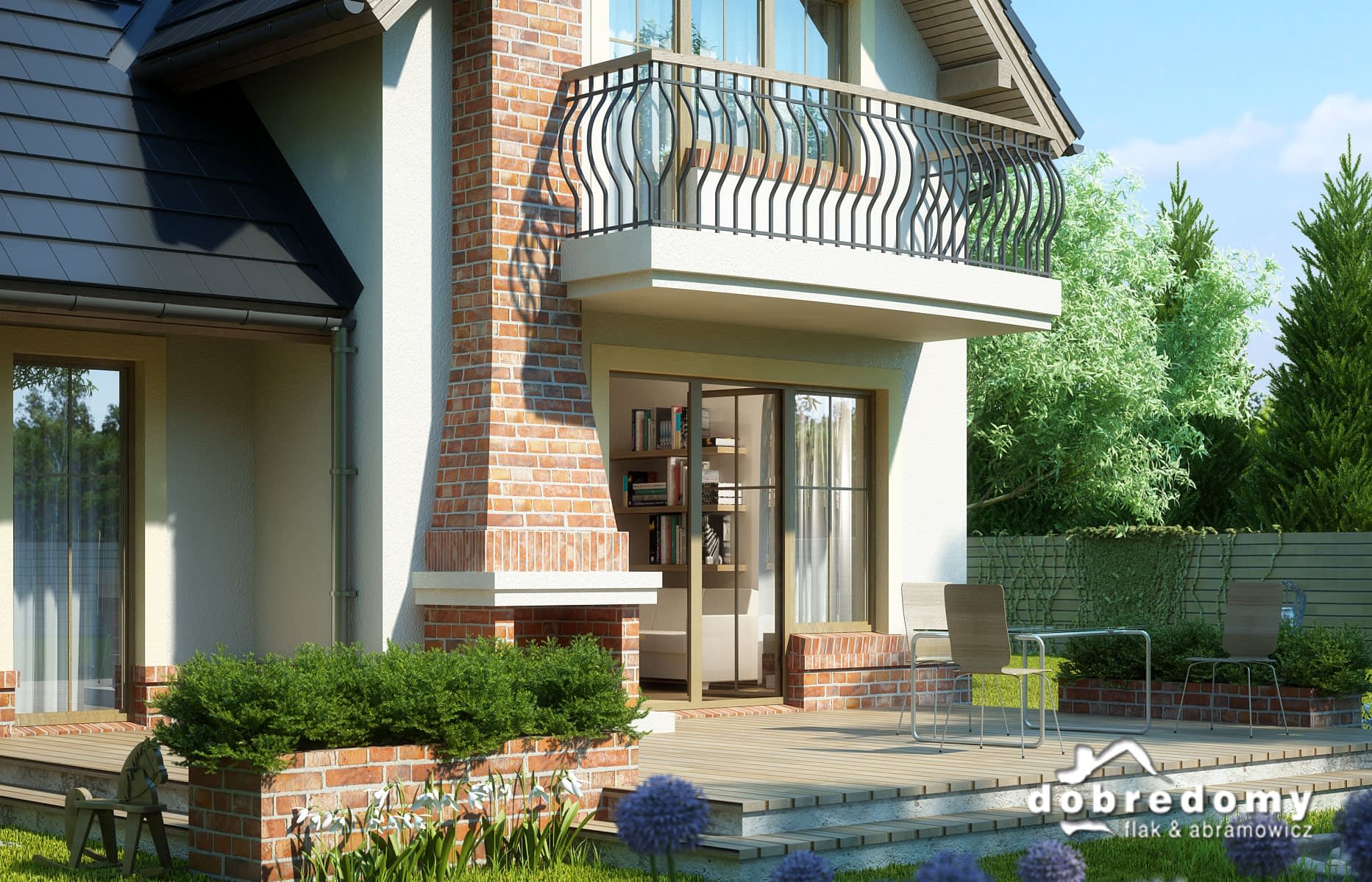 Dom z użytkowym poddaszem, dla 4-6-osobowej rodziny. Na parterze znajduje się pokój dzienny połączony z jadalnią, z wyjściem na ogród, kuchnia, łazienka, pokój gościnny/gabinet, pomieszczenie gospodarcze oraz jednostanowiskowy garaż. Na poddaszu są trzy pokoje, w tym jeden połączony z garderobą, łazienka z pralnią oraz strych, który można zaadaptować na dodatkowy pokój. Projekt dostępny w wersji z garażem dwustanowiskowym - Dobry II. Projekt może być wykorzystany do zabudowy bliźniaczej.