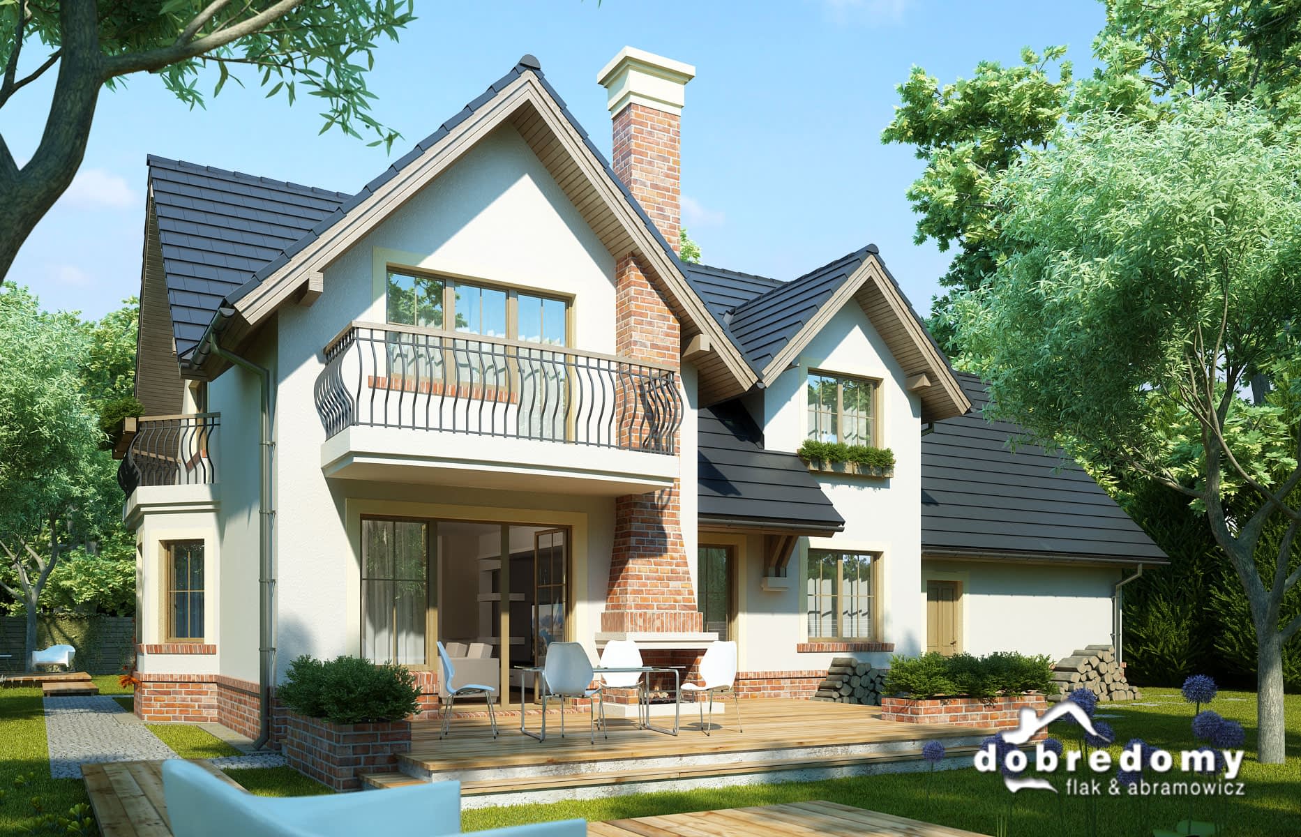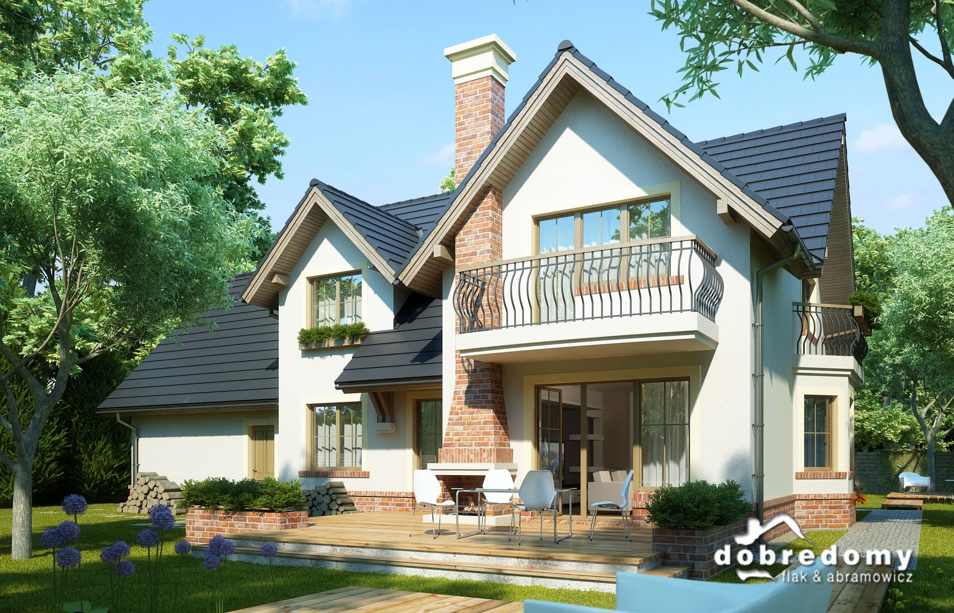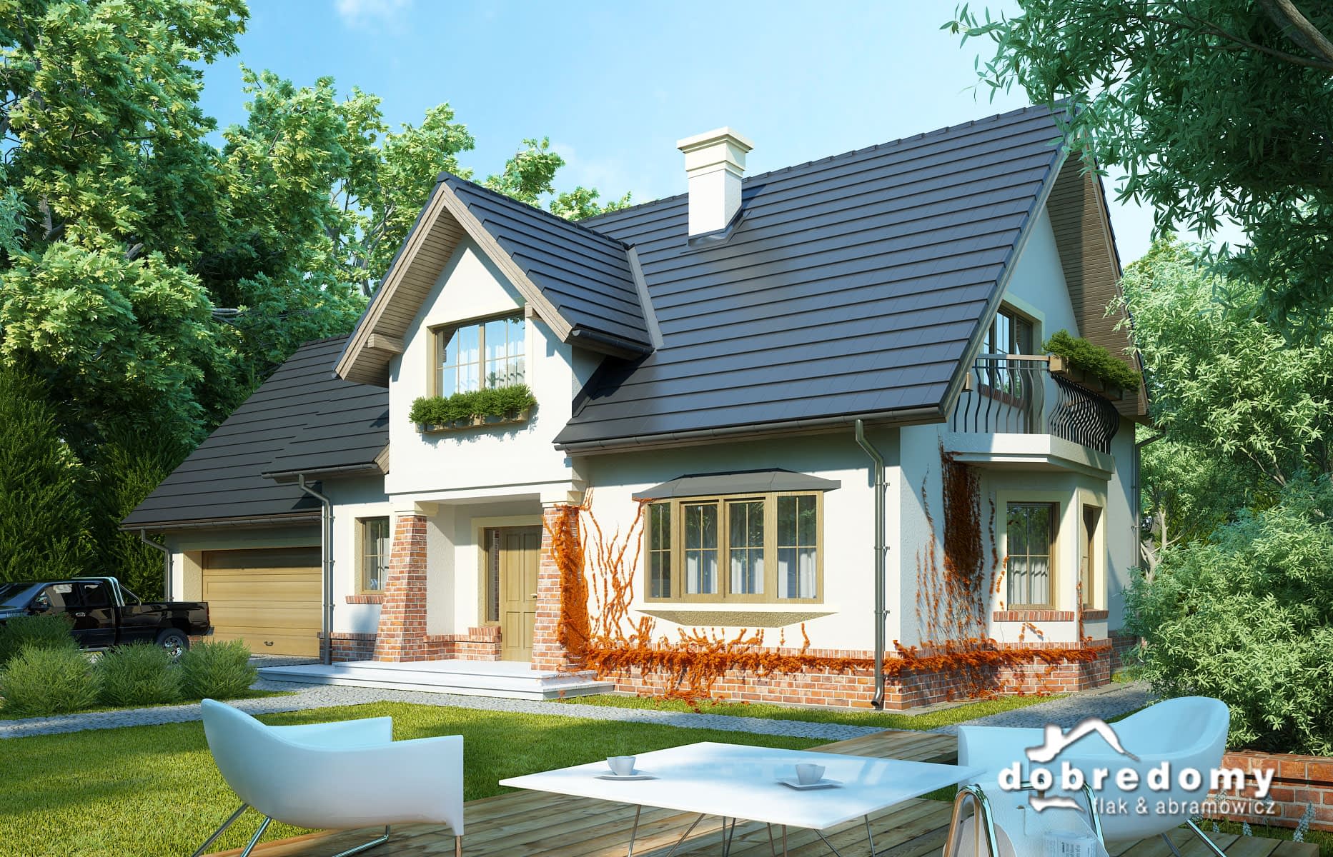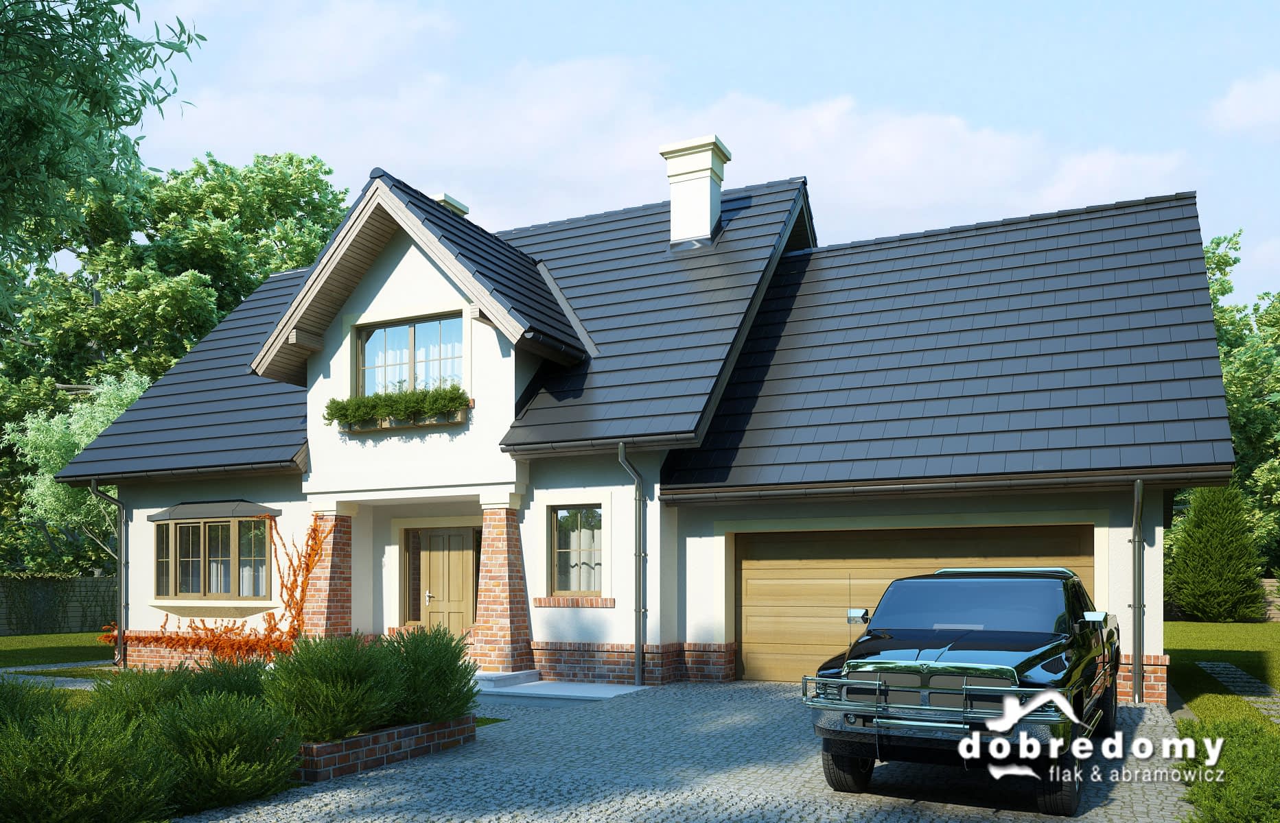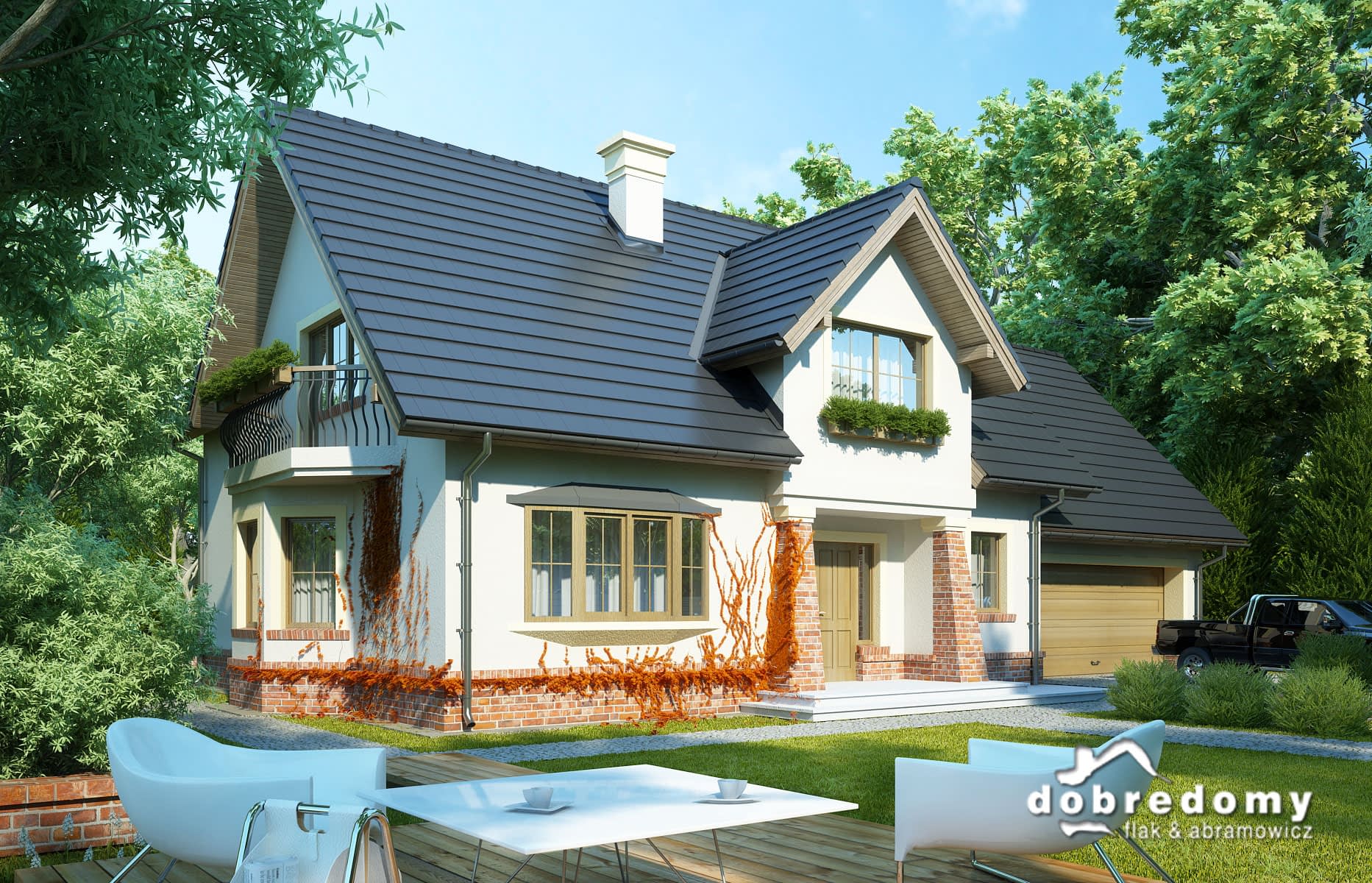 Dom z użytkowym poddaszem, dla 4-6-osobowej rodziny. Na parterze znajduje się pokój dzienny połączony z jadalnią, z wyjściem na ogród, kuchnia, łazienka, pokój gościnny/gabinet, pomieszczenie gospodarcze oraz dwustanowiskowy garaż. Na poddaszu są trzy pokoje, w tym jeden połączony z garderobą, łazienka z pralnią oraz strych, który można zaadaptować na dodatkowy pokój. Projekt dostępny w wersji z garażem jednostanowiskowym - Dobry. Projekt może być wykorzystany do zabudowy bliźniaczej.