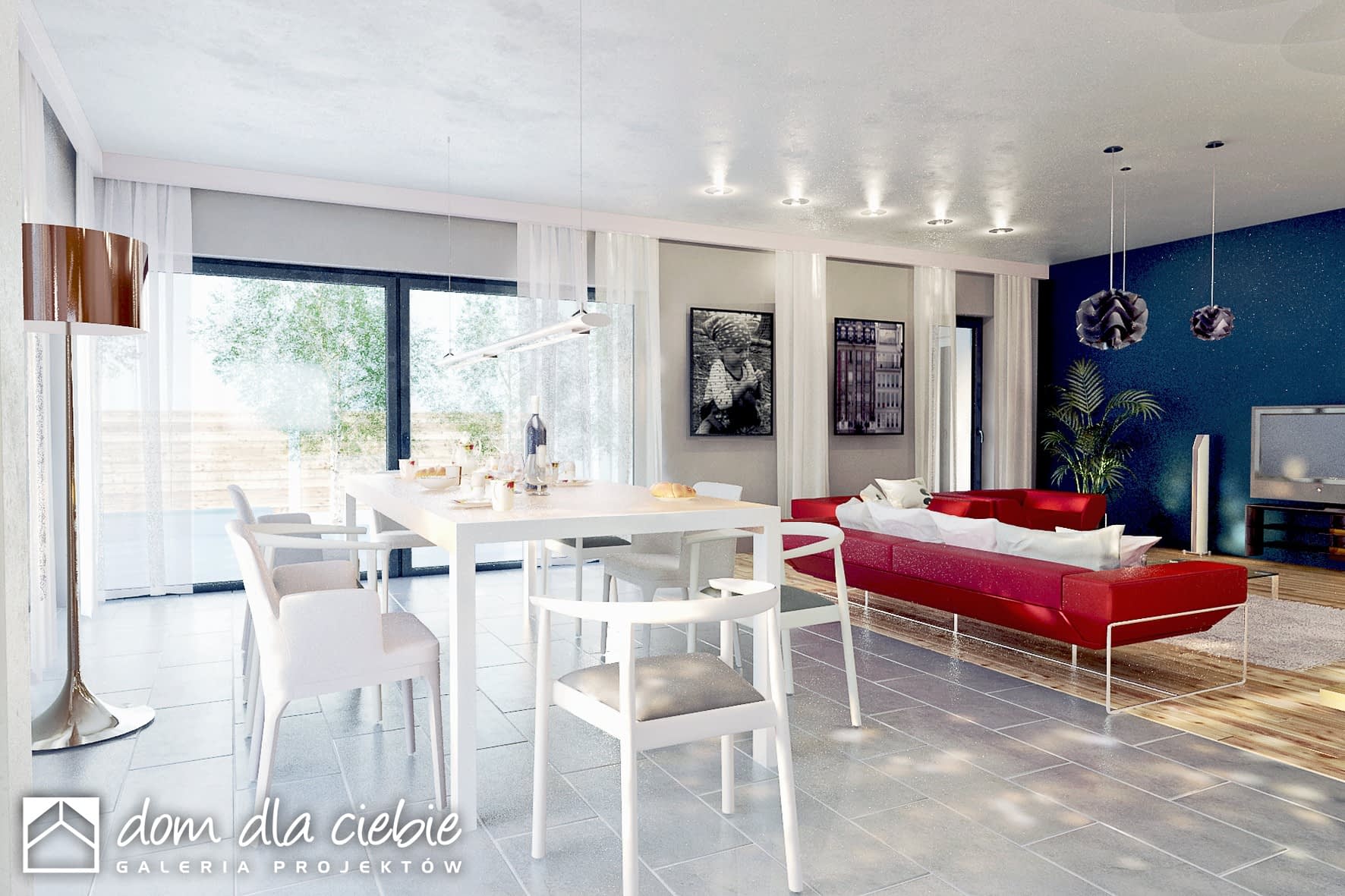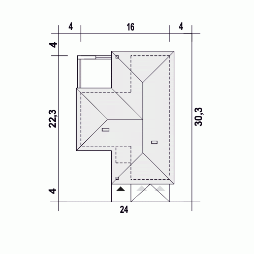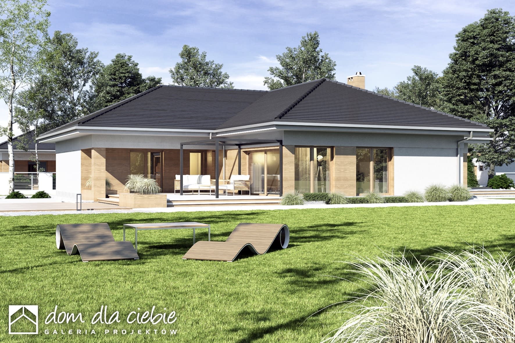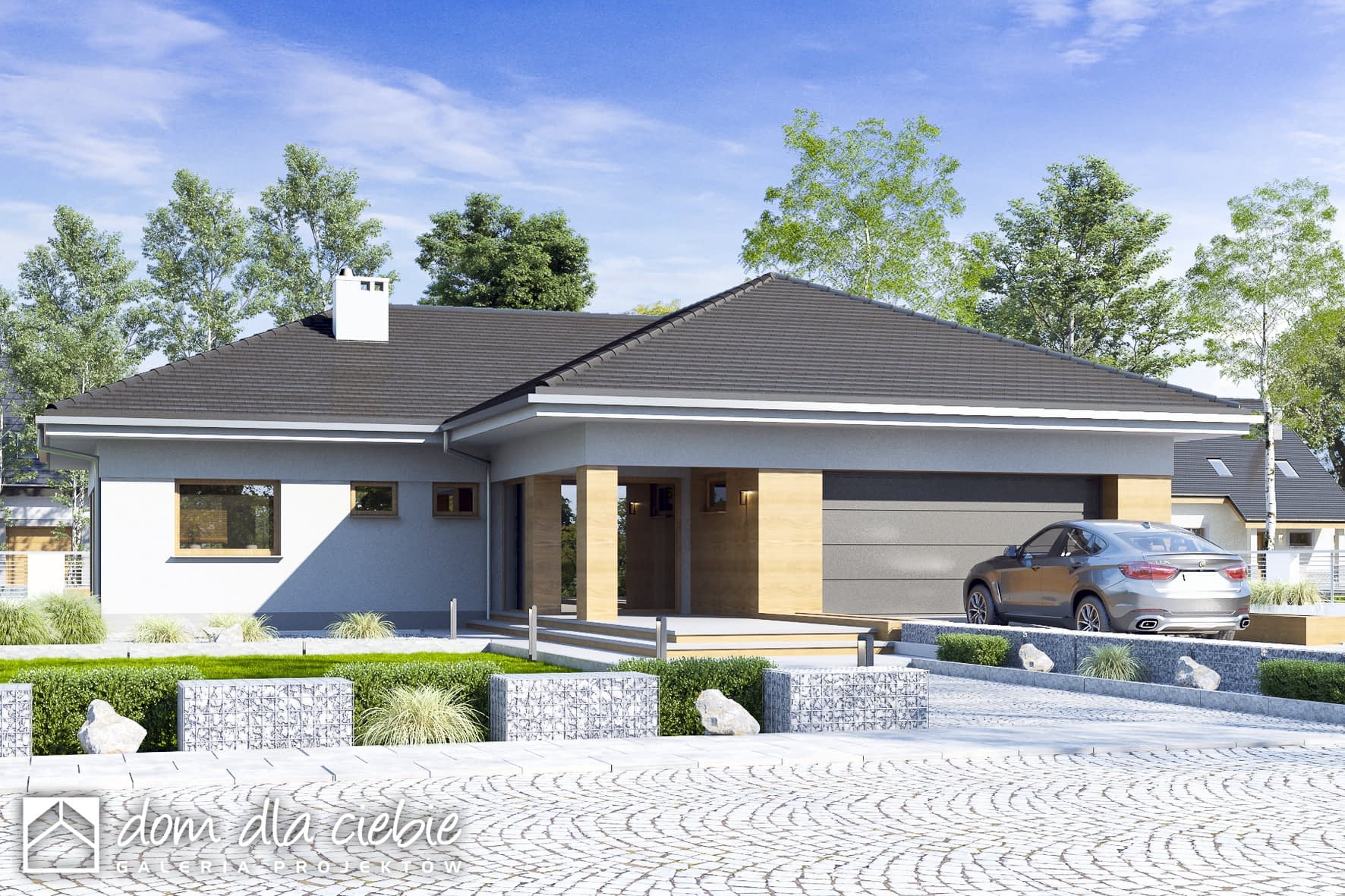 Projekt gotowy Dolomit II to propozycja dla dużych rodzin.Budynek w kształcie litery T z dachem wielospadowym o nowoczesnym kształcie nada się na działki o szerokości frontu 24 m.Program funkcjonalny to wiatrołap, garderoba, WC, jednoprzestrzenny salon z kuchnią i jadalnią, pomieszczenie CO, a w strefie nocnej cztery sypialnie (jedna typy master bedroom z własną łazienka) oraz wspólna łazienką.