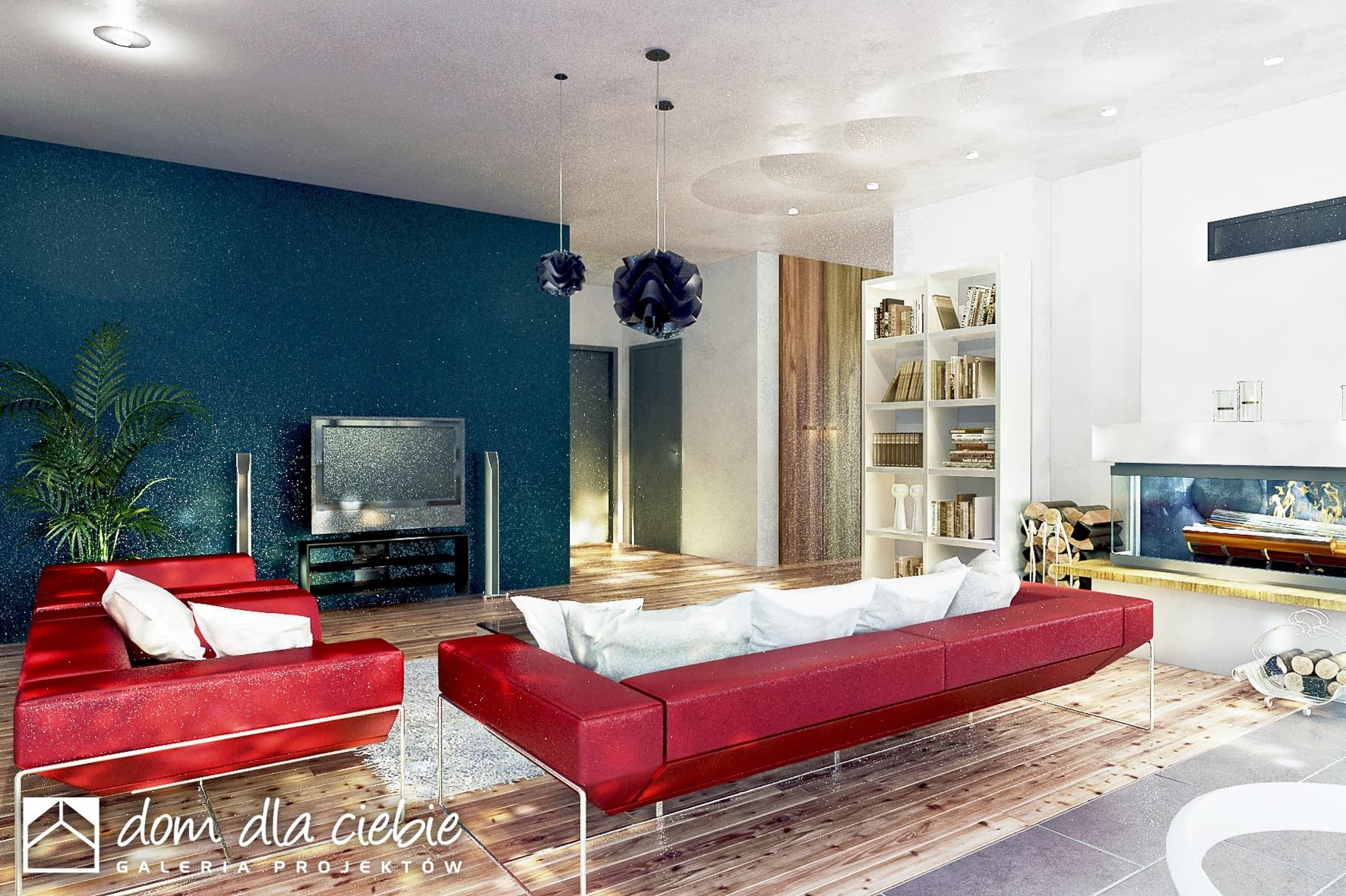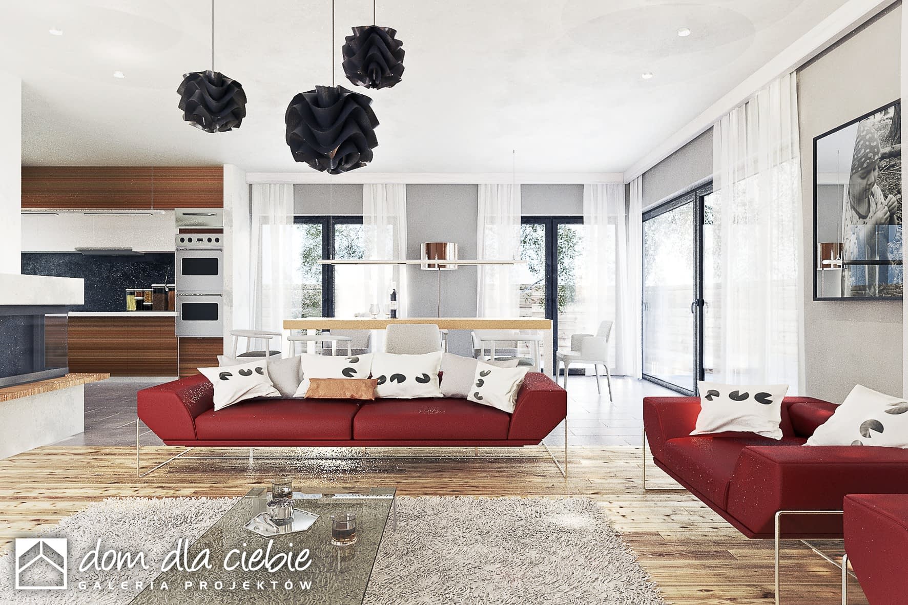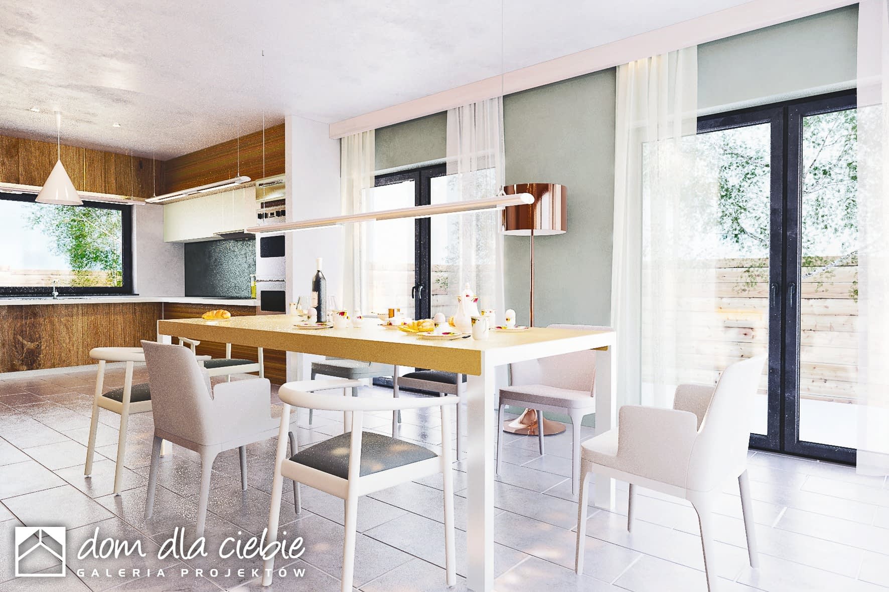 Projekt gotowy Dolomit II to propozycja dla dużych rodzin.Budynek w kształcie litery T z dachem wielospadowym o nowoczesnym kształcie nada się na działki o szerokości frontu 24 m.Program funkcjonalny to wiatrołap, garderoba, WC, jednoprzestrzenny salon z kuchnią i jadalnią, pomieszczenie CO, a w strefie nocnej cztery sypialnie (jedna typy master bedroom z własną łazienka) oraz wspólna łazienką.