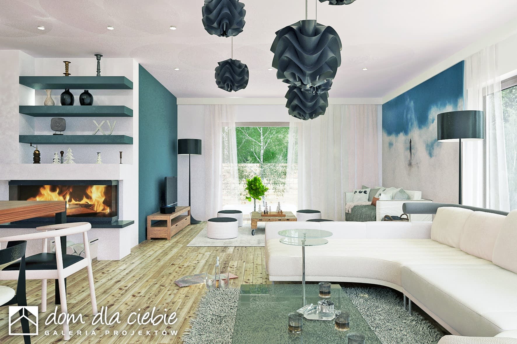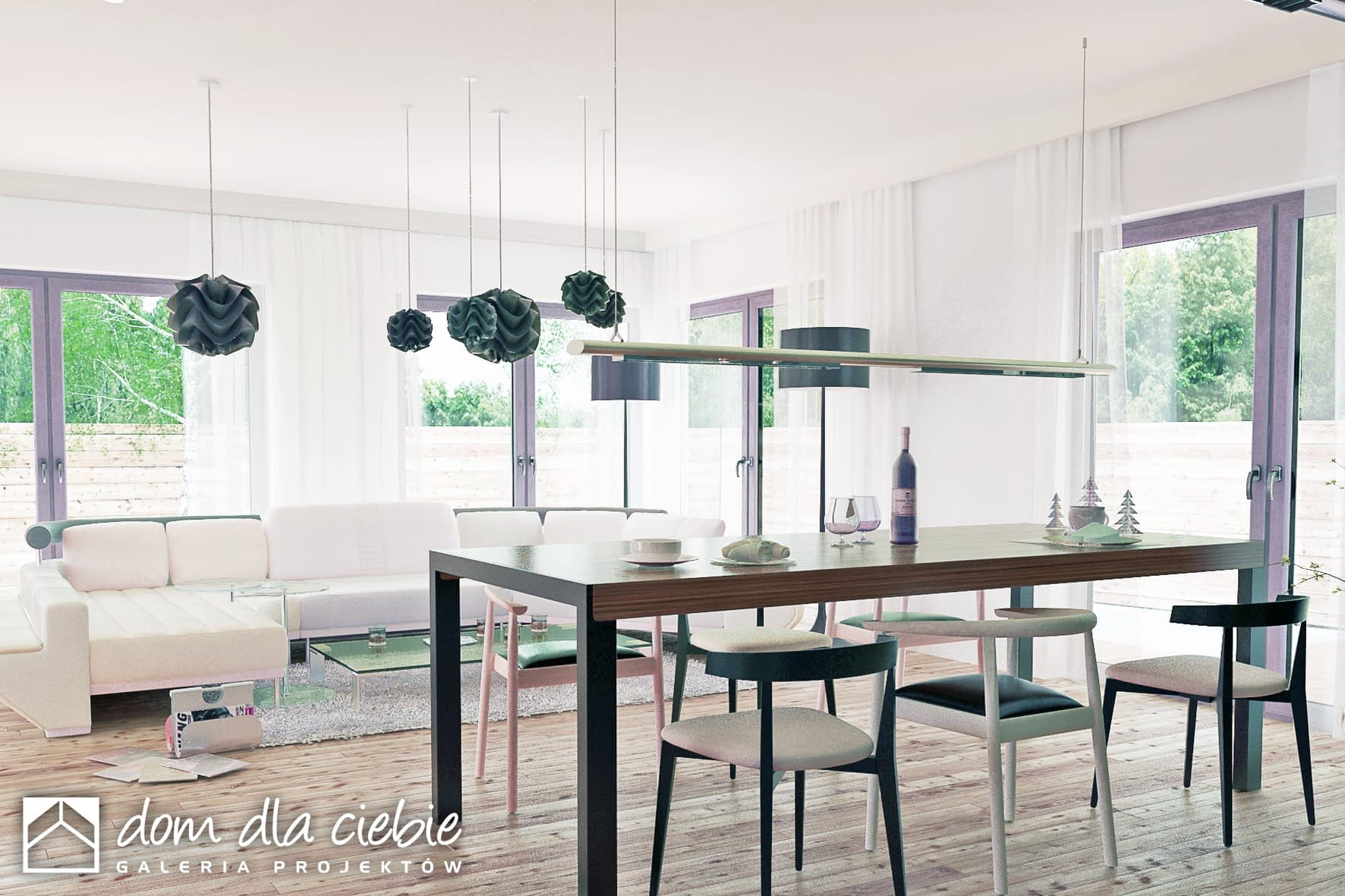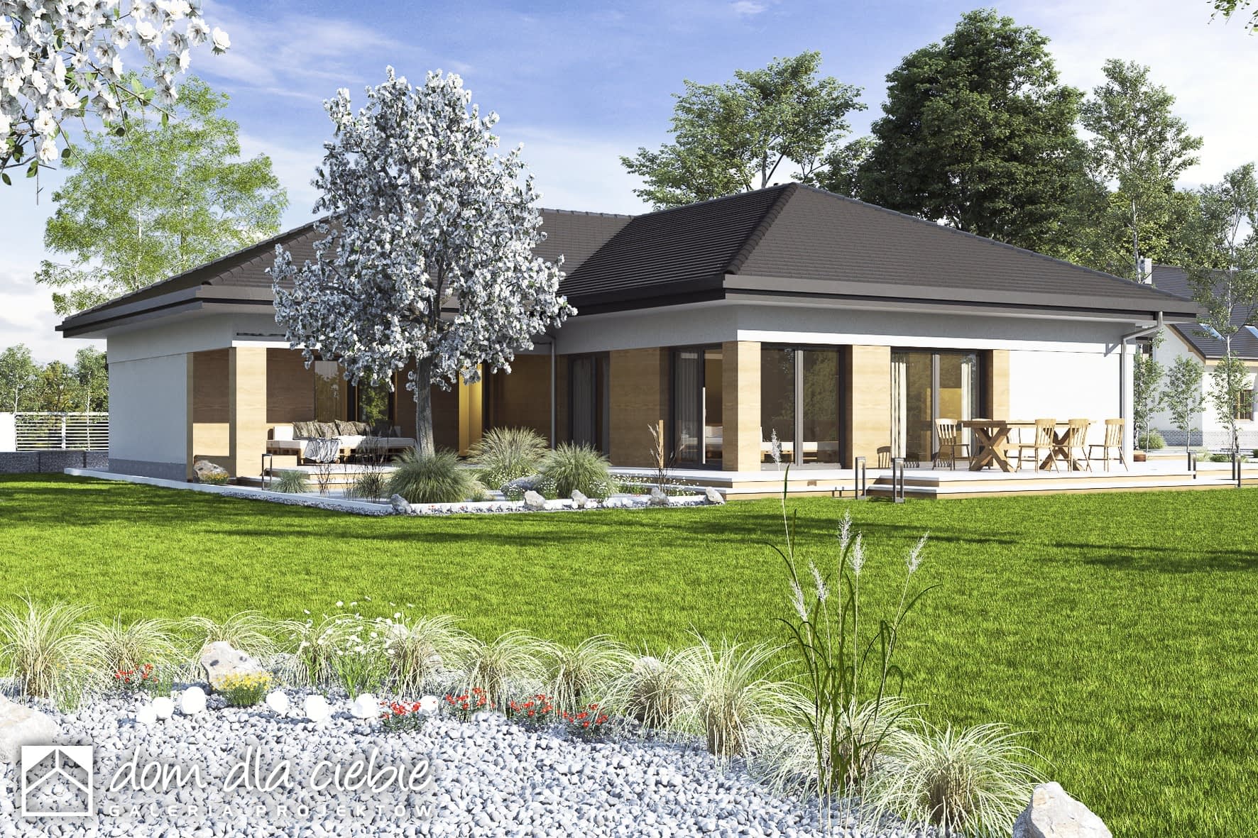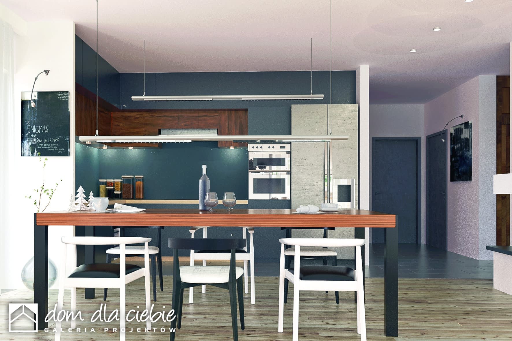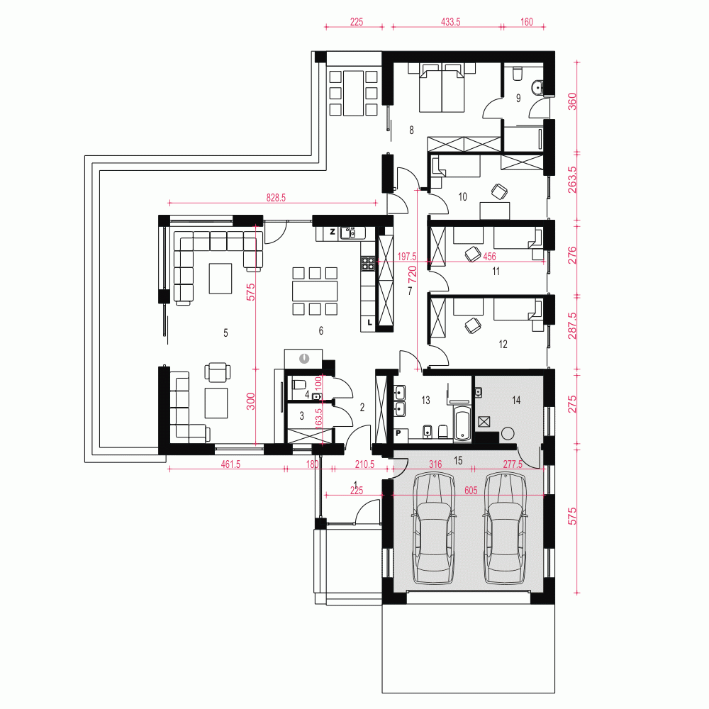 Projekt gotowy Dolomit II to propozycja dla dużych rodzin.Budynek w kształcie litery T z dachem wielospadowym o nowoczesnym kształcie nada się na działki o szerokości frontu 24 m i z wjazdem od południa.Program funkcjonalny to wiatrołap, garderoba, WC, jednoprzestrzenny salon z kuchnią i jadalnią, pomieszczenie CO, a w strefie nocnej cztery sypialnie (jedna typy master bedroom z własną łazienka) oraz wspólna łazienką.