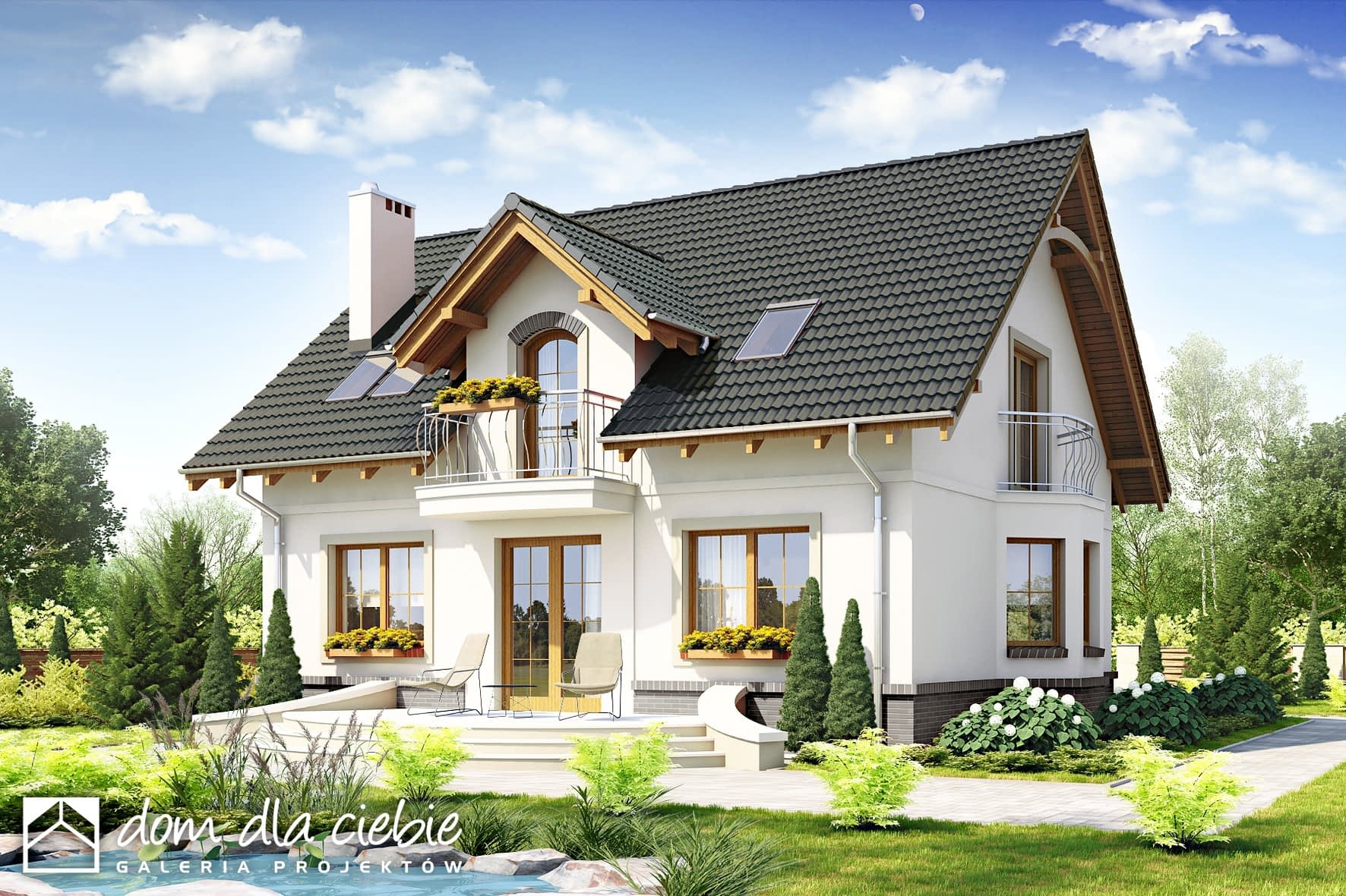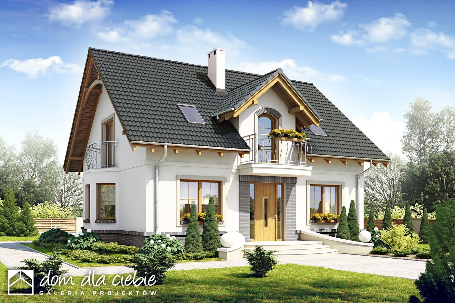 Dom Dla Ciebie 1 w wariancie bez garażu to dom z serii domów stylowych. Ten projekt uroczego domu z poddaszem użytkowym jest przeznaczony dla 4ro osobowej rodziny. Dom zaprojektowany został z zachowaniem podziału na dwie strefy: ogólnie dostępną i prywatną. Strefa ogólnie dostępna przewidziana jest na parterze. mamy tu wiatrołap z wnękowymi szafami, hol, kuchnię ze spiżarnią, salon z jadalnią i kominkiem oraz pokój od frontu, który może służyć jako gabinet. Ponadto mamy tu niedużą łazienkę z prysznicem oraz kotłownię z pralnią. Na poddasze prowadzą jednobiegowe schody, którymi ostaniemy się do przedpokoju prowadzącego do 3 wygodnych i dobrze oświetlonych pokoi z balkonami. Ponadto jest tu przewidziana ogólnie dostępną łazienka z narożną wanną i prysznicem. Poddasze wygospodarowano pod dwuspadowym dachem zaprojektowanym na tradycyjnej więźbie dachowej opartej na ściance kolankowej. Projekt domu Dom Dla Ciebie 1, to propozycja dla szukających projektu domu tradycyjnego o stylowej architekturze oraz funkcjonalnym wnętrzu.