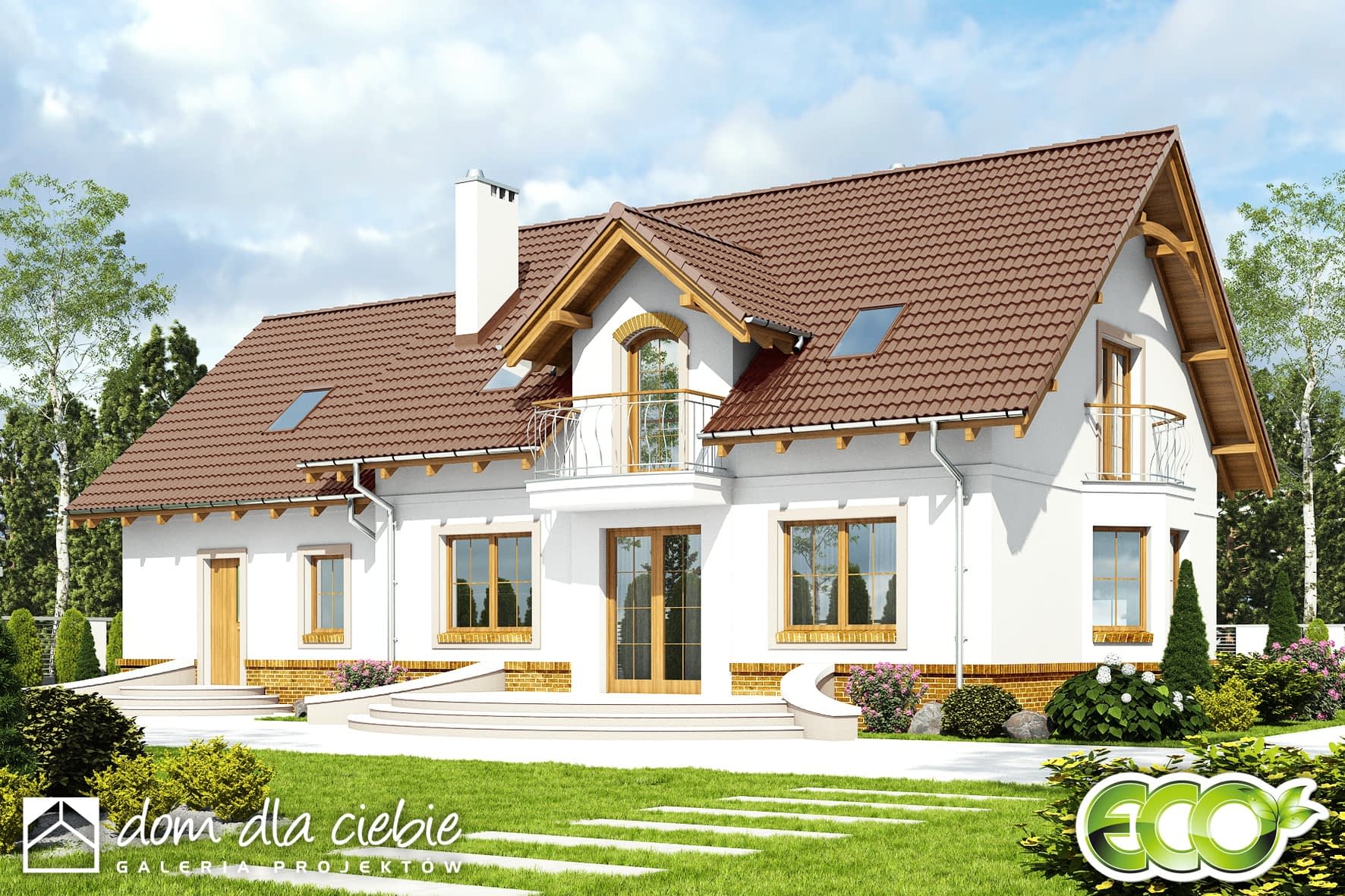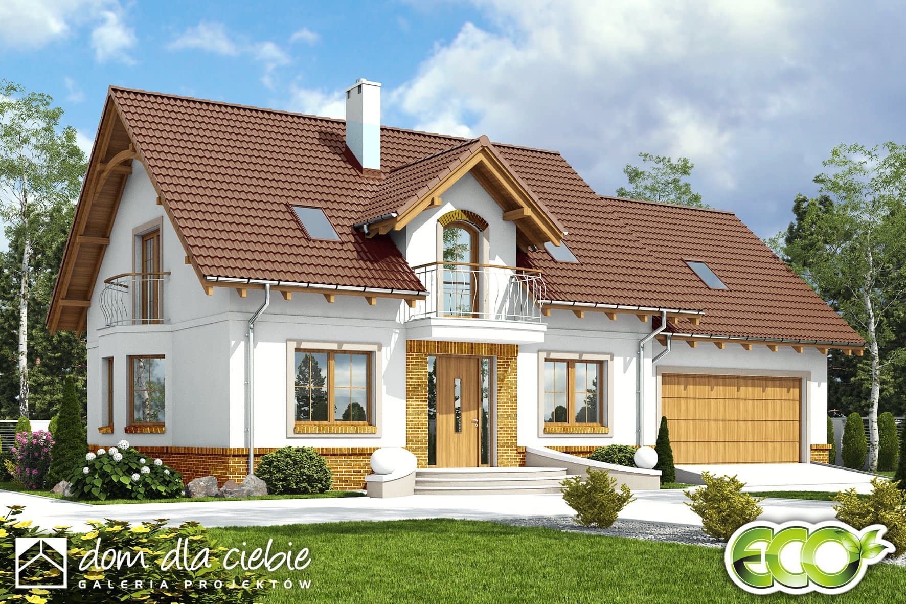 Dom Dla Ciebie 1 w3 z garażem dwustanowiskowym przeznaczony jest dla 4-5cio osobowej rodziny. Zaprojektowany jest z zachowaniem podziału na dwie strefy: dzienną na parterze i nocną na poddaszu. Na parterze mamy zaprojektowany wiatrołap, hol, kuchnię, salon z jadalnią i kominkiem oraz pokój usytuowanego od strony ogrodowej. Przy schodach mamy zaprojektowaną łazienkę z wanną oraz osobna pralnię. Obok mamy wejście do dwustanowiskowego garażu oraz kotłowni. Poddasze obejmuje trzy ustawne i dobrze doświetlone pokoje, każdy pokój z własnym balkonem. Na poddaszu zaprojektowano ogólnie dostępną łazienkę z narożną wanną i prysznicem. Nad garażem mamy do dyspozycji strych, który można wykorzystać na etapie adaptacji jako dodatkowe pomieszczenie (pokój, garderobę lub pomieszczenie rekreacyjne). Poddasze zaprojektowane jest pod dwuspadowym dachem o układzie kalenicowym, opartym na tradycyjnej więźbie dachowej i ściance kolankowej wys 0,9m. Projekt Dom Dla Ciebie 1 w3, to idealna propozycja domu dla osób poszukujących domu energooszczędnego, o stylowej architekturze i przemyślanej funkcji.