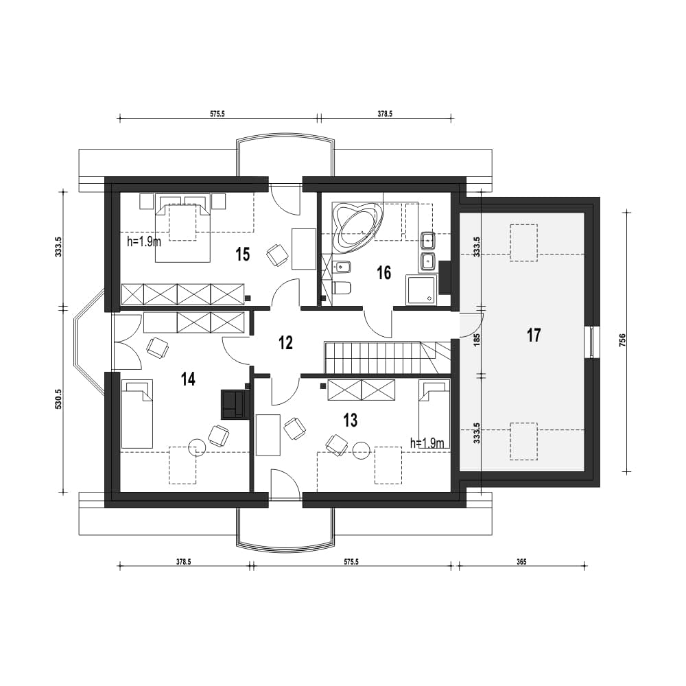 Dom Dla Ciebie 1 w3 z garażem jednospadowym przeznaczony jest dla 4ro osobowej rodziny , zaprojektowany jest z zachowaniem podziału na dwie strefy: dzienną na parterze i nocną na poddaszu. Na parterze mamy zaprojektowany wiatrołap, hol, kuchnię, salon z jadalnią i kominkiem oraz pokój usytuowanego od strony ogrodowej. Przy schodach mamy zaprojektowaną łazienkę z wanną oraz osobna pralnię. Obok mamy wejście do garażu oraz kotłowni. Poddasze obejmuje trzy ustawne i dobrze doświetlone pokoje, każdy pokój z własnym balkonem. Na poddaszu zaprojektowano ogólnie dostępną łazienkę z narożną wanną i prysznicem. Nad garażem mamy do dyspozycji strych, który można wykorzystać na etapie adaptacji jako dodatkowe pomieszczenie np.: pokój, garderobę lub pomieszczenie rekreacyjne. Poddasze zaprojektowane jest pod dwuspadowym dachem opartym na tradycyjnej więźbie i ściance kolankowej. Projekt Dom Dla Ciebie 1 w3, to idealna propozycją domu dla osób poszukujących tradycyjnego domu o stylowej architekturze i przemyślanej funkcji.