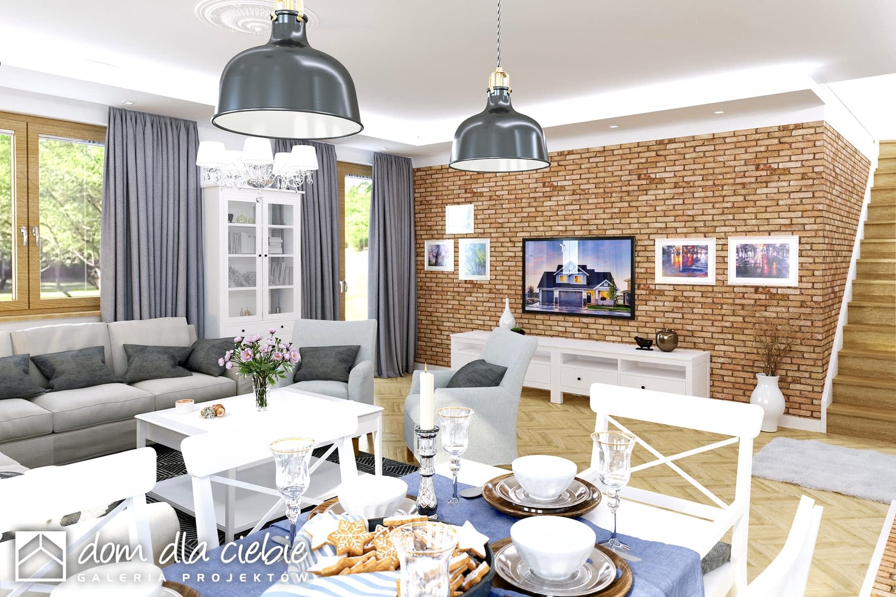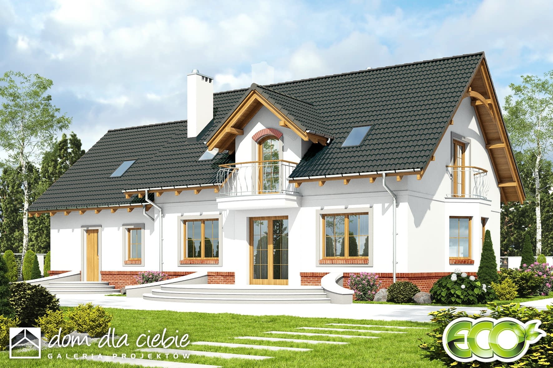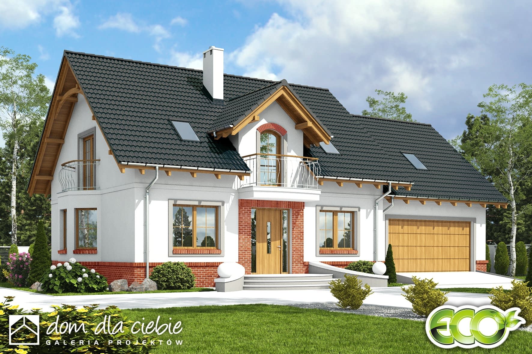 Dom Dla Ciebie 1 w 4 z garażem dwustanowiskowym przeznaczony jest dla 4-6cio ro osobowej rodziny, zaprojektowany jest z zachowaniem podziału na dwie strefy: dzienną na parterze i nocną na poddaszu. Na parterze mamy zaprojektowany wiatrołap, hol, kuchnię, salon z jadalnią i kominkiem oraz pokój usytuowanego od strony ogrodowej, a od frontu zaprojektowano łazienkę z wanną. Poddasze obejmuje trzy ustawne i dobrze doświetlone pokoje, każdy pokój z własnym balkonem. Na poddaszu zaprojektowano ogólnie dostępną łazienkę z narożną wanną i prysznicem. Poddasze zaprojektowane jest pod dwuspadowym dachem na tradycyjnej więźbie i ściance kolankowej. Projekt Dom Dla Ciebie 1 w4, to idealna propozycją domu dla osób poszukujących tradycyjnego domu o stylowej architekturze i przemyślanej funkcji. To dom energooszczędny, ekonomiczny w budowie i w użytkowaniu.