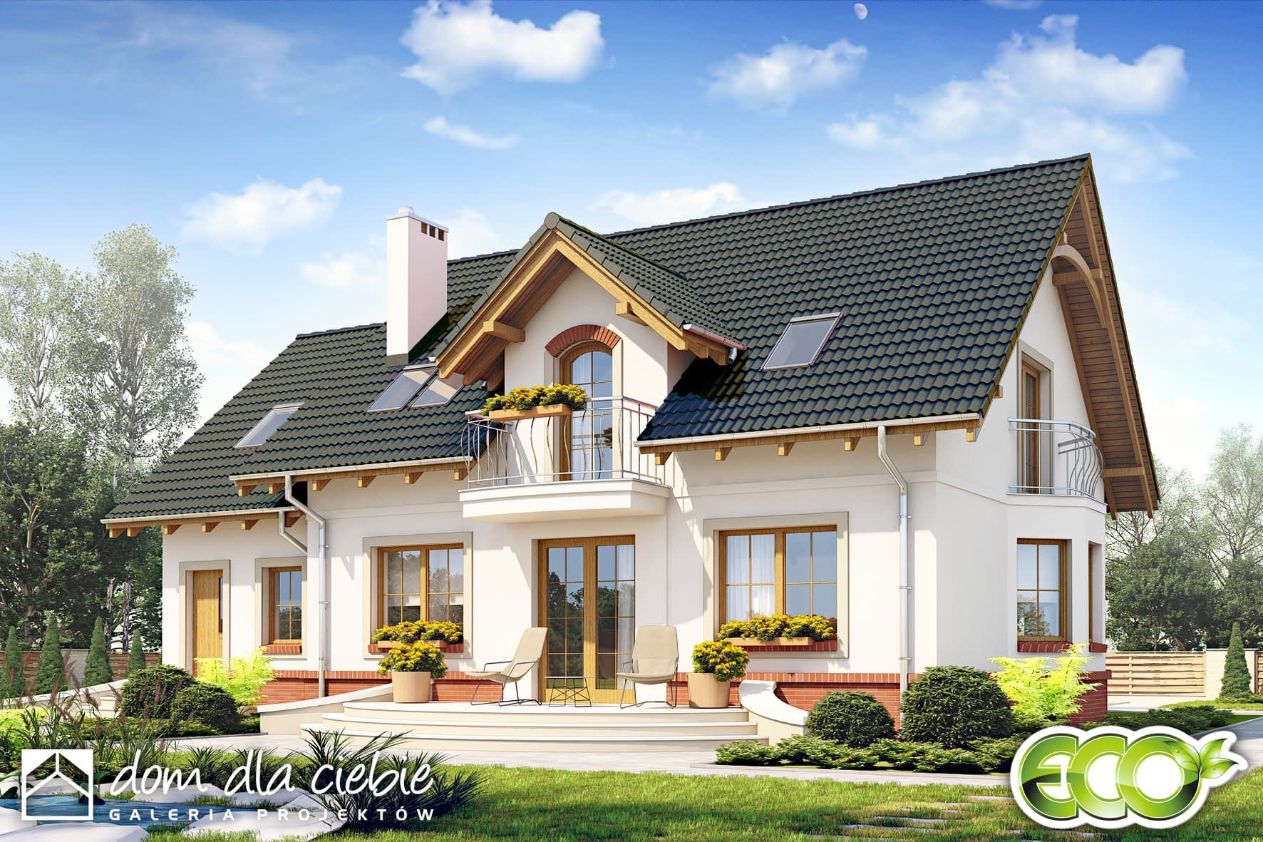 Dom Dla Ciebie 1 w 4 bez garażu przeznaczony jest dla 4 ro osobowej rodziny , zaprojektowany jest z zachowaniem podziału na dwie strefy: dzienną na parterze i nocną na poddaszu. Na parterze mamy zaprojektowany wiatrołap, hol, kuchnię, salon z jadalnią i kominkiem oraz pokój usytuowanego od strony ogrodowej. Od frontu zaprojektowano łazienkę z wanną. Poddasze obejmuje trzy ustawne i dobrze doświetlone pokoje, każdy pokój z własnym balkonem. Na poddaszu zaprojektowano ogólnie dostępną łazienkę z narożną wanną i prysznicem. Poddasze zaprojektowane jest pod dwuspadowym dachem opartym na tradycyjnej więźbie i ściance kolankowej. Projekt Dom Dla Ciebie 1 w4, to idealna propozycją domu dla osób poszukujących tradycyjnego domu o stylowej architekturze i przemyślanej funkcji.