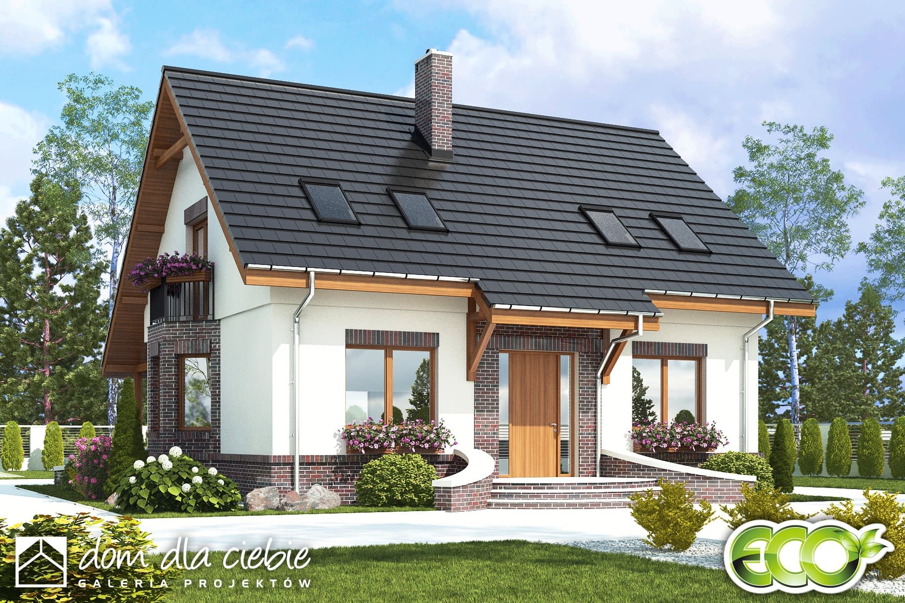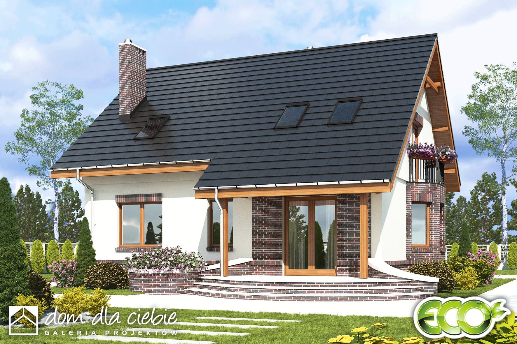 Dom Dla Ciebie 2 w wariancie bez garażu to drugi dom z serii domów stylowych. Jest to projekt uroczego domu z poddaszem użytkowym, przeznaczony dla 4ro osobowej rodziny. Dom zaprojektowany został z zachowaniem podziału na strefy: ogólnie dostępną i prywatną. Na parterze przewidziano strefę ogólnie dostępna i mamy tu wiatrołap z wnękowymi szafami, hol, kuchnię ze spiżarnią, salon z jadalnią i kominkiem oraz pokój od frontu, który może służyć jako gabinet. Mamy tu też niedużą łazienkę z prysznicem oraz kotłownię z pralnią. Na poddasze prowadzą jednobiegowe schody, którymi ostaniemy się do przedpokoju prowadzącego do 3 wygodnych i dobrze oświetlonych pokoi z balkonami. Jest tu także ogólnie dostępną łazienka z narożną wanną i prysznicem. Poddasze wygospodarowano pod dwuspadowym dachem zaprojektowanym na tradycyjnej więźbie dachowej opartej na ściance kolankowej. Projekt domu Dom Dla Ciebie 2, to propozycja domu dla szukających projektu tradycyjnego domu o współczesnej architekturze oraz funkcjonalnym wnętrzu.