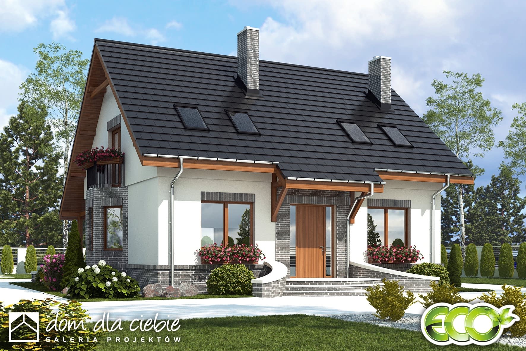Dom Dla Ciebie 2 w2 (wersja 2) w wariancie (B) bez garażu, to projekt atrakcyjnego domu dwukondygnacyjnego - z poddaszem użytkowym. Dom zaprojektowany jest dla 4ro osobowej rodziny z zachowaniem podziału na dwie strefy: dzienną na parterze i nocną na poddaszu. W stosunku do poprzedniej wersji projektu mamy tu przewidziane zmiany funkcji w obrębie parteru. Projekt przewiduje większa kuchnię, większy salon z jadalnią z którego możemy wyjść na zadaszony taras ogrodowy. Ponadto zmieniona została lokalizacja pomieszczeń łazienki i kotłowni - w tej wersji zlokalizowane są od frontu a pokoju zaprojektowany został od strony ogrodu. Poza tymi zmianami reszta pomieszczeń jest podobna, w tym wiatrołap i schody pozostały w zasadzie bez zmian, a hol główny jest obszerniejszy i możemy dostać się nim bezpośrednio do garażu. Poddasze domu obejmuje trzy ustawne i wygodne pokoje sypialne i ogólnie dostępną łazienkę z narożną wanną i prysznicem. Poddasze zaprojektowane jest pod dwuspadowym dachem na tradycyjnej więźbie ze ścianką kolankową. Projekt Dom Dla Ciebie 2 w2 bez garażu, to idealna propozycją domu dla osób poszukujących ekonomicznego w budowie i energooszczędnego domu o stylowej, współczesnej architekturze i przemyślanej funkcji.