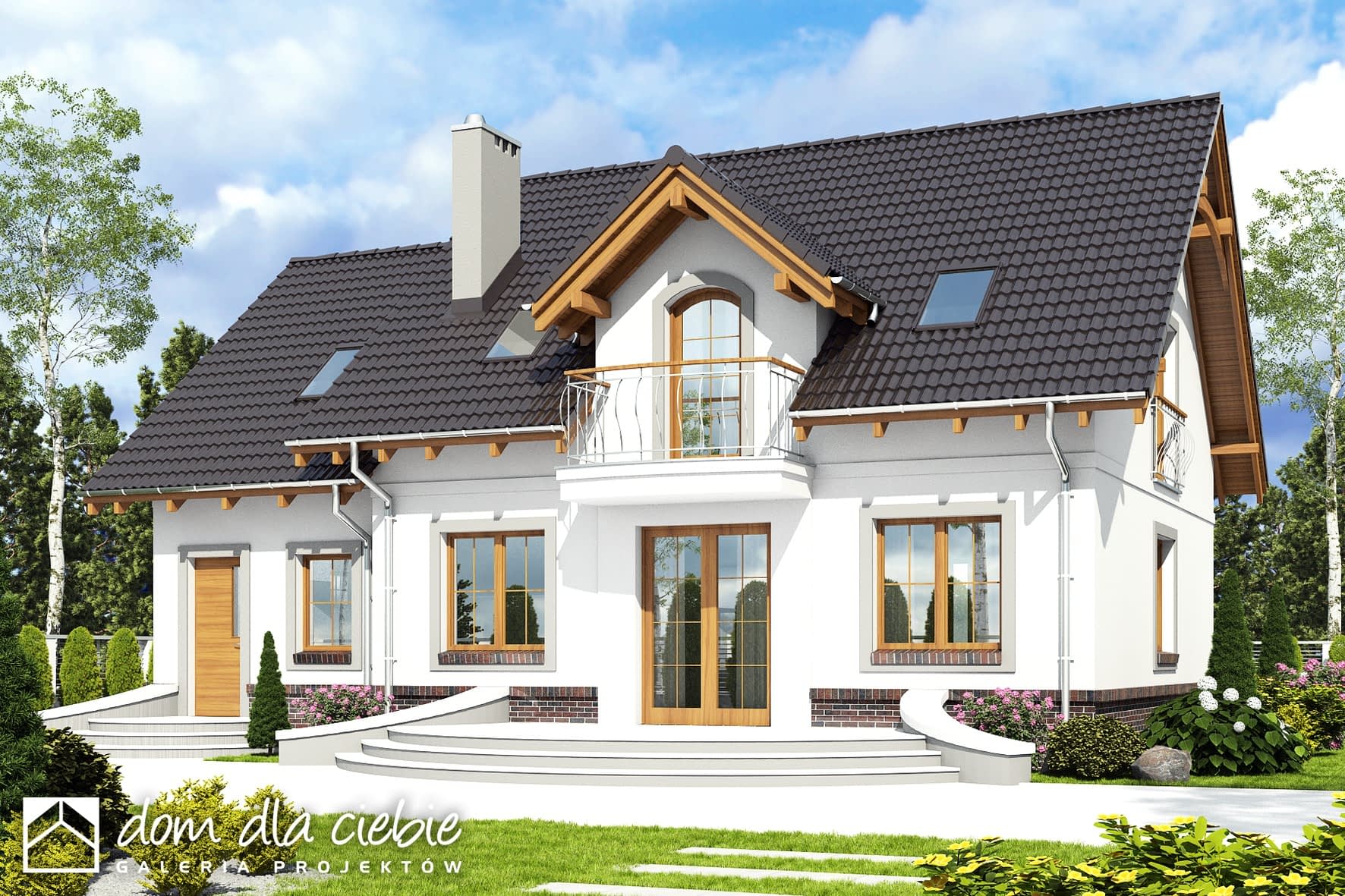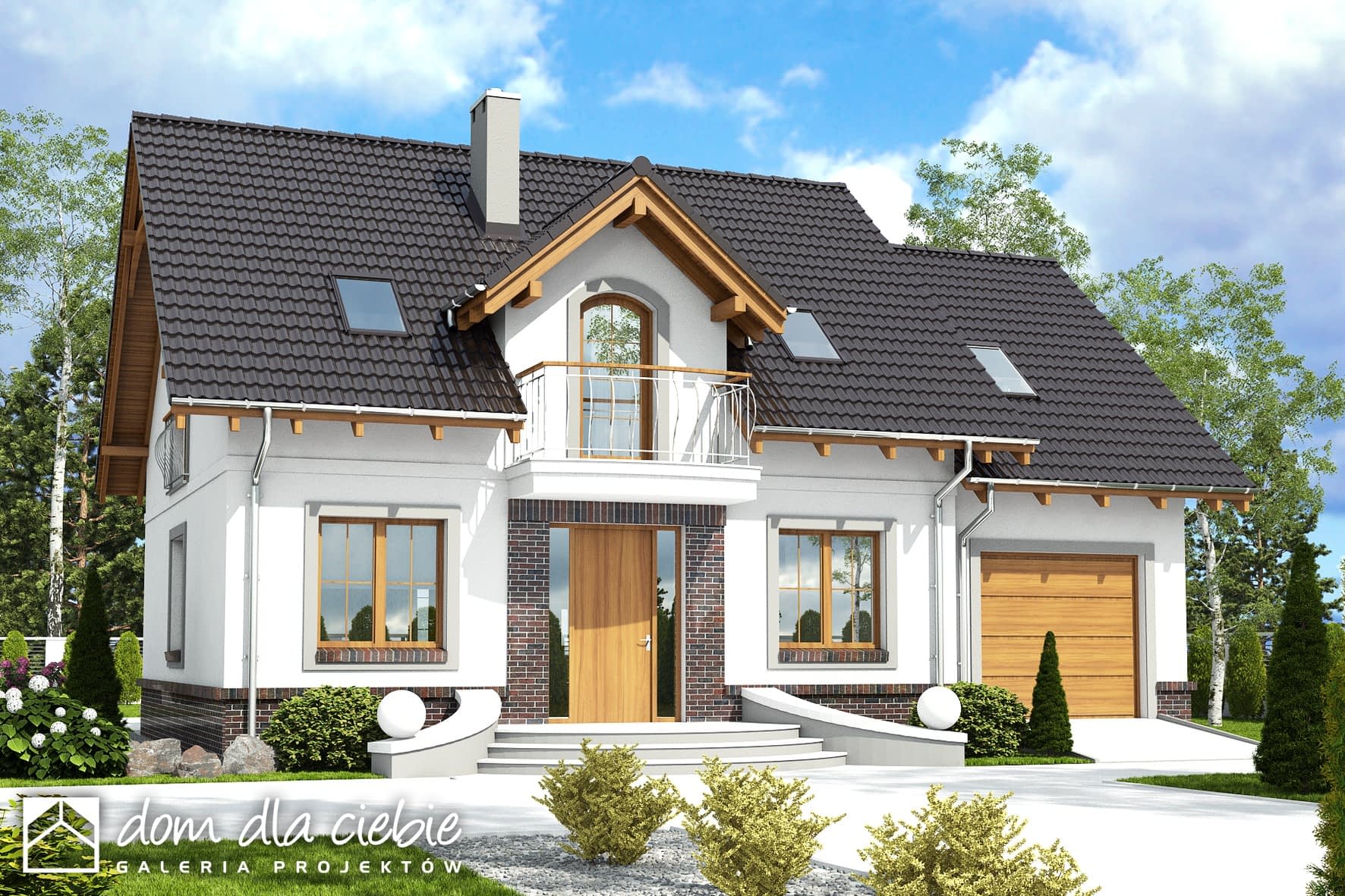 Dom Dla Ciebie 5 z garażem jednostanowiskowym bez wykuszu to mniejsza wersja popularnego projektu Dom Dla Ciebie 1. Dom Dla Ciebie 5 to projekt domu o popularnej powierzchni użytkowej około 110 m2. To projekt z użytkowym poddaszem, o tradycyjnej więźbie drewnianej ze ścianką kolankową o wysokości około 1m. Przeznaczony jest dla 4ro osobowej rodziny i tak jak pozostałe projekty z tej serii zaprojektowany został z zachowaniem podziału na dwie strefy: ogólnie dostępną i prywatną. Strefa ogólnie dostępna przewidziana jest na parterze. Mamy tu wiatrołap z wnękowymi szafami, hol, kuchnię ze spiżarnią, salon z jadalnią i kominkiem oraz pokój od frontu, który może służyć jako gabinet. Ponadto jest tu nieduża łazienka z prysznicem oraz przechodnia pralnia z której dostaniemy się do garażu. Za Garażem, od strony ogrodu zaprojektowana jest kotłownia, która dodatkowo może spełnić funkcję pomieszczenia gospodarczego. Na poddasze prowadzą jednobiegowe schody, którymi ostaniemy się do przedpokoju prowadzącego do 3 wygodnych i dobrze oświetlonych pokoi z balkonami. Bezpośrednio ze schodów mozemy się dostać do nieużytkowego strychu, który z łatwością możemy zaadaptować na cele mieszkaniowe. Na poddaszu jest też przewidziana ogólnie dostępną łazienka z narożną wanną i prysznicem. Projekt domu Dom Dla Ciebie 5, to propozycja dla szukających projektu domu tradycyjnego o stylowej architekturze, funkcjonalnym wnętrzu i o energooszczędnych parametrach.