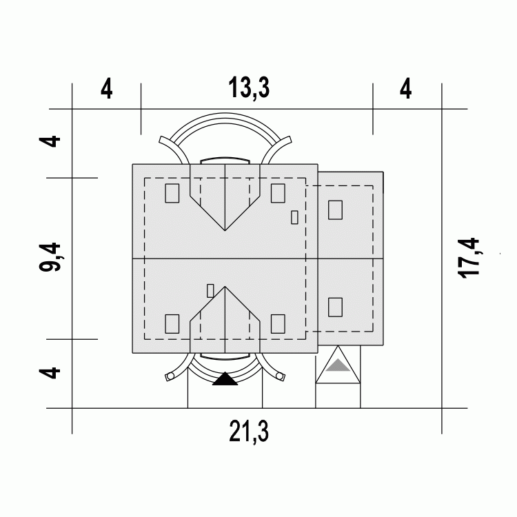 - Minimalne wymiary działki17.4 x 21.3m