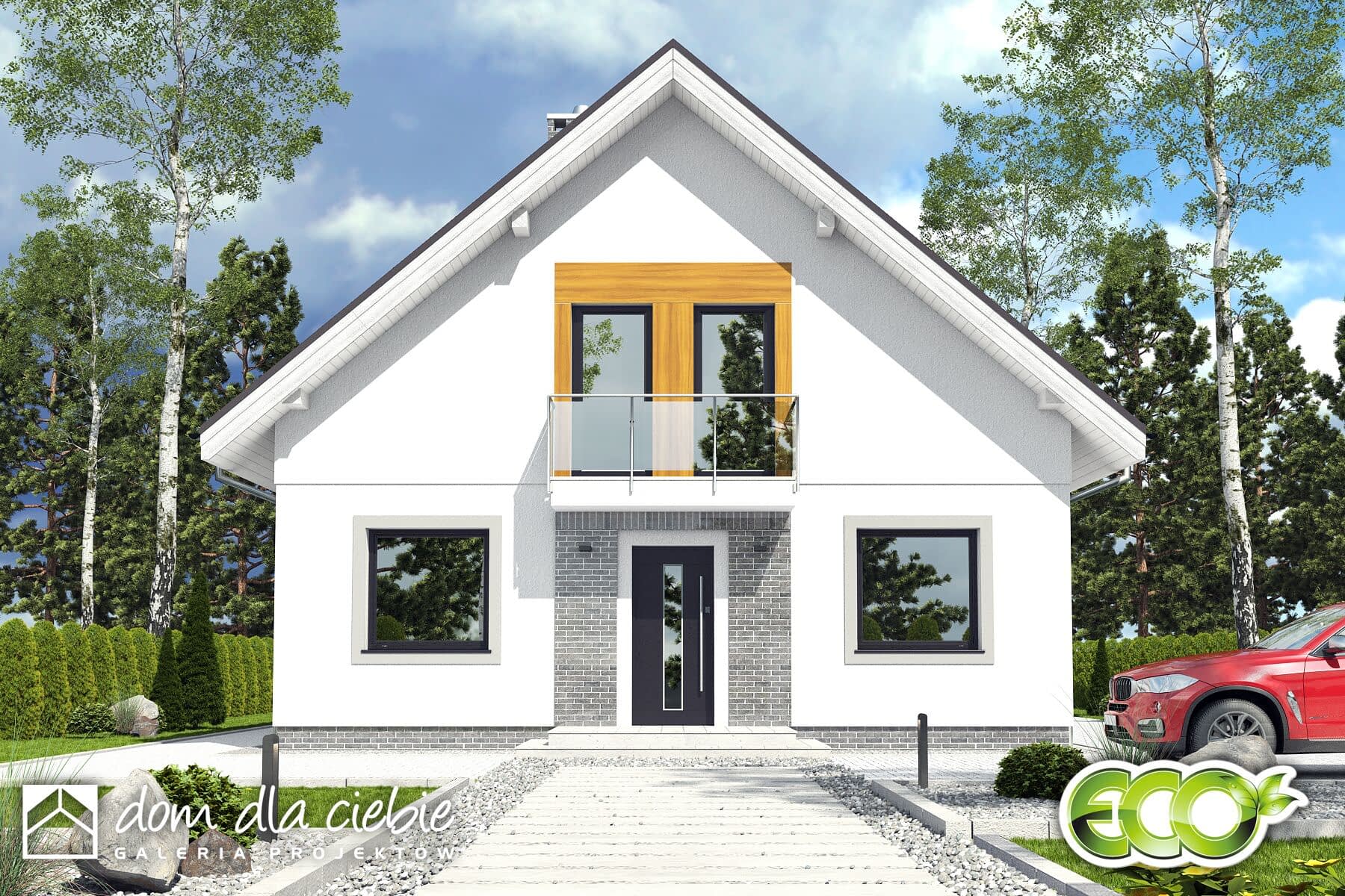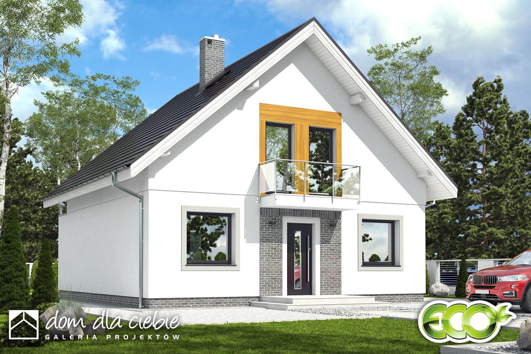Dom Dla Ciebie 6 to projekt domu z użytkowym poddaszem dla 4-5cio osobowej rodziny. To propozycja domu o często wyszukiwanej powierzchni użytkowej około 110 m2. Tak jak pozostałe projekty z tej serii, Dom Dla Ciebie 6 zaprojektowany został z zachowaniem podziału na dwie strefy użytkowe ogólnie dostępną na parterze i prywatną na poddaszu. Na parterze mamy zaprojektowany wiatrołap z szafą wnękową, hol, kuchnię ze spiżarnią, salon z jadalnią i kominkiem oraz pokój zlokalizowany od frontu domu, do wykorzystania jako gabinet. Przy schodach prowadzących na poddasze, zlokalizowano kotłownię z pralnią i wygodna łazienkę. Na poddaszu mamy zaprojektowane trzy ustawne i dobrze doświetlone pokoje - każdy z własnym balkonem. Zaprojektowano tu też niewielki strych z możliwością wykorzystania go na garderobę oraz ogólnie dostępną łazienka z pełnym wyposażeniem. Poddasze zaprojektowane jest pod dwuspadowym dachem zaprojektowanym na tradycyjnej więźbie dachowej opartej na ściance kolankowej o wysokości około 1m. Projekt domu Dom Dla Ciebie 6, jest idealna propozycja domu energooszczędnego, taniego w budowie i w użytkowaniu. Ogromna zaletą projektu jest prosta konstrukcja domu i dobrze zaprojektowana funkcja.