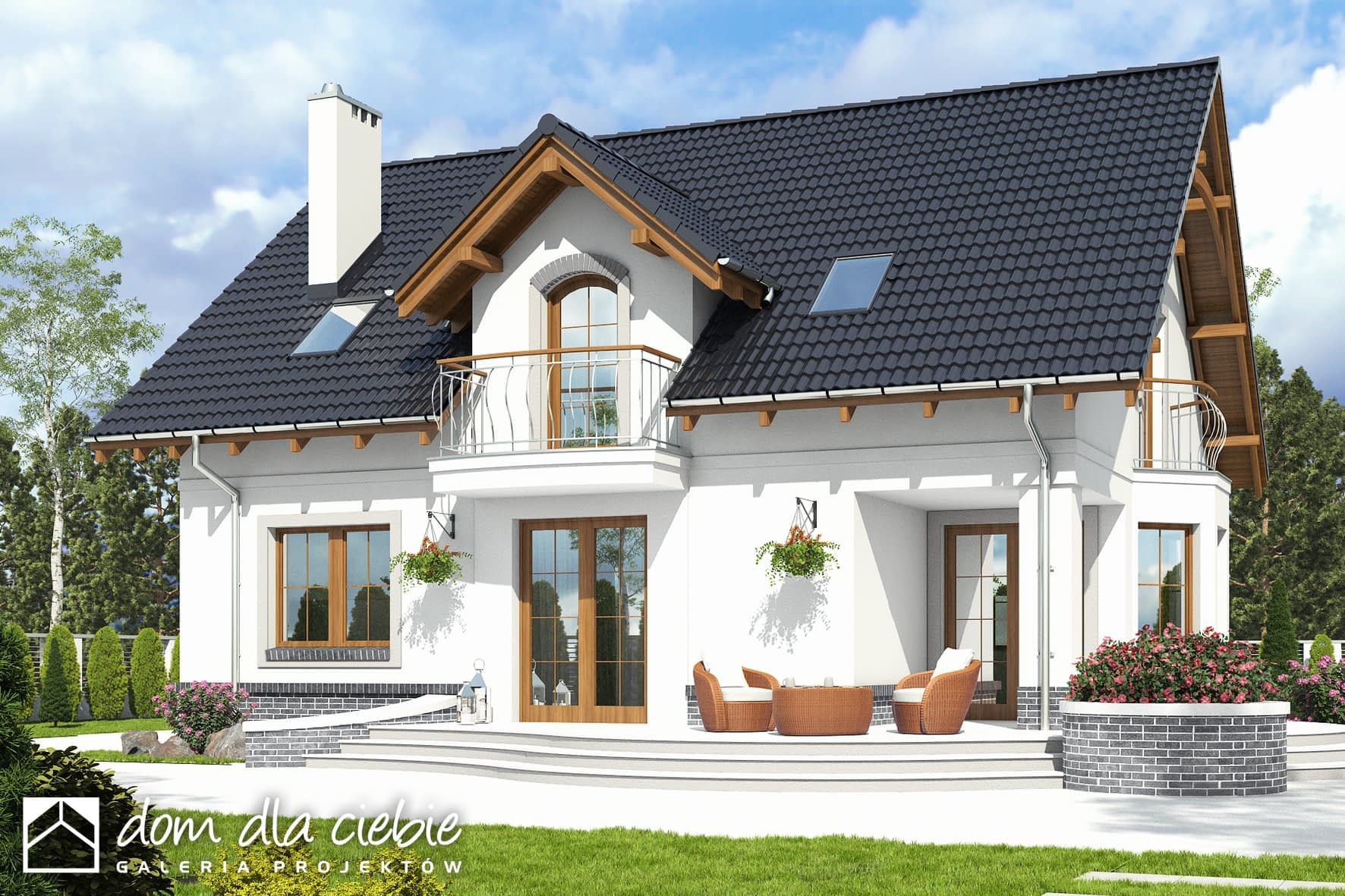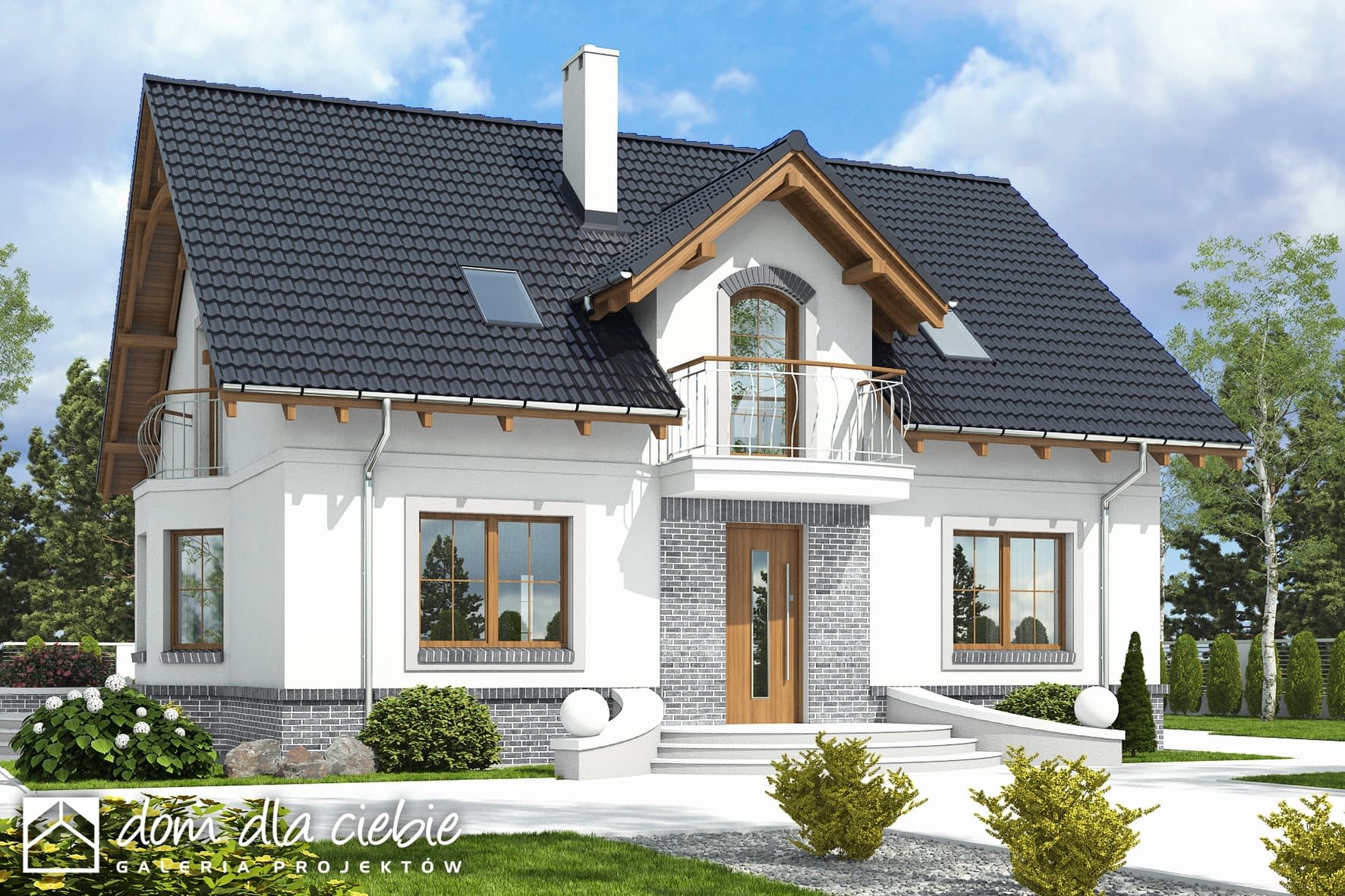 Dom Dla Ciebie 7 bez garażu to większa - poszerzona wersja popularnego projektu Dom Dla Ciebie 1, z podcieniem dostępnym z jadalni. Dom Dla Ciebie 7 to projekt domu o popularnej po,. To projekt z użytkowym poddaszem, o tradycyjnej więźbie drewnianej ze ścianką kolankową o wysokości około 1m. Przeznaczony jest dla 4ro osobowej rodziny i tak jak pozostałe projekty z tej serii zaprojektowany został z zachowaniem podziału na dwie strefy: ogólnie dostępną i prywatną. Strefa ogólnie dostępna przewidziana jest na parterze. Mamy tu zaprojektowany wiatrołap z wnękowymi szafami, hol, kuchnię ze spiżarnią, salon z kominkiem, jadalnię z wyjściem na ogród, oraz pokój od frontu, który może służyć jako gabinet. Ponadto jest tu nieduża łazienka z prysznicem oraz kotłownia. Na poddasze prowadzą jednobiegowe schody, którymi dostaniemy się do przedpokoju prowadzącego do trzech wygodnych i dobrze oświetlonych pokoi z balkonami. Dwa z tych pokoi posiadają wygodne garderoby. Na poddaszu jest też przewidziana ogólnie dostępną łazienka z narożną wanną i prysznicem. Projekt domu Dom Dla Ciebie 7, to propozycja dla szukających projektu domu tradycyjnego o stylowej architekturze, funkcjonalnym wnętrzu i o energooszczędnych parametrach.