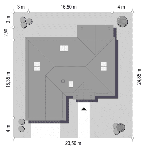 - Minimalne wymiary działki24.85 x 23.5m
