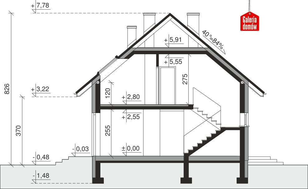 Dach: kąt nachylenia 40°, pokrycie - dachówka ceramiczna lub betonowa.