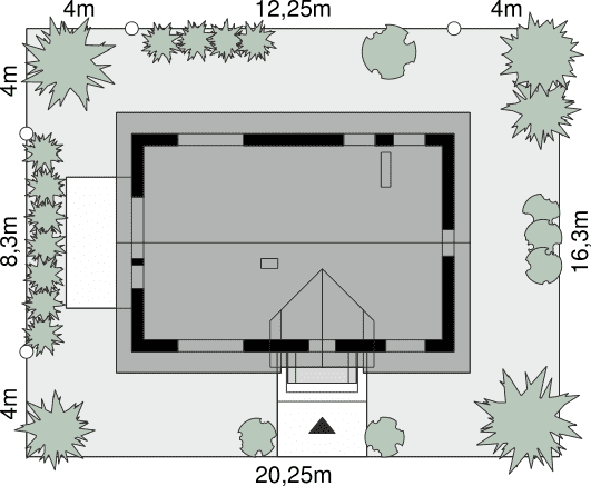 - Minimalne wymiary działki20.25 x 16.3m