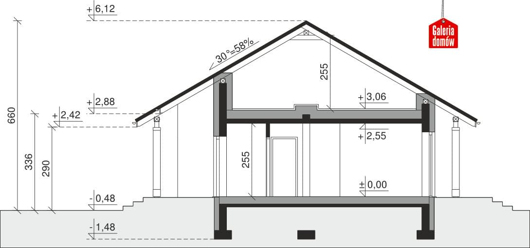Dach: kąt nachylenia 30°, pokrycie - dachówka ceramiczna lub betonowa.