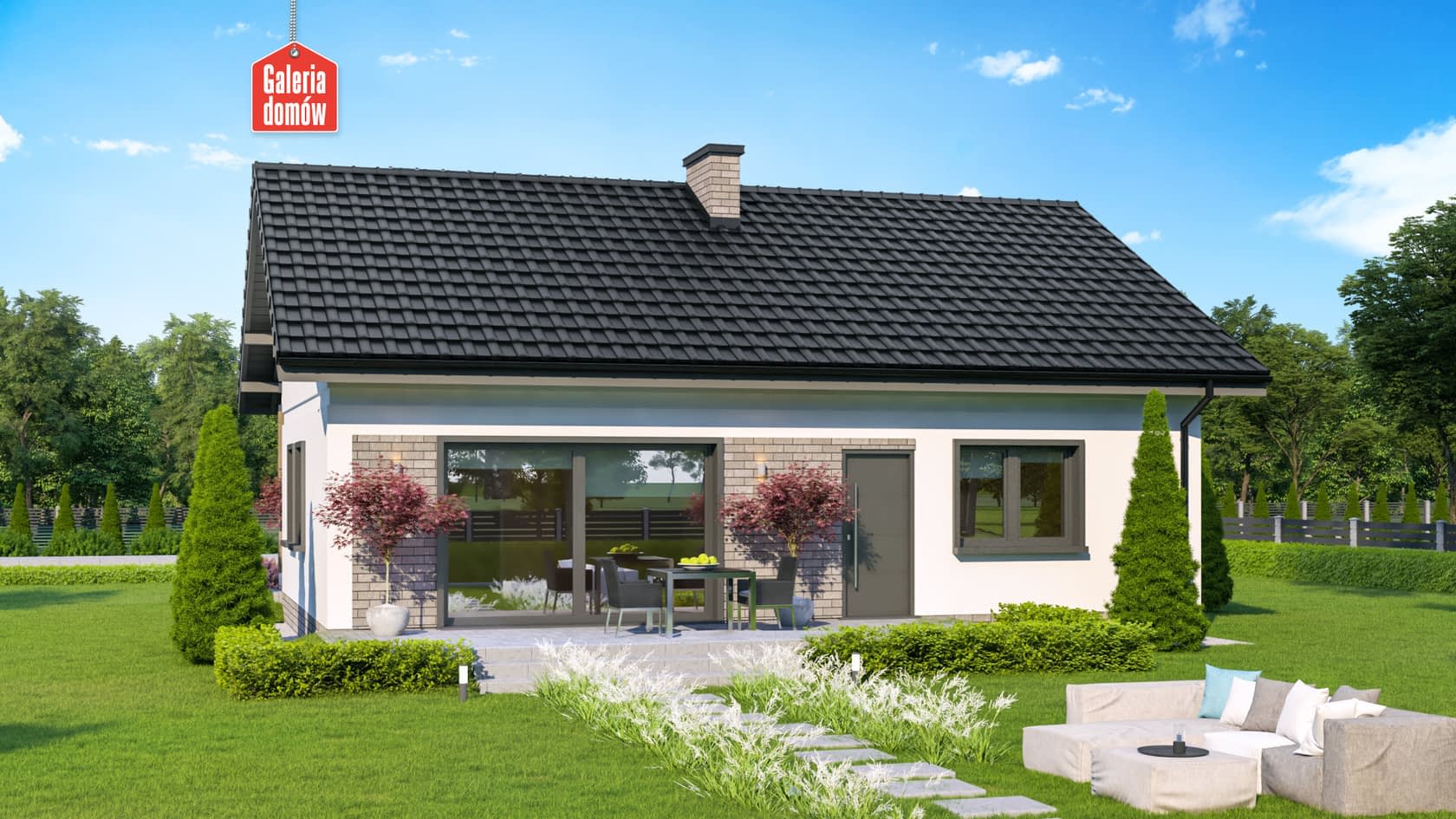 Energooszczędny dom parterowy o powierzchni użytkowej 76,02 m², wyposażony w system instalacji solarnej i wentylację mechaniczną z odzyskiem ciepła. Minimalizm w ilości ścian nośnych sprawia, iż dom jest tani i szybki w budowie. Otwarta strefa dzienna składa się ze słonecznego pokoju o powierzchni 21,14 m², z kominkiem i otwartej kuchni (9,12m²) połączonej z jadalnią. Zielona sfera ogrodu dostępna jest w całej okazałości dzięki drzwiom przesuwnym. Część wypoczynkowa domu to dwie sypialnie i kompletnie wyposażona łazienka. Kotłownia została zaprojektowana tak, by pomieściła pralnię i była wielofunkcyjnym miejscem, w którym można magazynować ogrodowe meble (drzwi na zewnątrz). Solidny strop pozwala na zagospodarowanie dużego strychu według indywidualnego uznania. Dom przy Bukowej 15 to interesujące rozwiązanie, które zainteresuje inwestorów chcących tanio i szybko wybudować elegancki, parterowy dom. Doskonała propozycja dla 4-5 osobowej rodziny.Konstrukcja