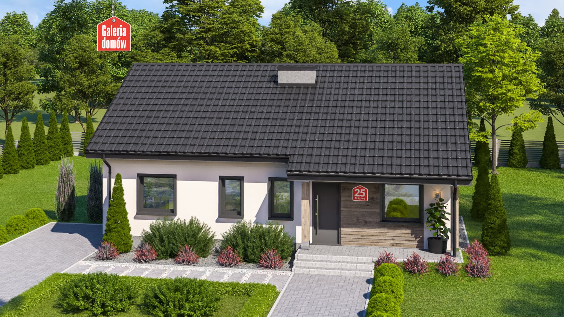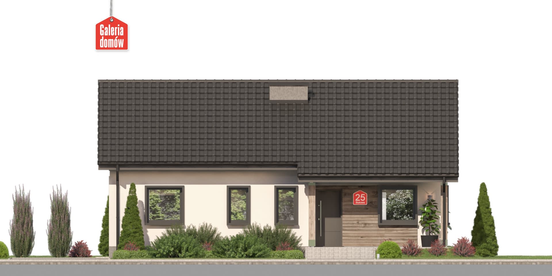 Dom przy Bukowej 25 zaprojektowano w technologii murowanej z więźbą drewnianą. Powierzchnia użytkowa budynku wynosi 86,93 m². Układ funkcjonalny przewiduje 3 pokoje, łazienkę, dodatkową toaletę oraz kotłownię, z miejscem na pralnie. W domu zaprojektowano zadaszone wejście oraz taras, ulokowany z tyłu budynku. Wnętrze jest bardzo dobrze doświetlone, dzięki licznym przeszkleniom. Na styku salonu i jadalni ulokowano jadalnię z dużym, rodzinnym stołem. Kominek został umieszczony centralnie, tak by ogrzewał zarówno kuchnię, jak i pokój dzienny. W dużej łazience przewidziano wannę, prysznic, podwójną umywalkę, sedes i bidet. Dodatkowo do dyspozycji mieszkańców oddano toaletę. W kotłowni znalazło się miejsce na pralkę i umywalkę. Dom posiada dach nachylony pod kątem 30 stopni, co pozwala myśleć o adaptacji. Ciekawy wariant dla 4-5 osobowej rodziny.Konstrukcja