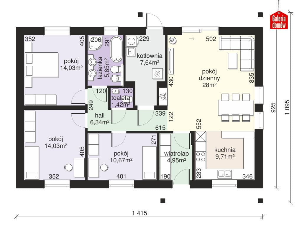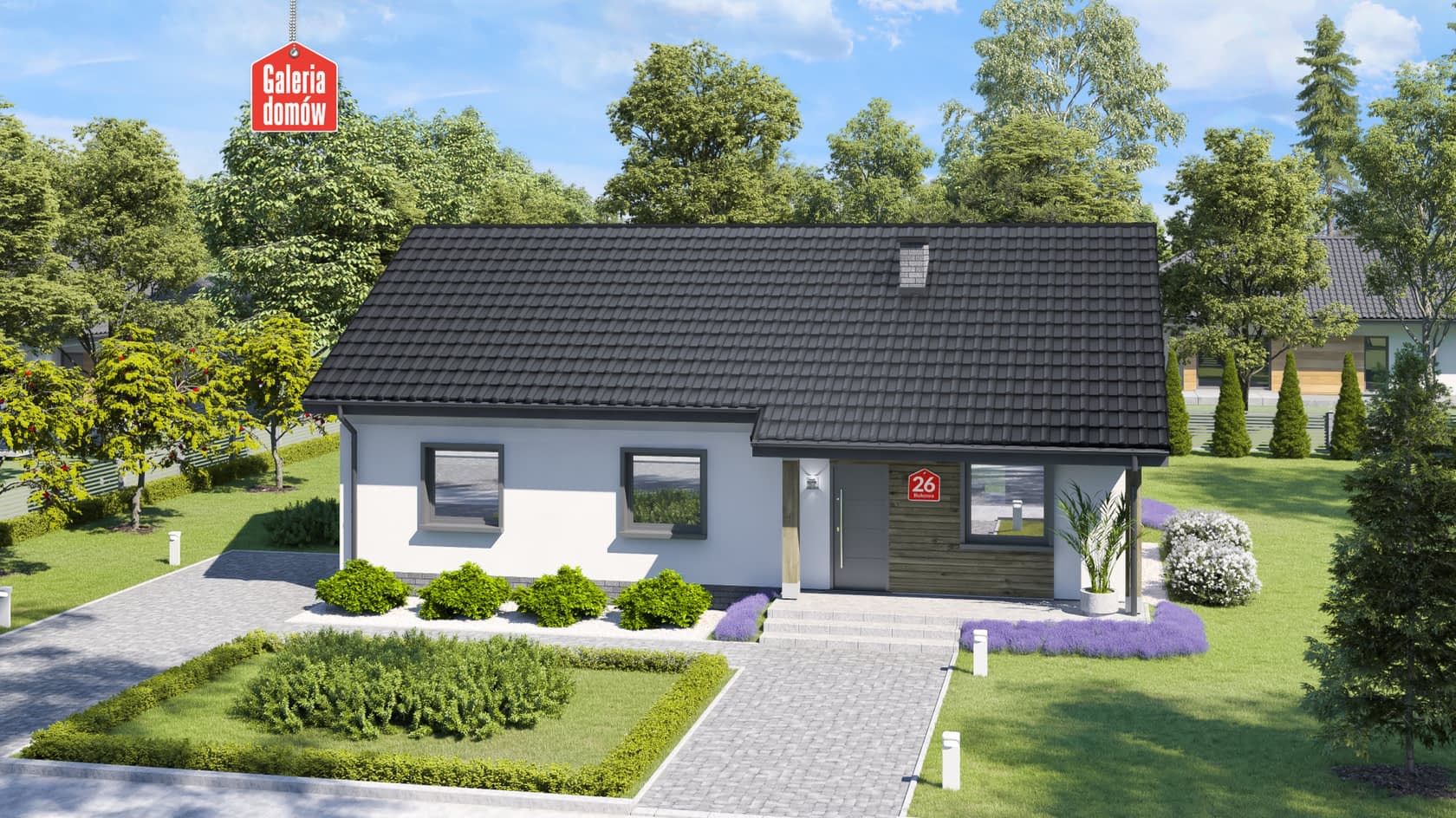 Dom przy Bukowej 26 to budynek parterowy o powierzchni użytkowej 95 m². Łatwy w budowie i oszczędny w realizacji. Pozwala na budowę na niewielkiej działce. Układ funkcjonalny przewiduje 3 pokoje, otwartą kuchnię, salon, łazienkę, toaletę, oraz kotłownię z miejscem na pralnię. Elewację wykonano w nowoczesnej stylistyce, przy użyciu modnych dodatków. Drewniana okładzina i czarno-biała kolorystyka to najmodniejszy obecnie design wykorzystywany w architekturze. Projekt został przygotowany w oparciu o warunki techniczne na 2021 rok. Posiada aktualną charakterystykę energetyczną. Bukowa 26 to budynek energooszczędny i tani w użytkowaniu. Parterowy raj dla 4-5 osobowej rodziny.Konstrukcja