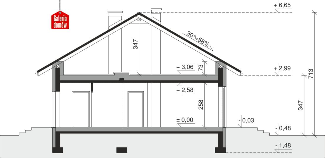 Dach: kąt nachylenia 30°, pokrycie - dachówka ceramiczna lub betonowa.