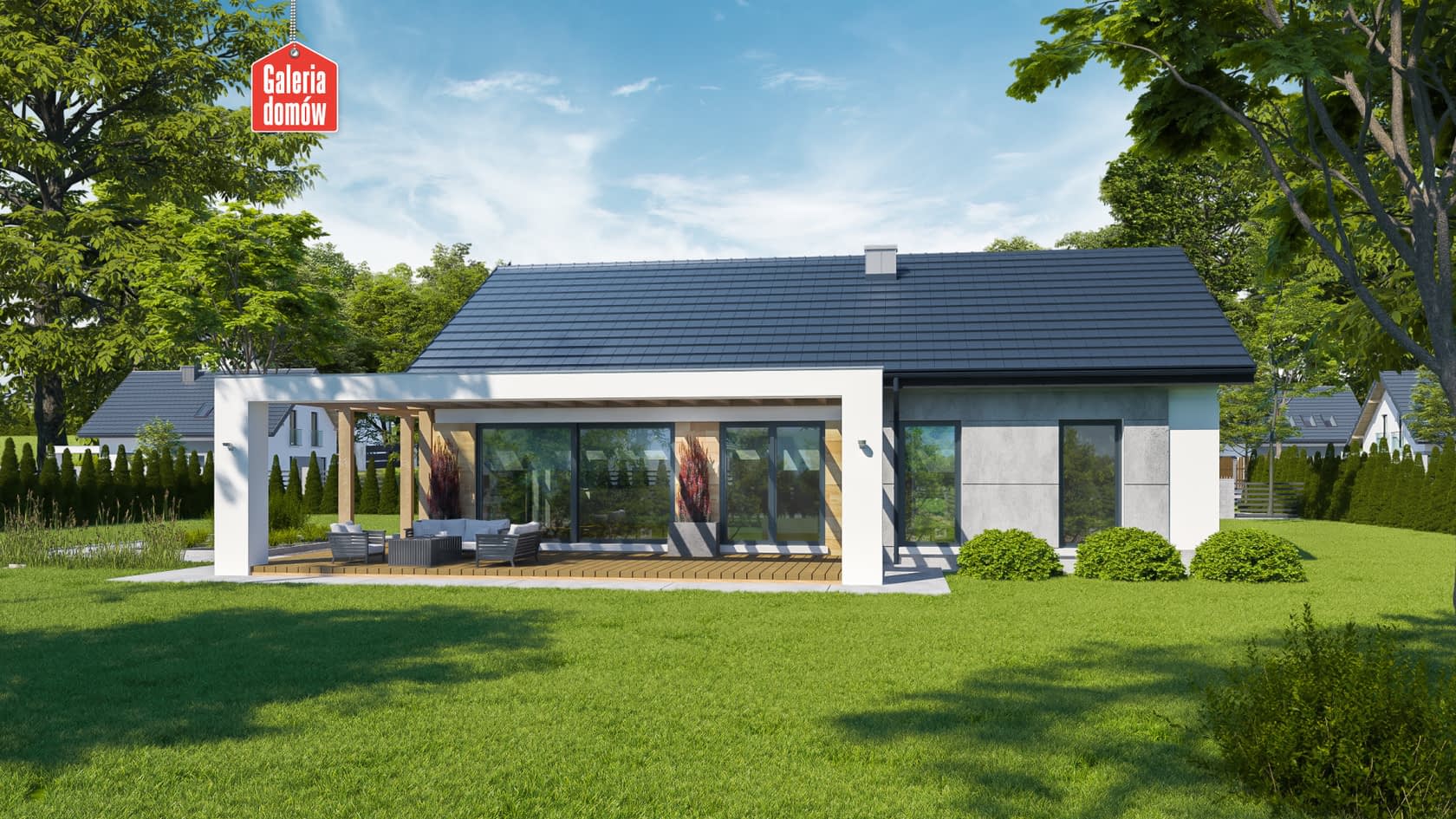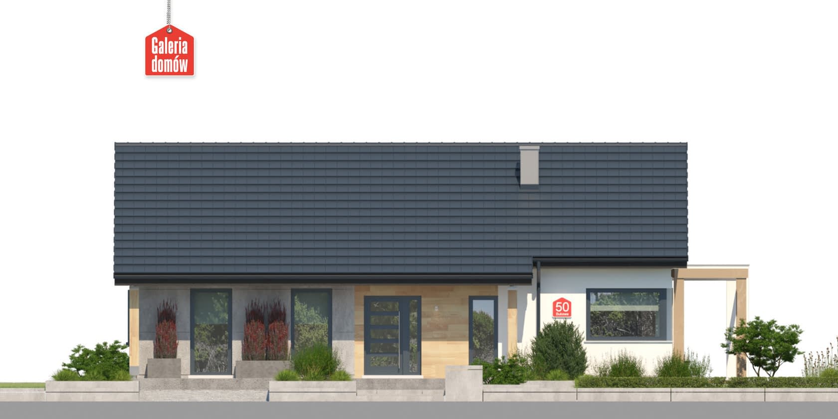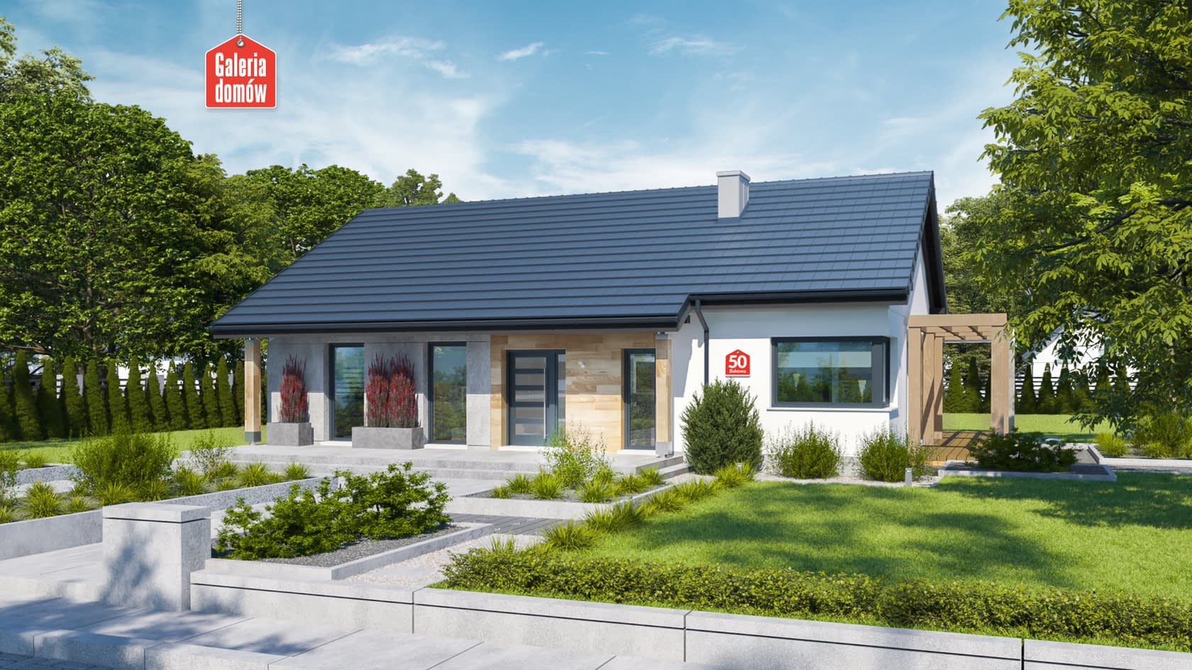 Dom przy Bukowej 50 do nowoczesny projekt domu parterowego bez garażu. Powierzchnia użytkowa wynosi 100 m². Wykonany w technologii tradycyjnej, murowanej i dostosowany do warunków technicznych 2021. Wnętrze mieści słoneczną część dzienną (salon+kuchnia) oraz 4 sypialnie, łazienkę i dodatkową toaletę. W projekcie przewidziano sporą kotłownię, z miejscem na pralnię. Elewacja budynku, wykonana z wykorzystaniem naturalnego drewna i betonu dekoracyjnego oddaje modny i ceniony styl we współczesnej architekturze. Projekt, dzięki przemyślanej konstrukcji, jest tani w budowie oraz ekonomiczny w użytkowaniu. Doskonały wariant dla 4-5 osobowej rodziny.Konstrukcja