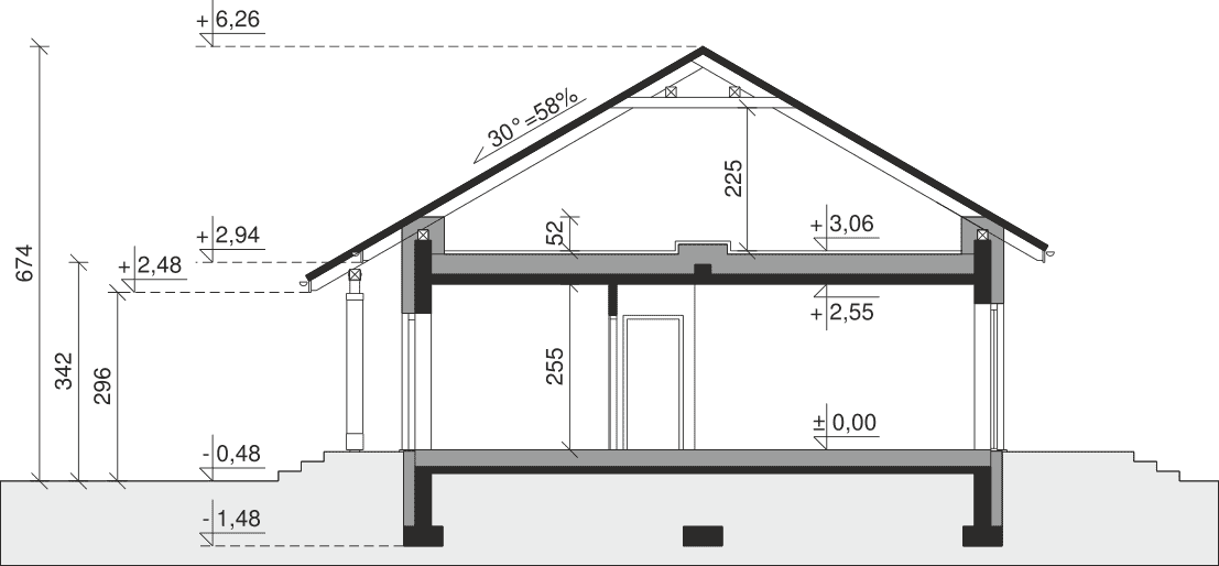 Dach: kąt nachylenia 30°, pokrycie - dachówka ceramiczna lub betonowa.