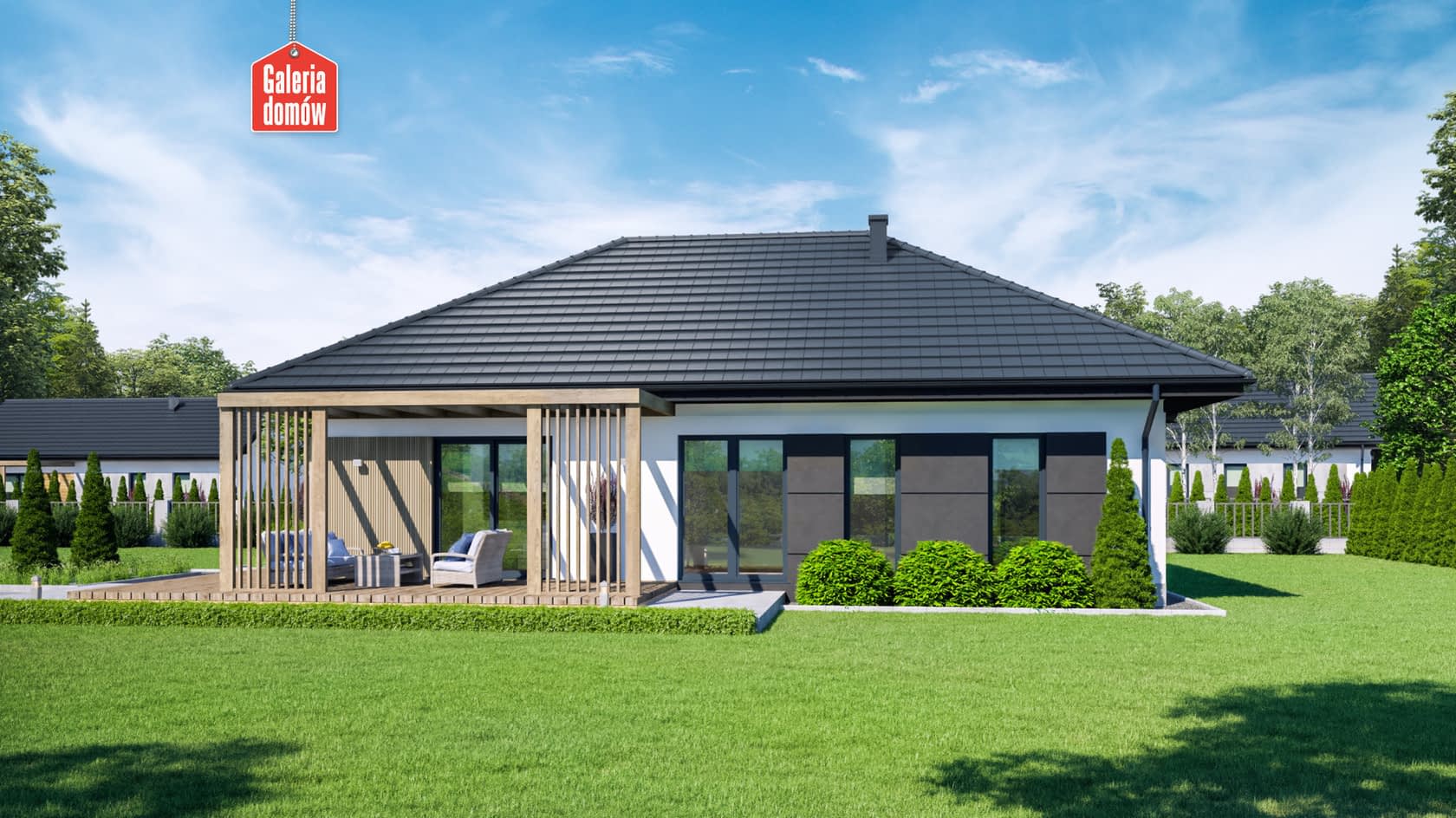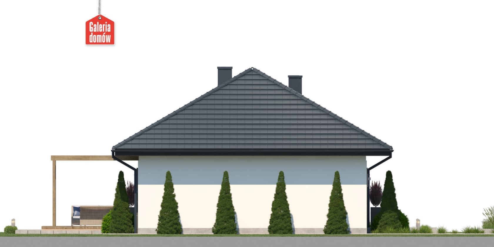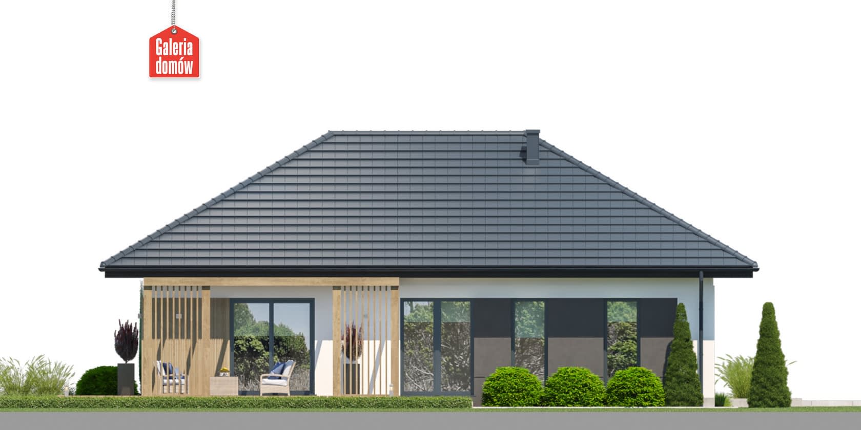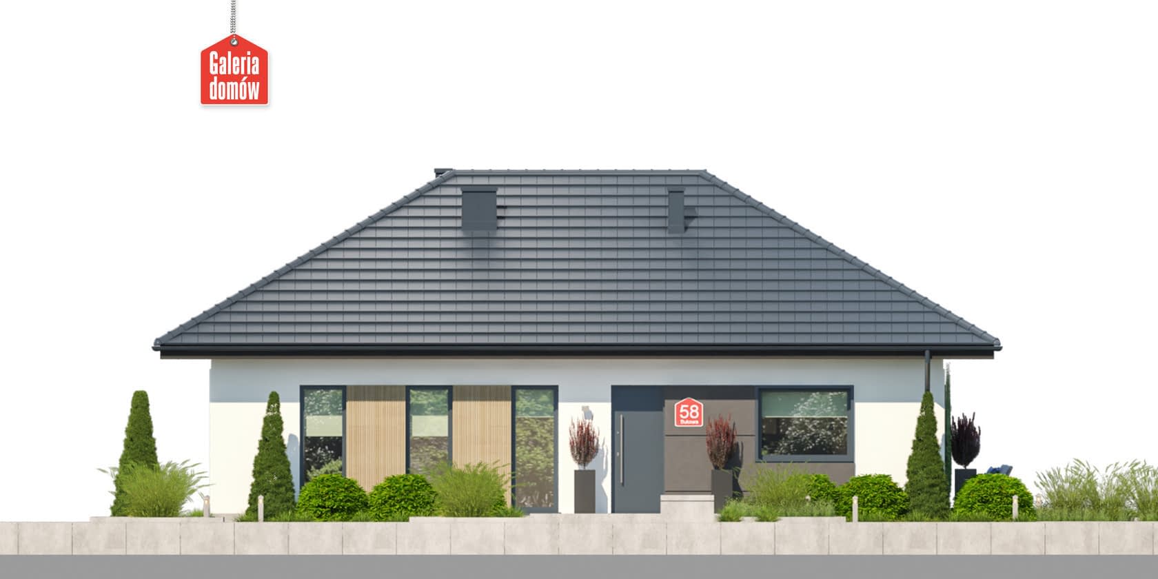 Dom przy Bukowej 58 to budynek parterowy o powierzchni użytkowej 95 m². Projekt domu łatwego w budowie i oszczędnego w użytkowaniu. Dobry wybór dla inwestycji na niewielkich działkach. Dach czterospadowy o symetrycznych połaciach i kalenicy równoległej do drogi. Wnętrze mieści 3 pokoje, otwartą kuchnię, salon, 2 łazienki, garderobę, oraz kotłownię z miejscem na pralnię. Elewację wykonano w nowoczesnej stylistyce, przy użyciu wysokiej jakości materiałów. Czarna dachówka, stolarka okienna w kolorze stalowym, drewniana okładzina elewacyjna oraz dekoracyjny kamień to najlepsze wzorce we współczesnej architekturze domów jednorodzinnych. Bukowa 58 została zaprojektowana w oparciu o warunki techniczne WT 2021. Dom przy Bukowej 45 posiada dodatkowe projekty wentylacji mechanicznej z rekuperacją oraz instalację fotowoltaiczną i solarną. Projekt został opracowany w taki sposób, by mógł spełnić planowane wymagania dotyczące budynków zeroemisyjnych. Prosty i tani w budowie projekt domu dla 4-5 osobowej rodziny.Konstrukcja