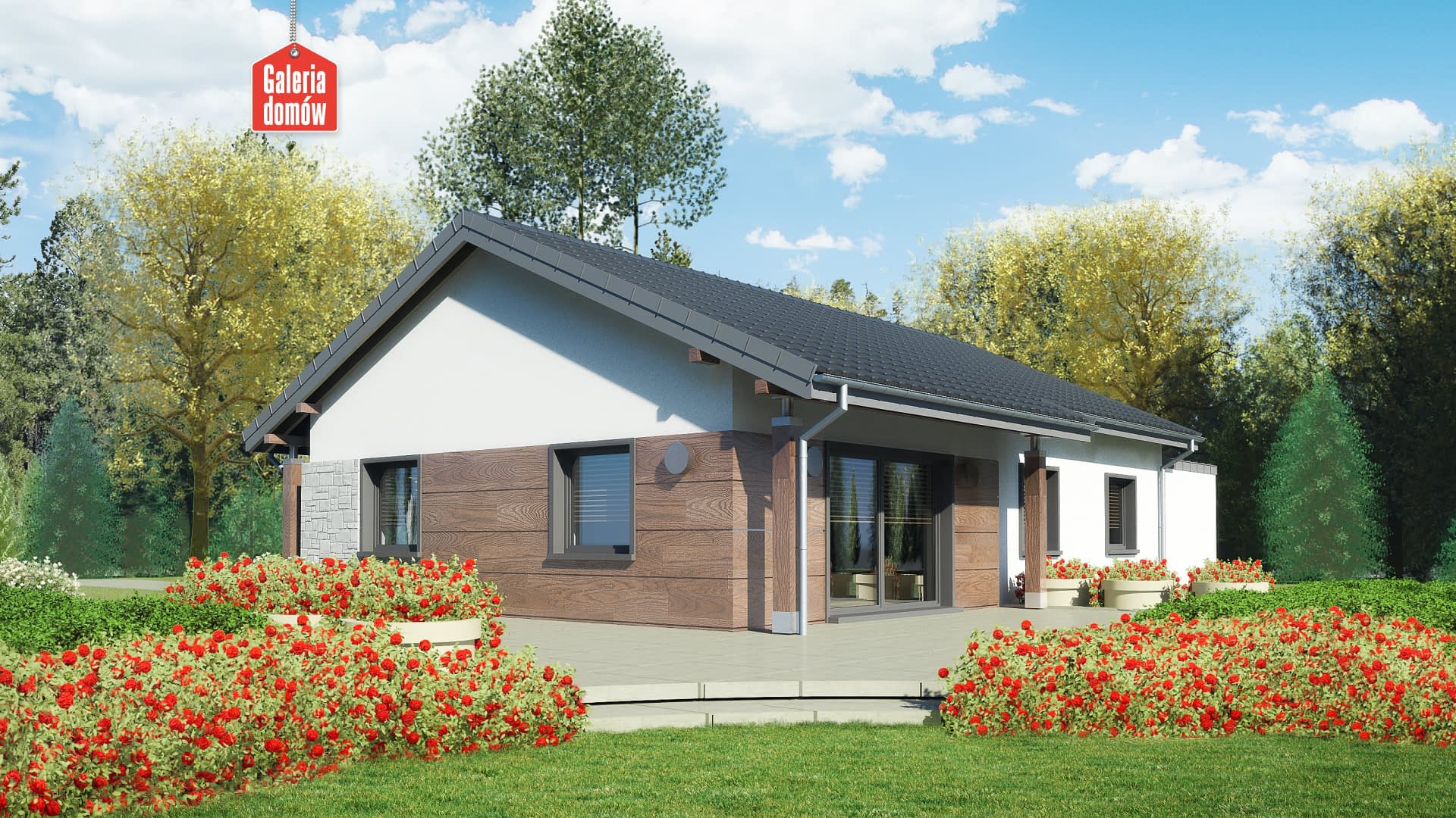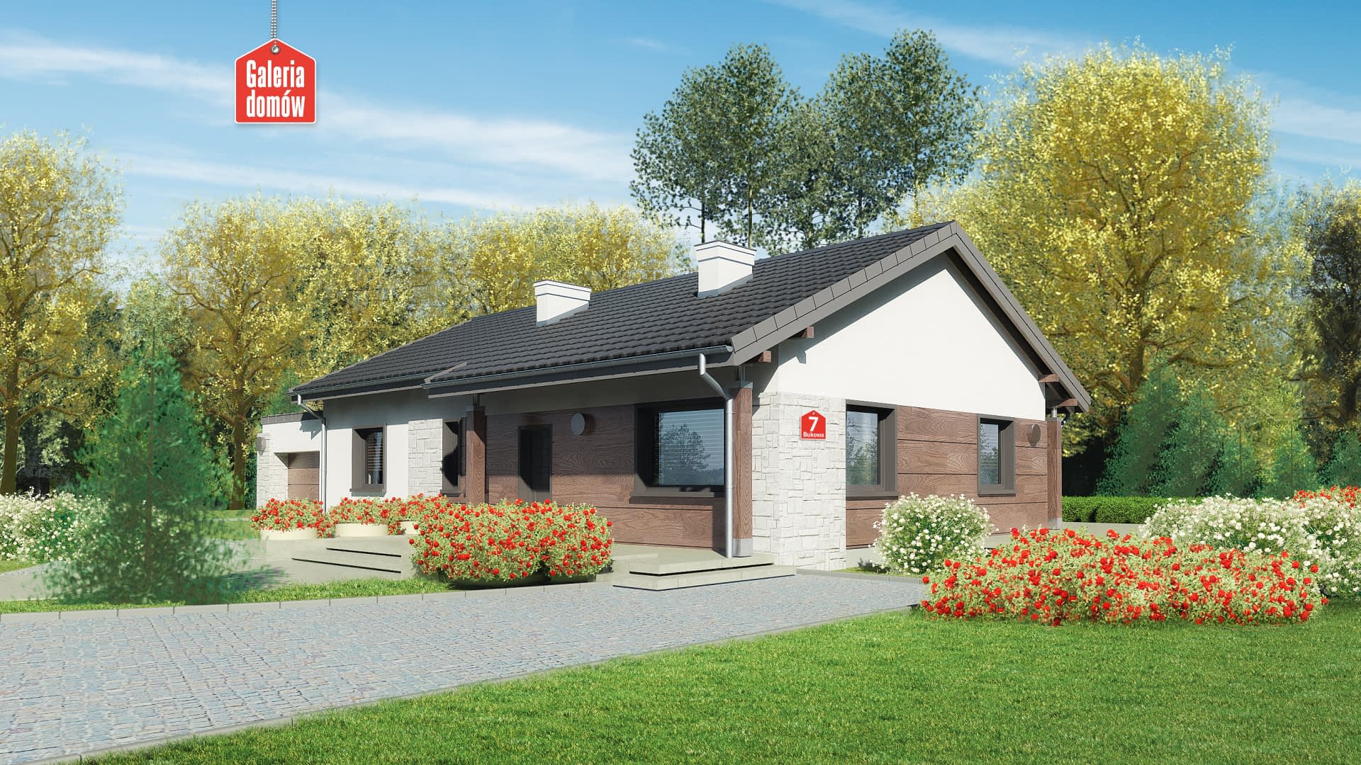 Dom przy Bukowej 7 jest gotowym projektem energooszczędnego domu parterowego z jednostanowiskowym garażem. Wykonany w technologii tradycyjnej, murowanej i dostosowany do najnowszych warunków technicznych. Układ funkcjonalny przewiduje otwartą, słoneczną część dzienną, na którą składa się salon i kuchnia. Centralnie ulokowany kominek i spora spiżarnia to atuty tej przyjaznej przestrzeni. Bukowa 7 posiada ponadto 3 sypialnie, pralnie, wygodną łazienkę i dodatkową toaletę. Za jednostanowiskowym garażem ulokowano kotłownię. Pomieszczenie łączące wnętrze domu z garażem idealnie nadaje się na garderobę potrzebną w każdym domu. Wykończenie elewacji nawiązuje do skandynawskiego stylu. Naturalne drewno, kamień i stonowane kolory to aktualnie najbardziej modny trend w architekturze. Projekt, dzięki przemyślanej konstrukcji, jest szybki i tani w budowie oraz ekonomiczny w użytkowaniu. Doskonały wariant dla 4-5 osobowej rodziny.Konstrukcja