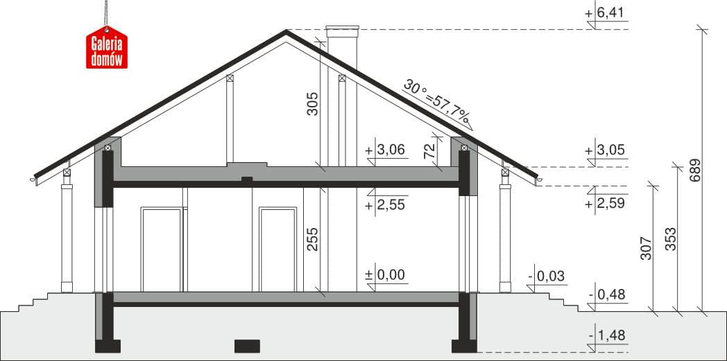 Dach: kąt nachylenia 30°, pokrycie - dachówka ceramiczna lub betonowa.