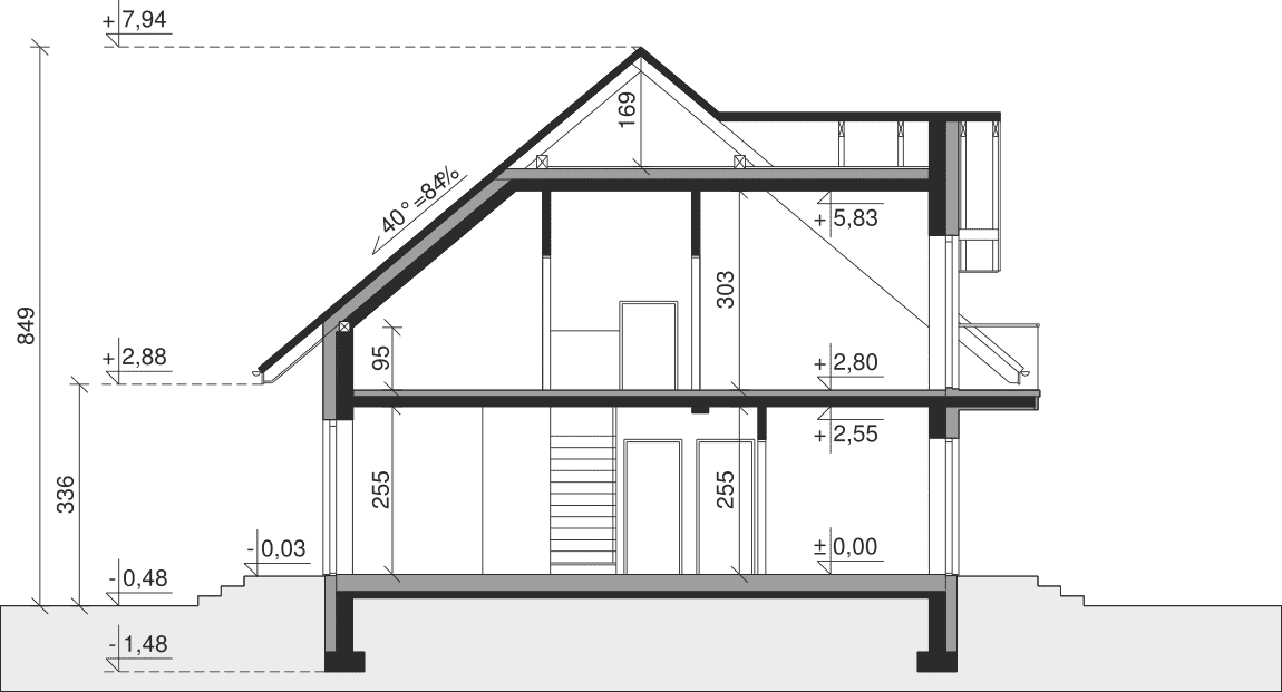 Dach: kąt nachylenia 40°, pokrycie - dachówka ceramiczna lub betonowa.